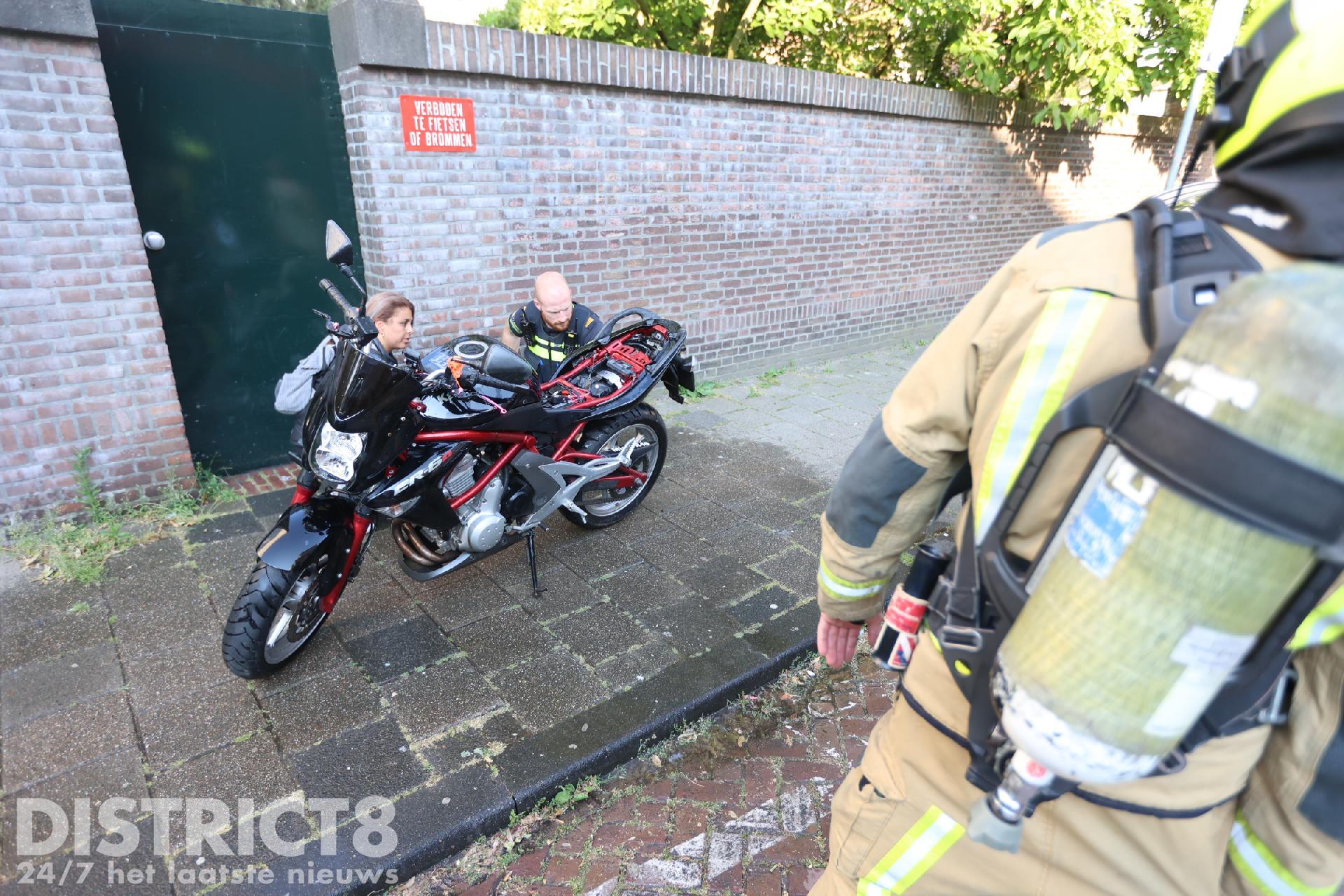 De eigenaar van de motorfiets had de eerste bluspoging gedaan met een brandblusser. Door het snelle handelen is de schade beperkt gebleven.