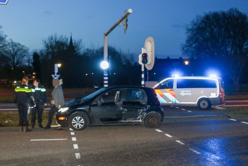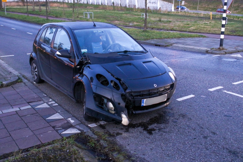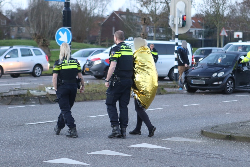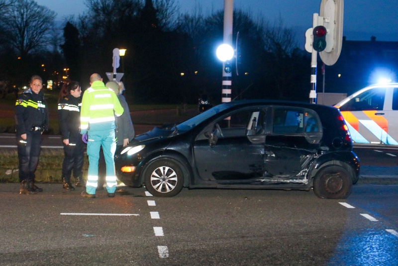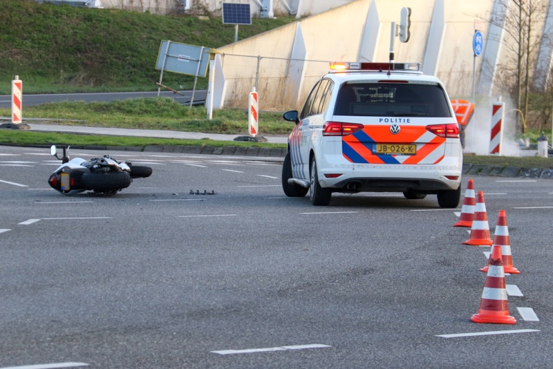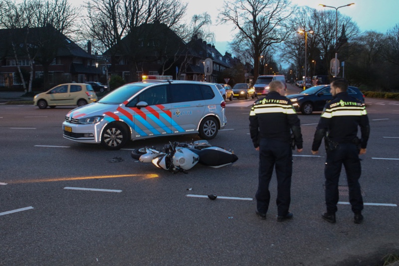 De motor en de auto kwamen met elkaar in botsing op de kruising met de Holysingel. De auto schoot door en kwam tegen een lantaarnpaal tot stilstand.