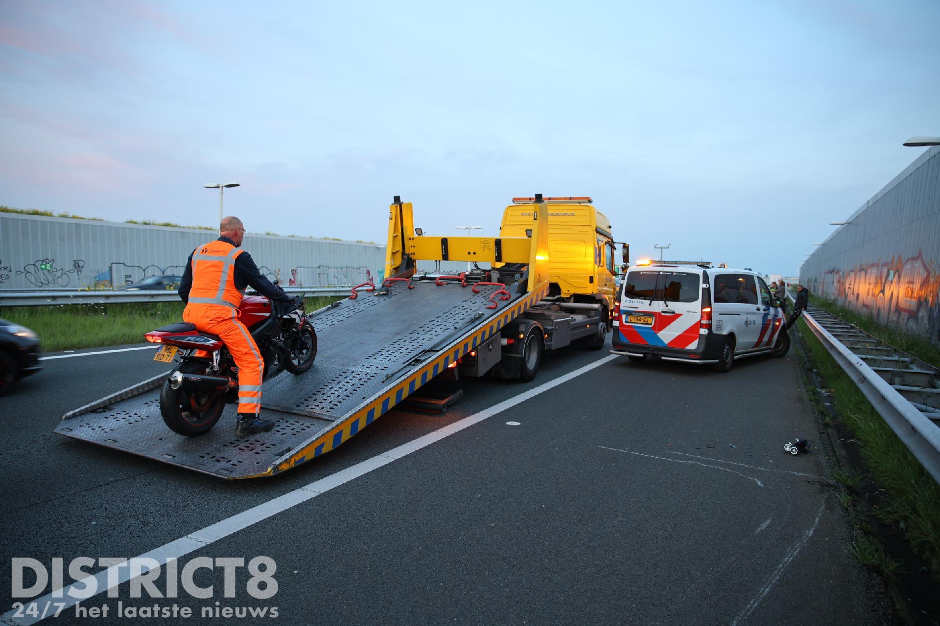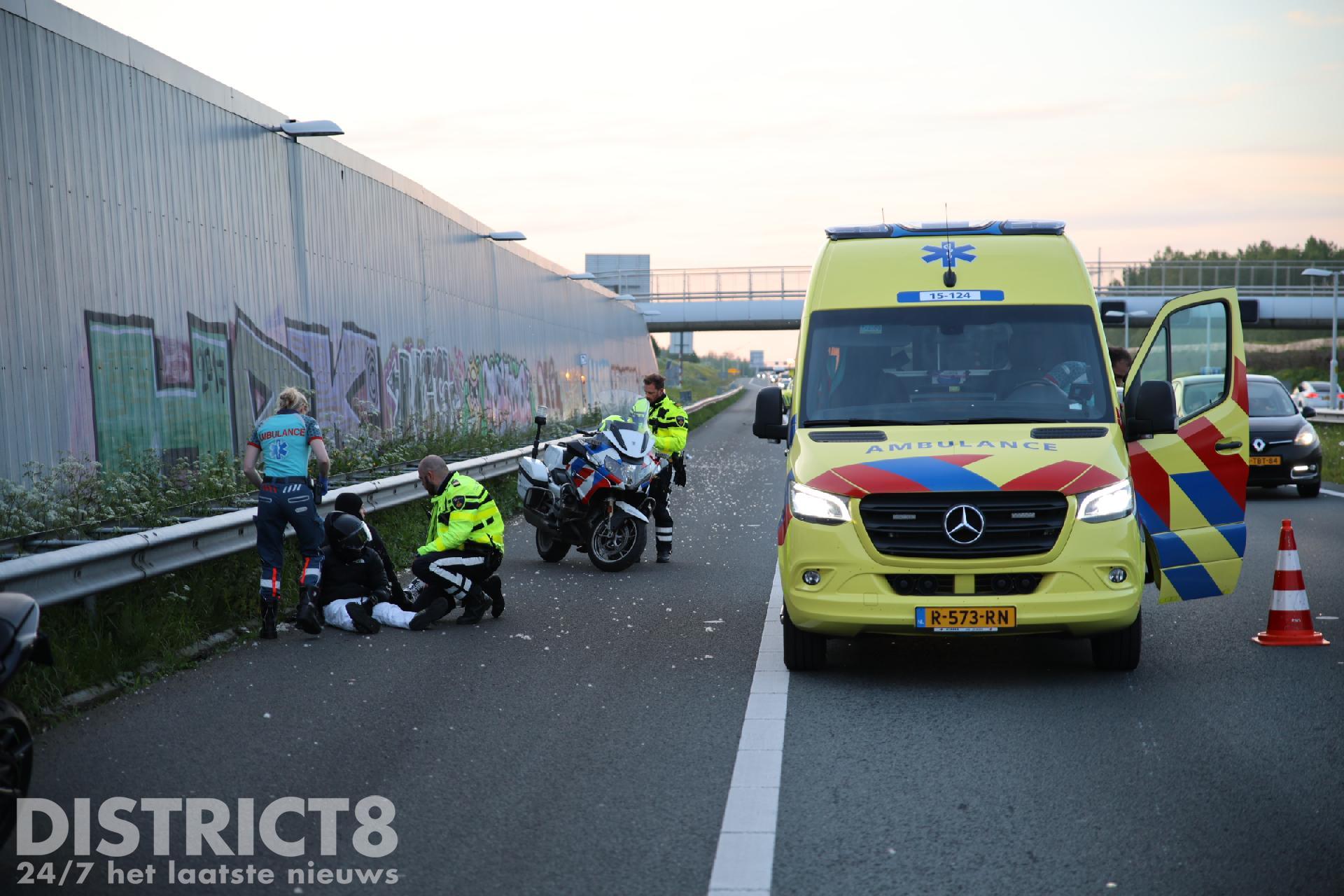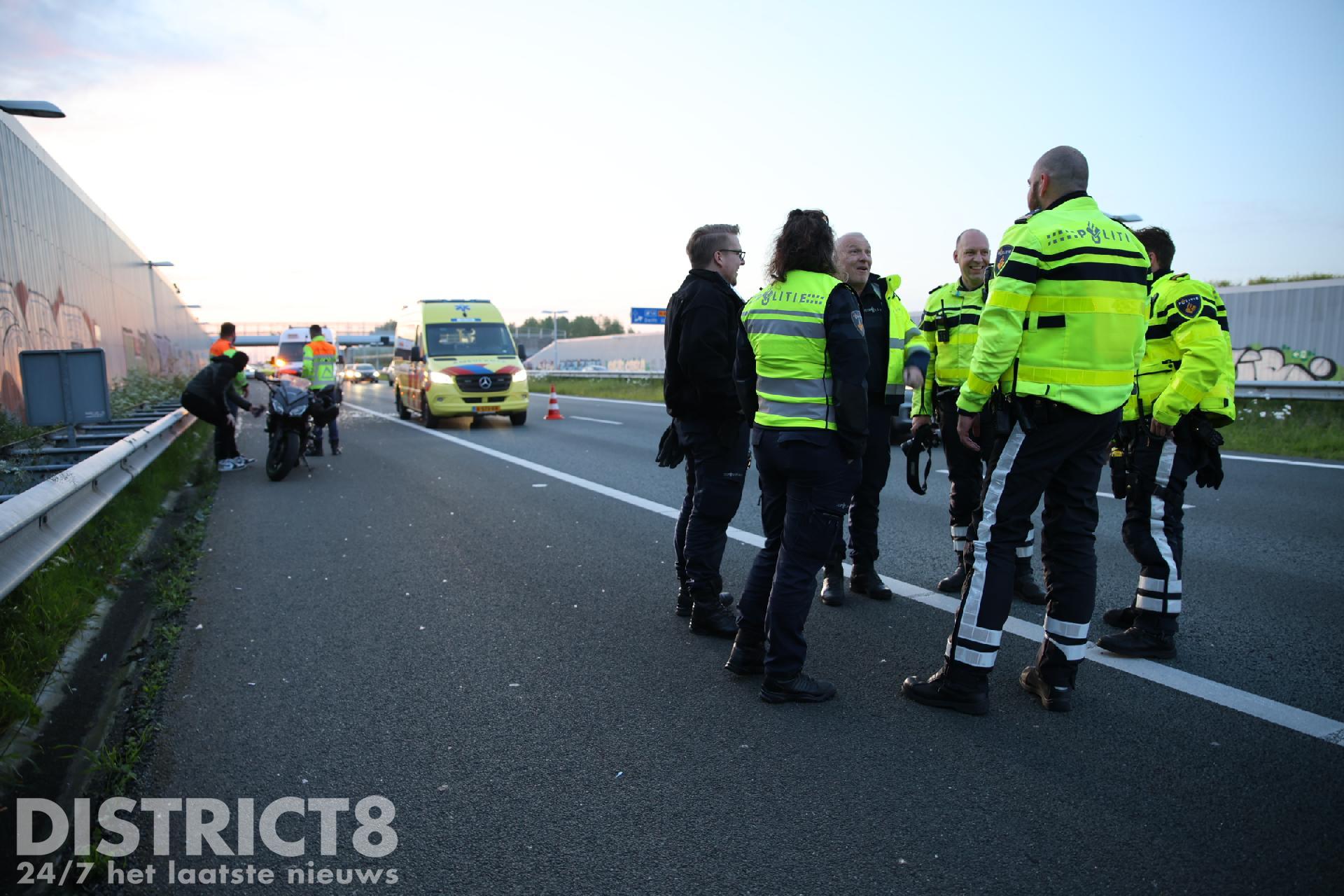 Meerdere politie-eenheden en een ambulance werden met spoed opgeroepen, samen met het MMT per auto uit Rotterdam. Bij aankomst is één rijstrook in de richting van Rotterdam afgesloten. De motorrijder kwam hard ten val; over de vluchtstrook liggen veel veren, dit zijn van de motorrijder zijn jas die kapot is gegaan tijdens de val.