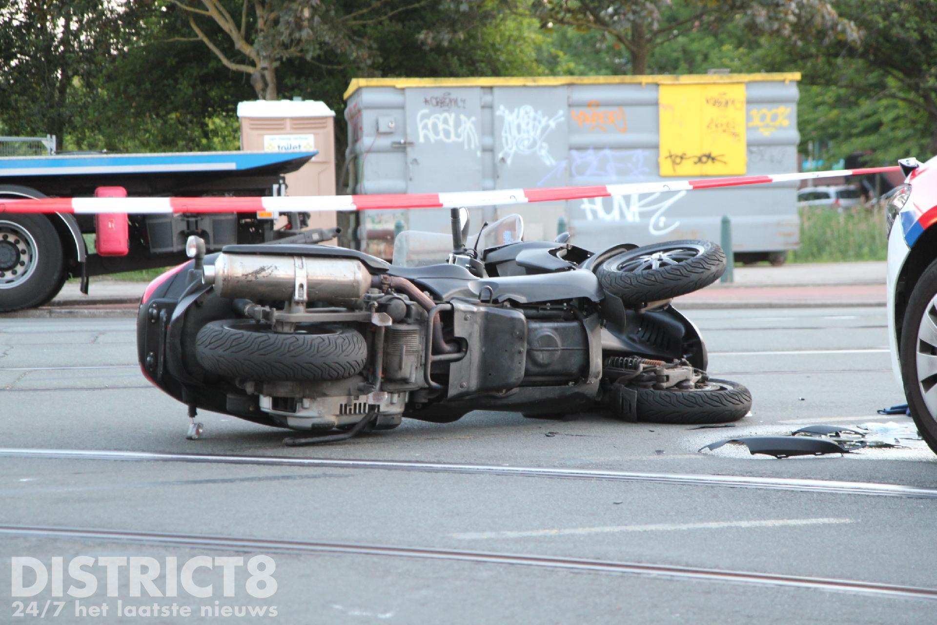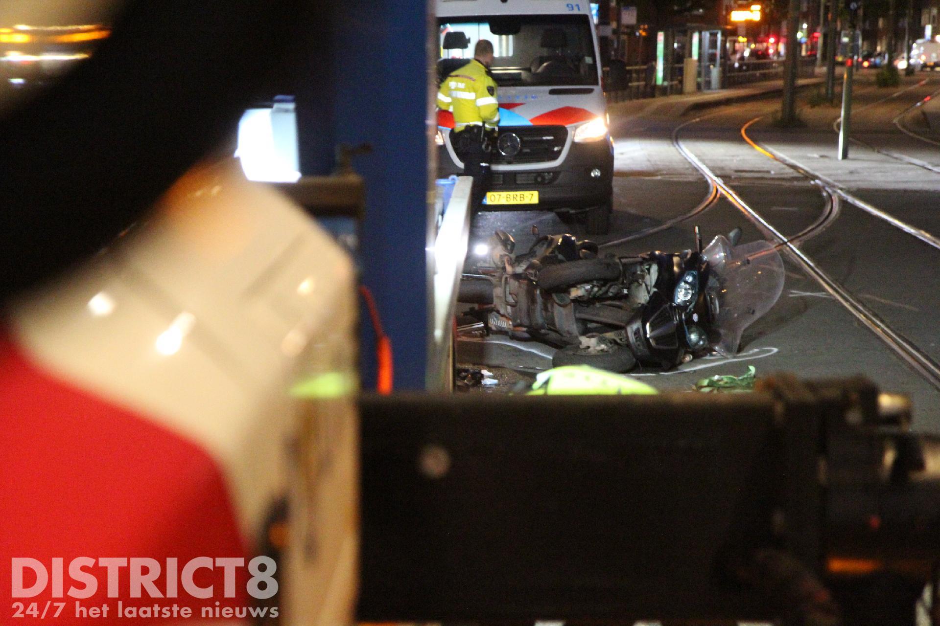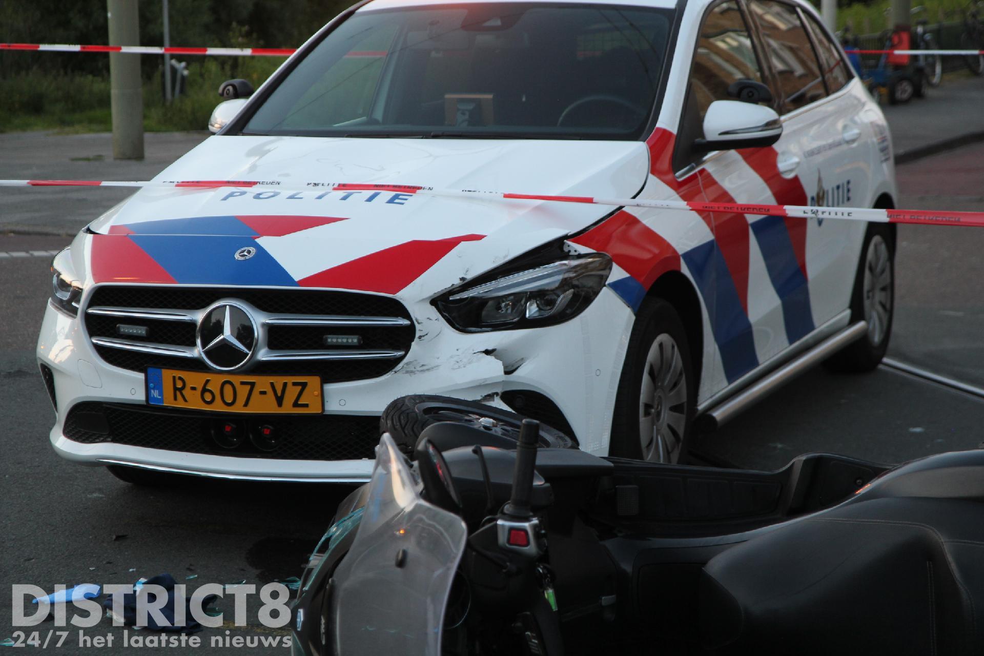 Het ging omstreeks negen uur mis op de Oudemansstraat nadat een motorscooter door nog onbekende oorzaak in botsing kwam met een politievoertuig.
