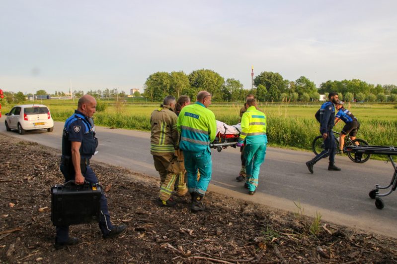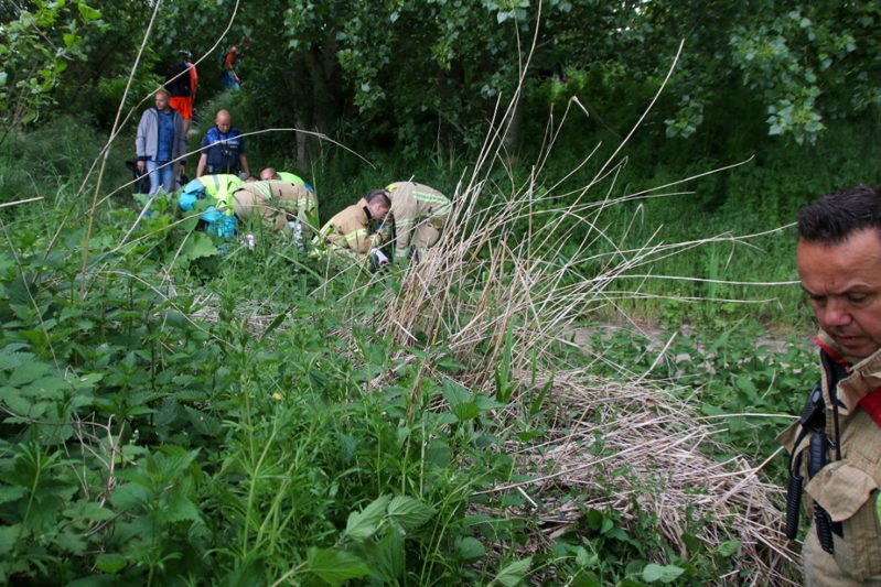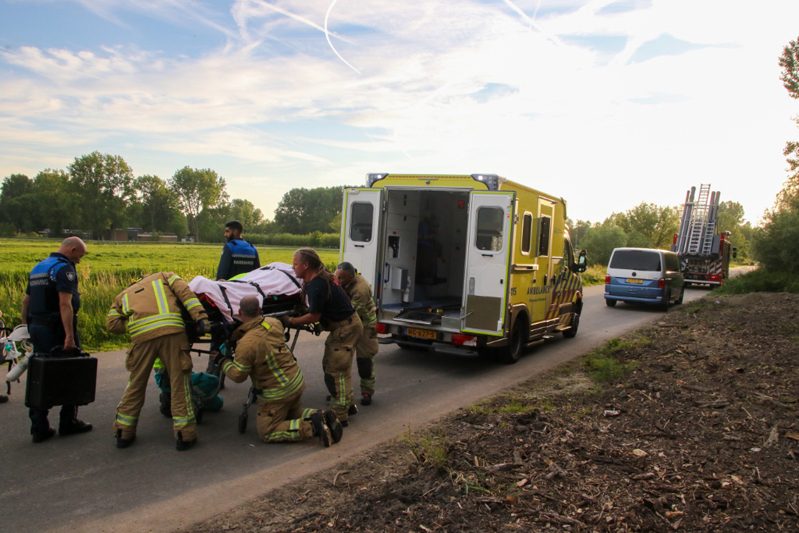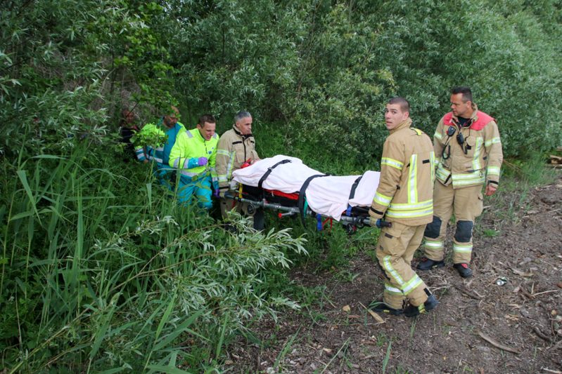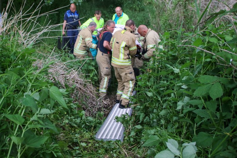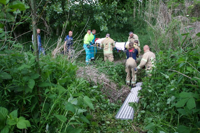 Via een legplaat van de brandweer die over het slootje werd gelegd kon het slachtoffer naar de ambulance getild worden.