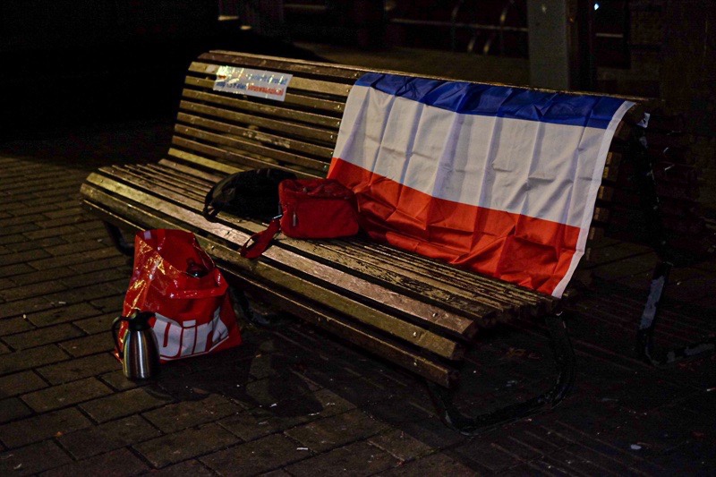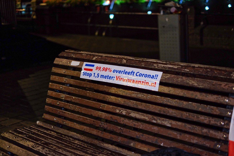 De demonstranten zitten daar met vlaggen en borden met onder andere de teksten “Stop de 1,5 meter nu”.