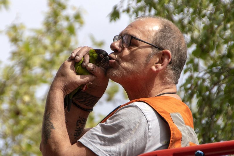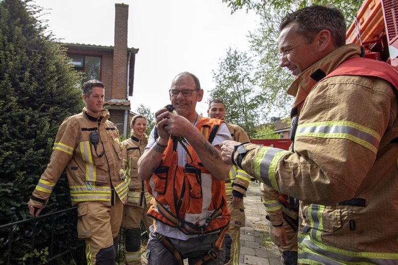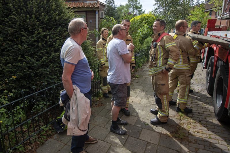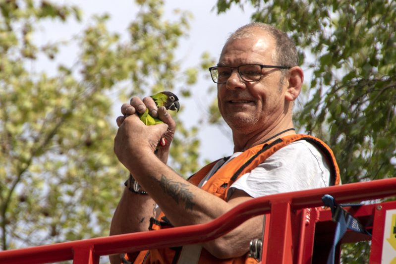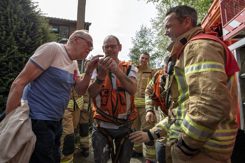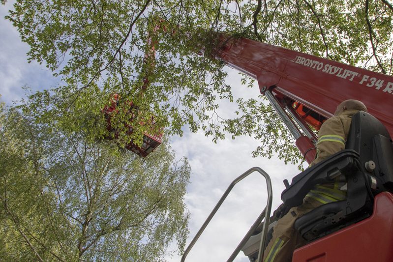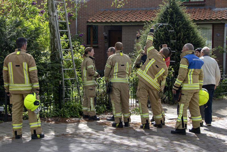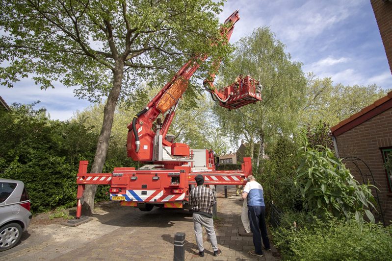 Ze kwamen met drie voertuigen ter plaatse en de eigenaar van de vogel ging in het bakje van de hoogwerker omhoog. Het lukte ze uiteindelijk om de vogel te pakken en veilig naar beneden te krijgen.