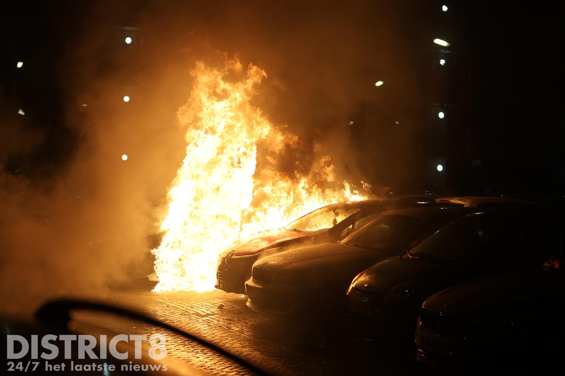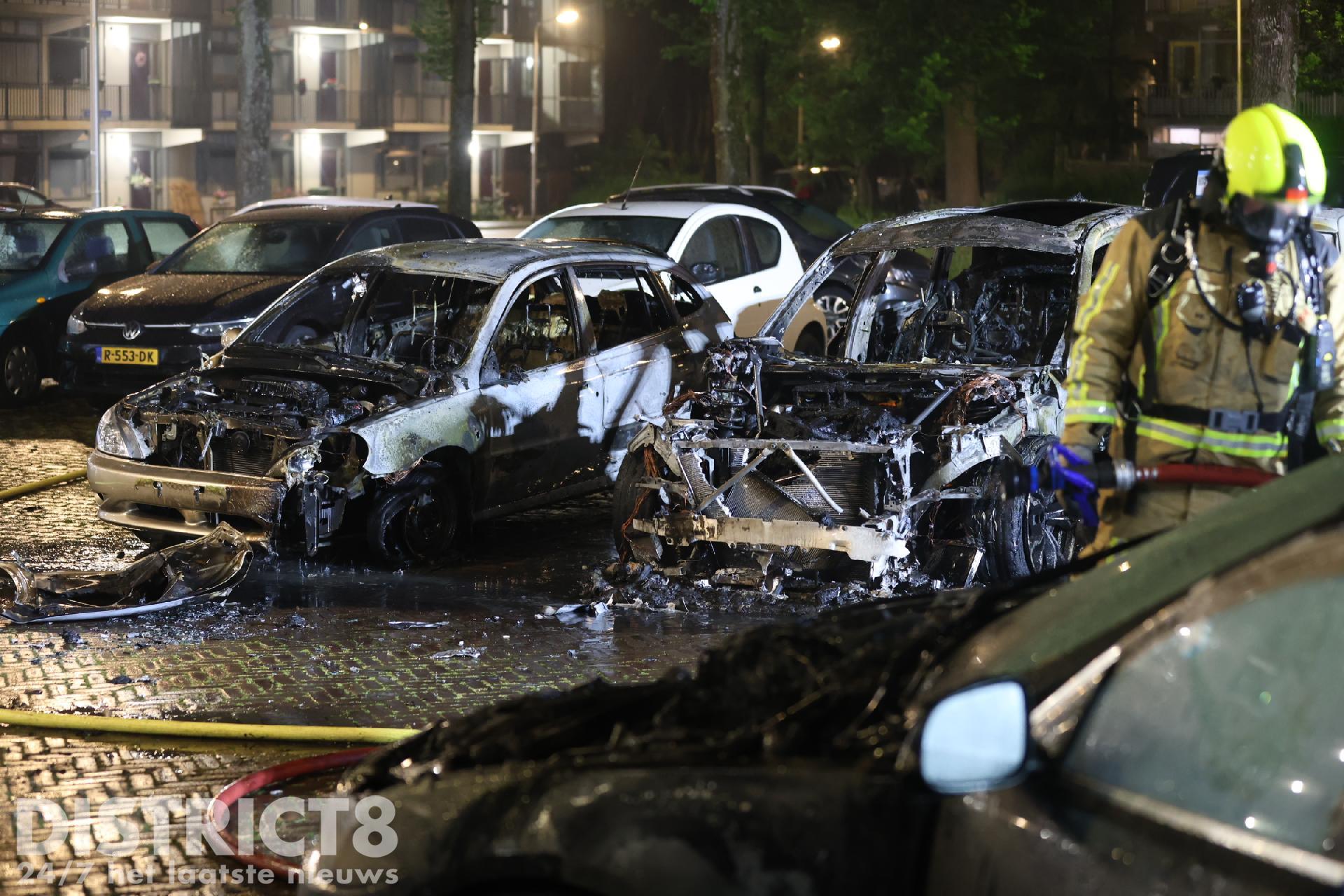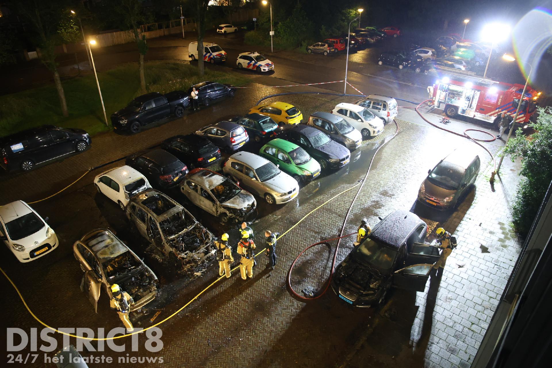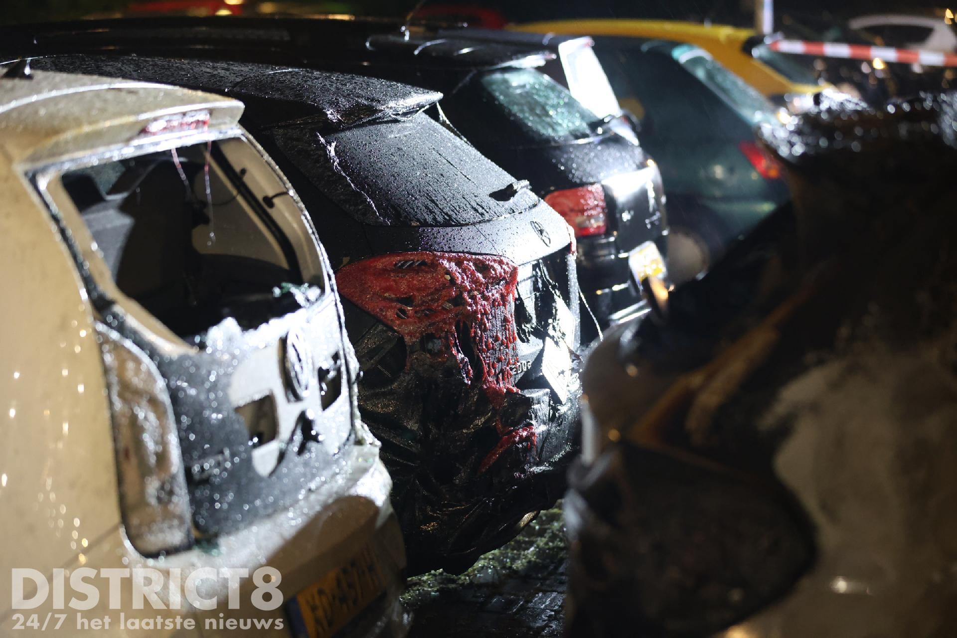Inmiddels stonden tientallen bewoners en auto-eigenaren geëmotioneerd toe te kijken hoe de brandweer alle brandende voertuigen aan het blussen waren, toen werd ook de enorme ravage zichtbaar op de parkeerplaats. In totaal brandde vier voertuigen volledig uit op liepen vijf andere voertuigen enorme brandschade op. De politie heeft de flessen brandstof veiliggesteld voor nader onderzoek, hierbij worden ook getuigen gehoord.