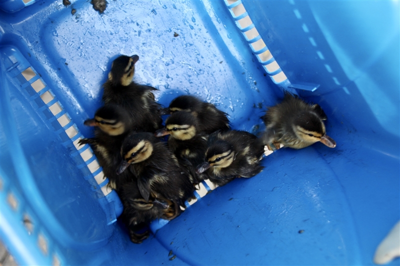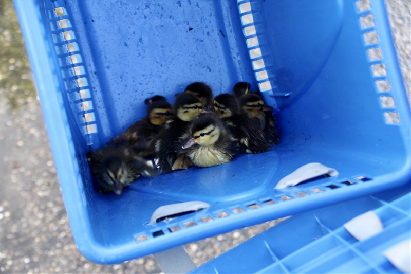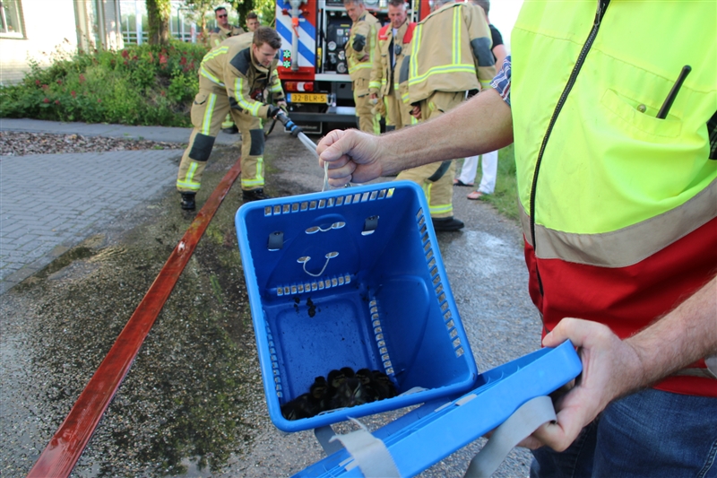 Een bewoner van een woning aan het Oranjeveld zag dat een duif tegen een kas aan vloog, en daarna niet meer bewoog. Toen hij richting de duif liep om te kijken of het daar goed mee ging, ontdekte hij de familie eend, die in het lege bassin zat. Waarschijnlijk zijn de negen pijltjes ter wereld gekomen in het bassin. De man belde de dierenambulance, die op haar beurt de hulp inschakelde van de Maasdijkse brandweer.