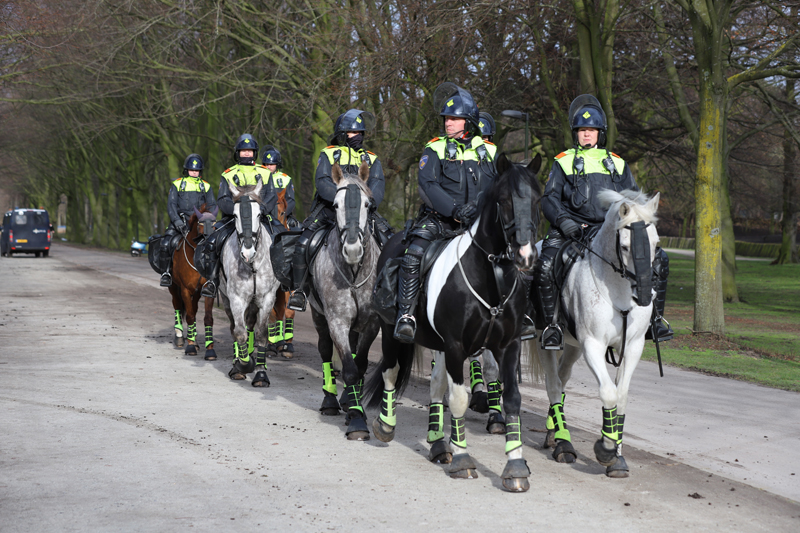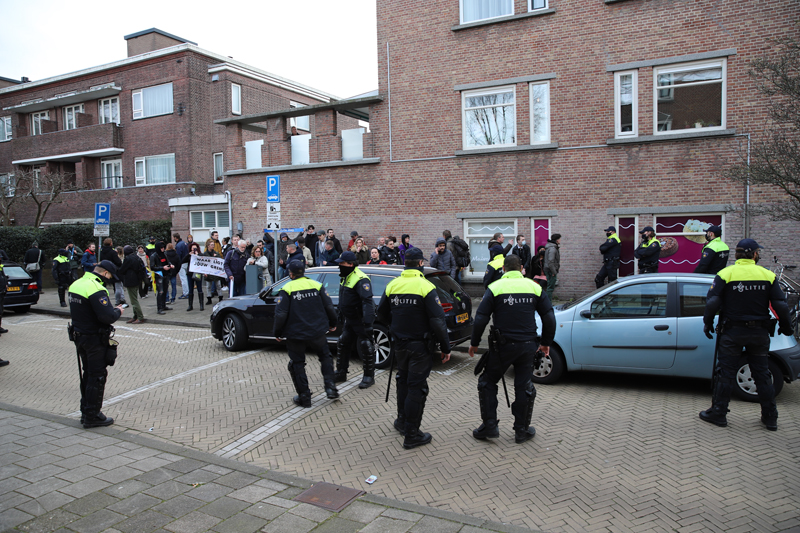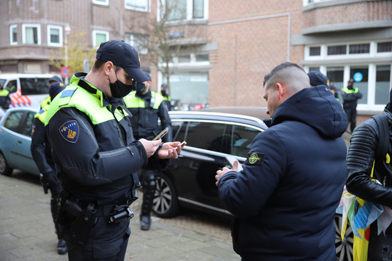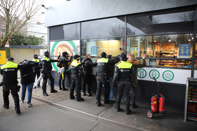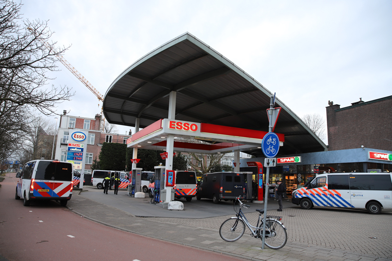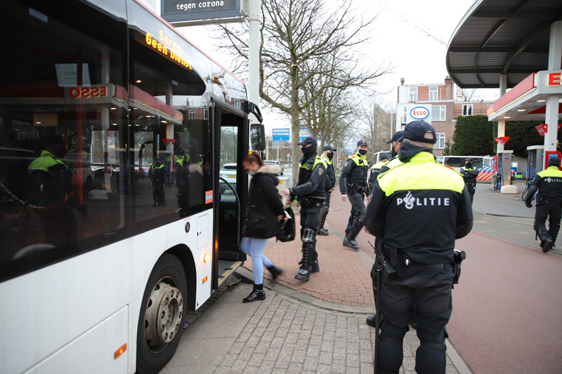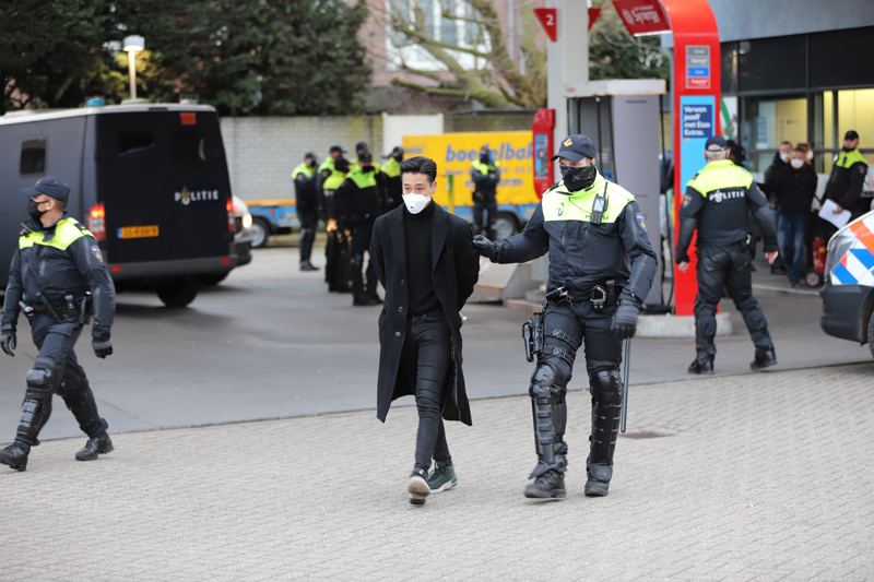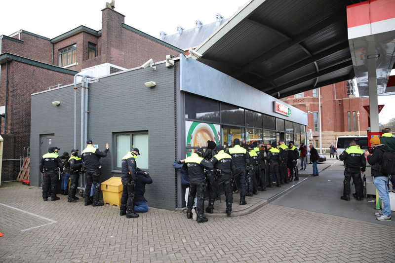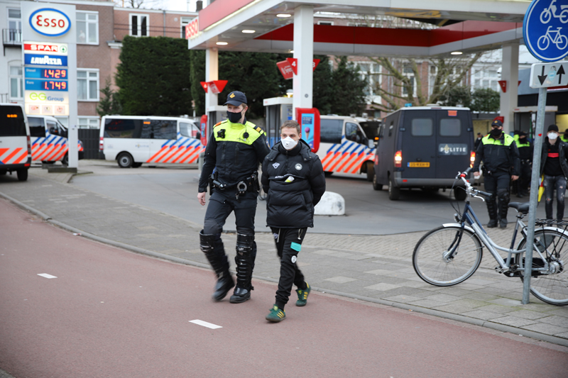 Zo’n elf personen hielden zich daar niet aan en liepen het Esso tankstation aan de Zuid-Hollandlaan binnen. Deze personen werden kort daarna aangehouden. Zij werden in een bus van de HTM vervoerd naar het cellencomplex op het hoofdbureau.