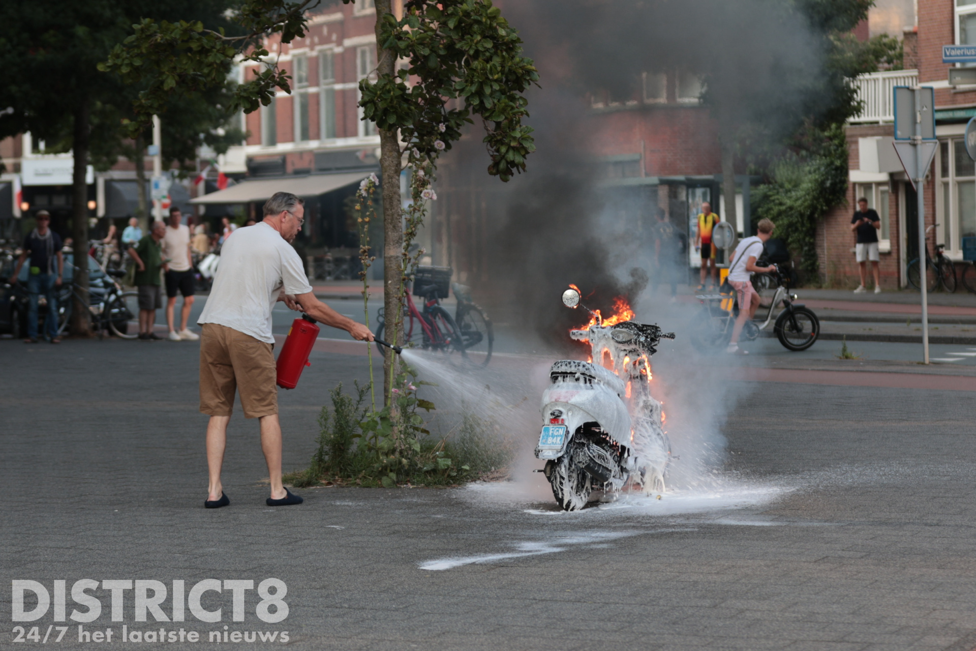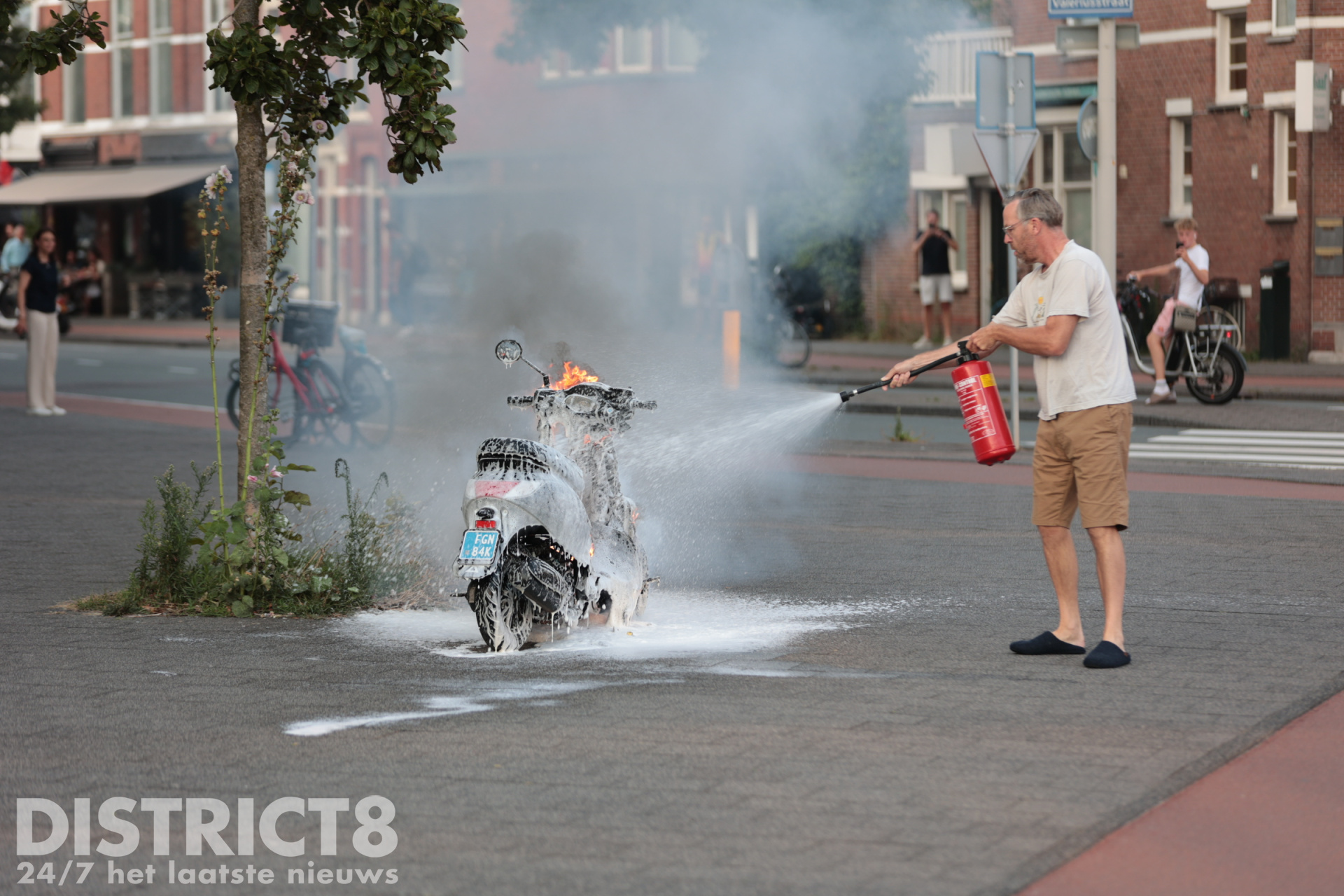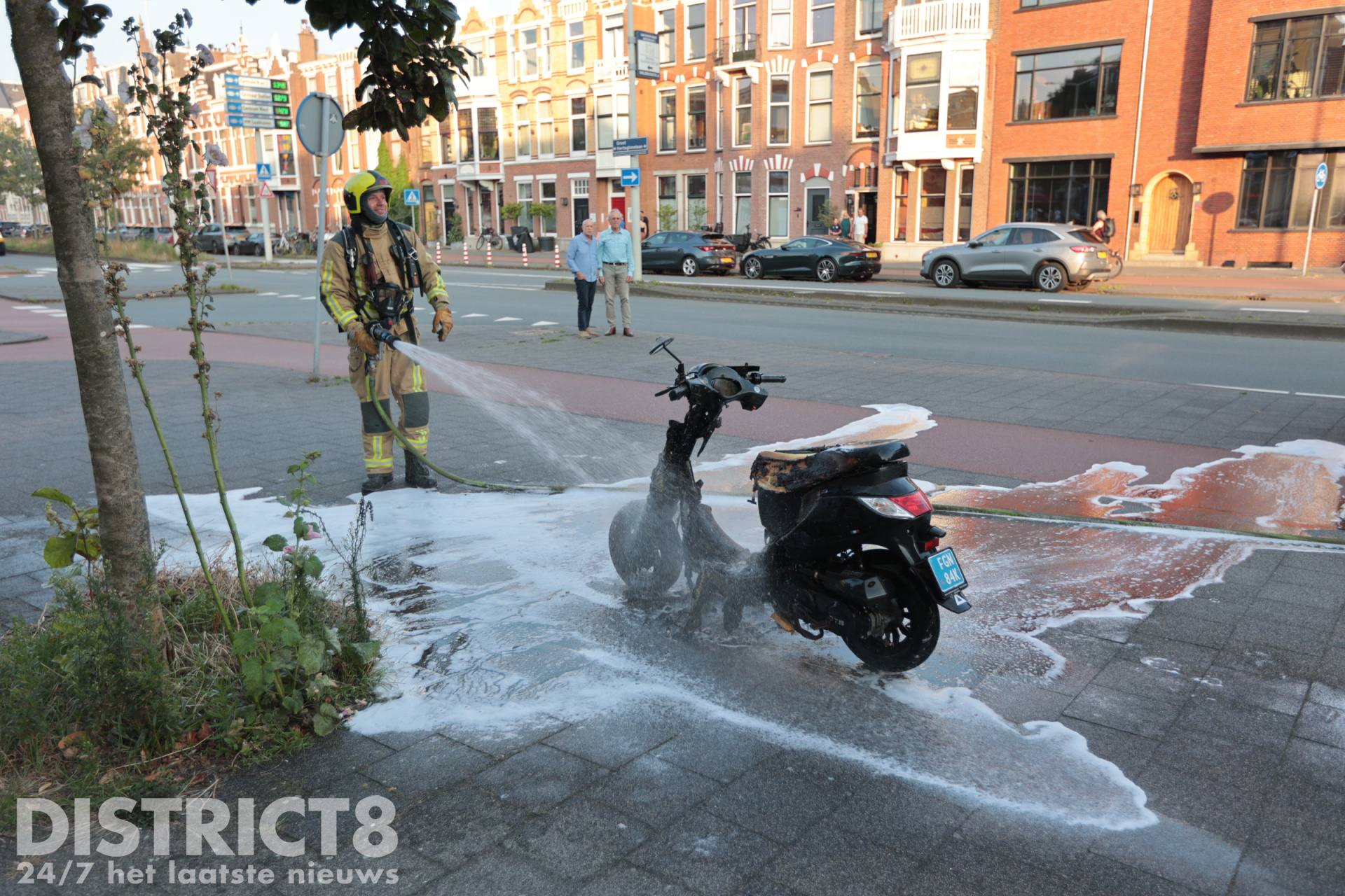 Den Haag – Omstanders hebben woensdagavond 28 augustus een fikse scooterbrand geblust op de Groot Hertoginnelaan nabij de kruising met de Valeriusstraat in Den Haag.