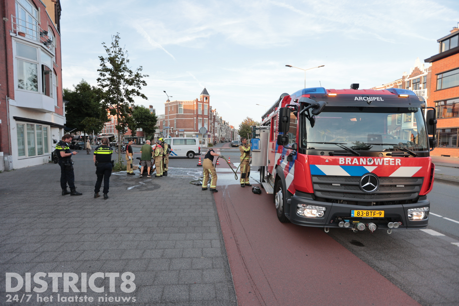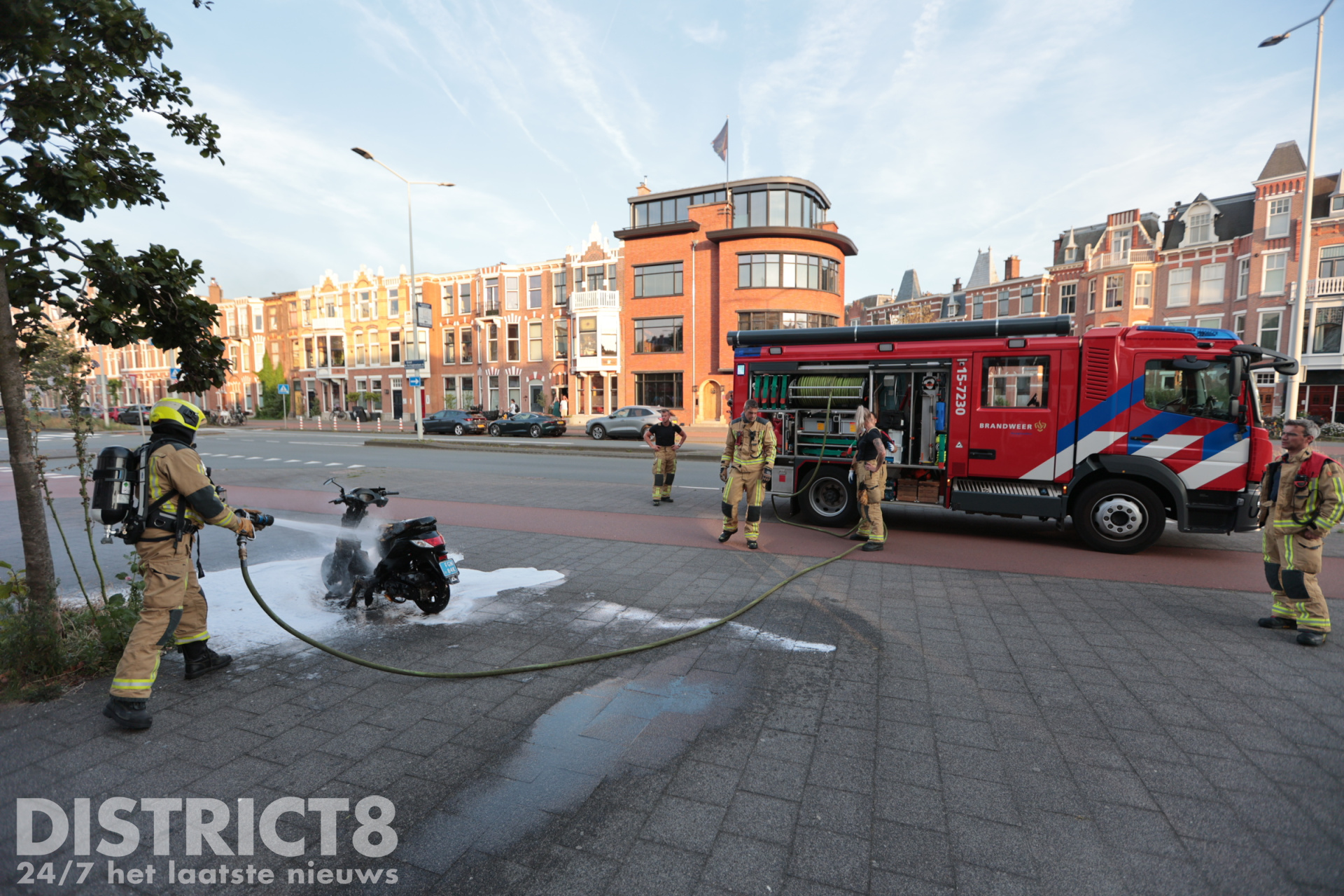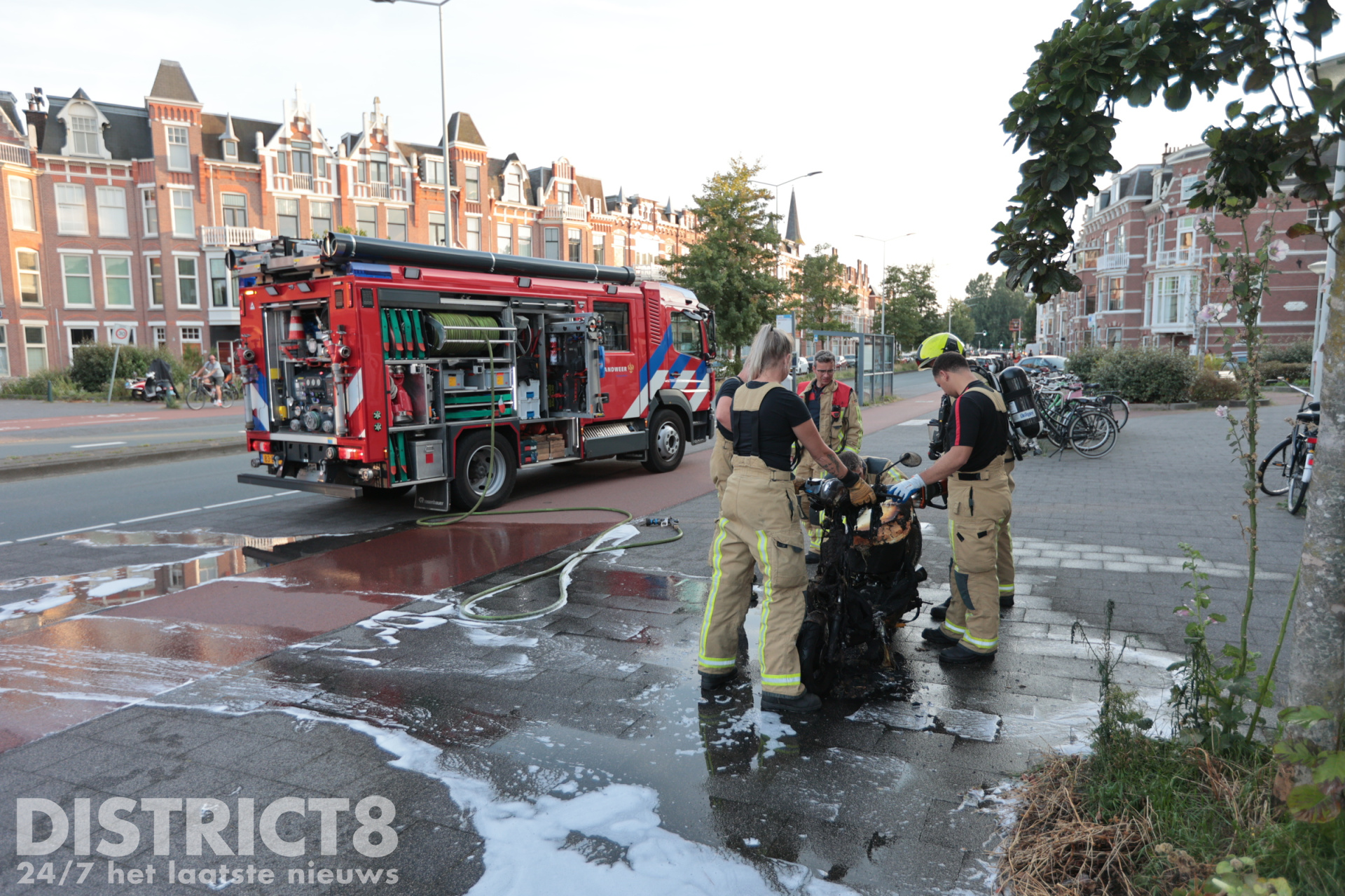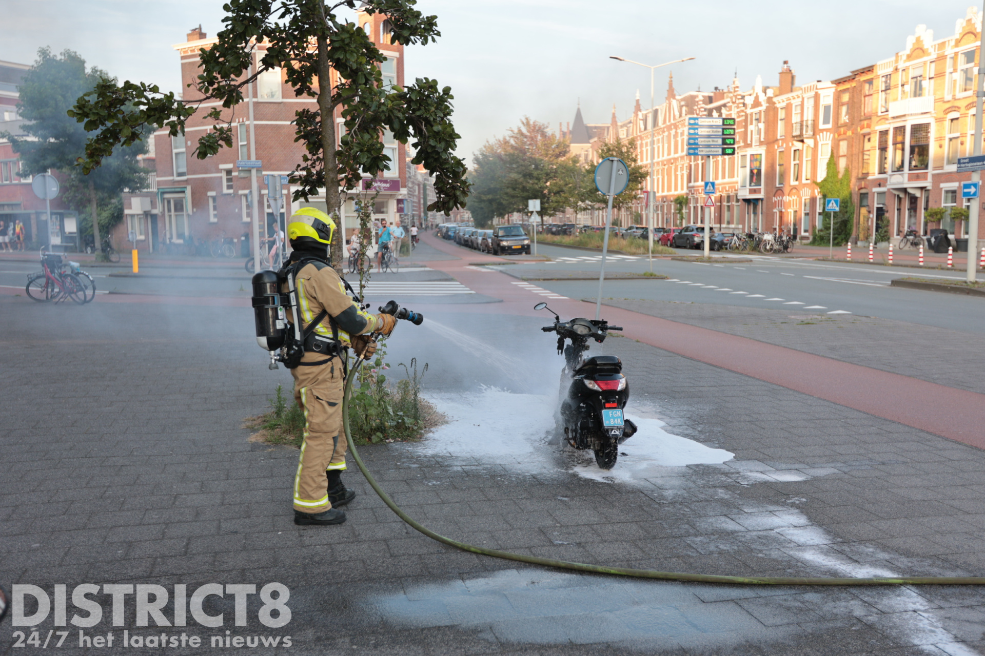 Den Haag – Omstanders hebben woensdagavond 28 augustus een fikse scooterbrand geblust op de Groot Hertoginnelaan nabij de kruising met de Valeriusstraat in Den Haag.