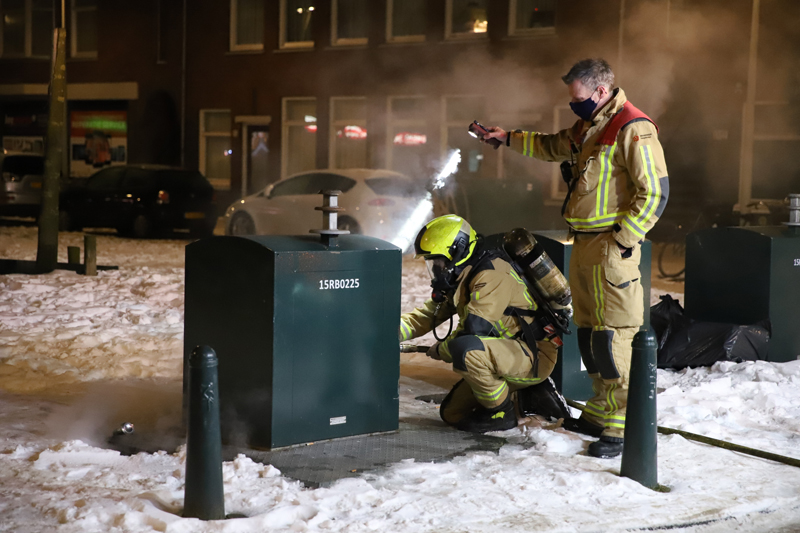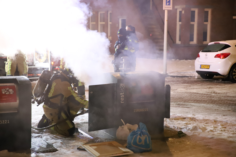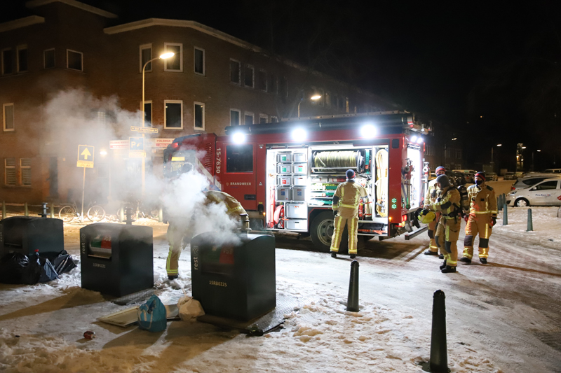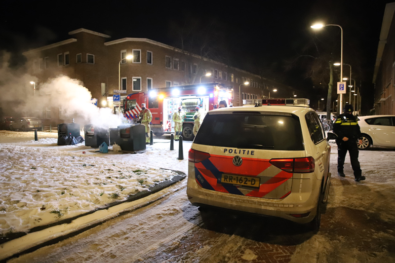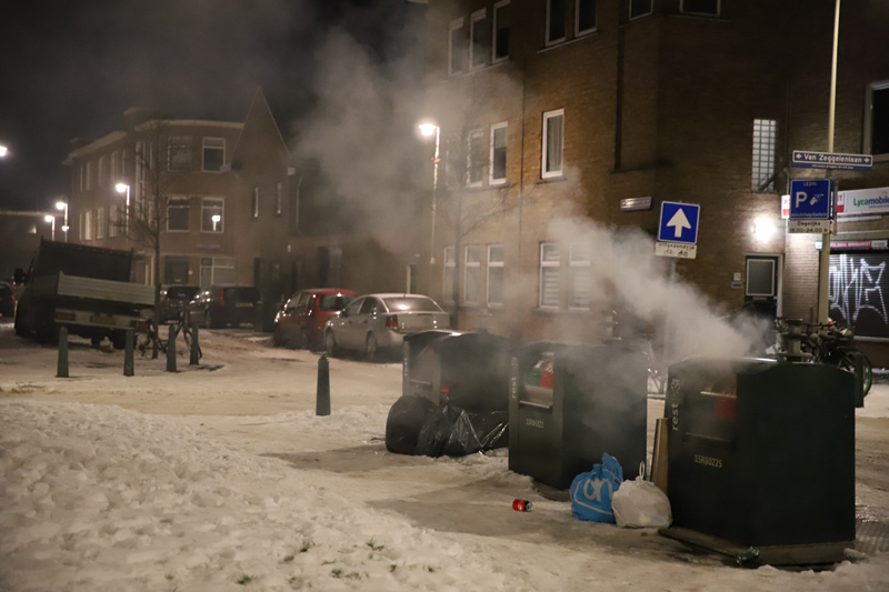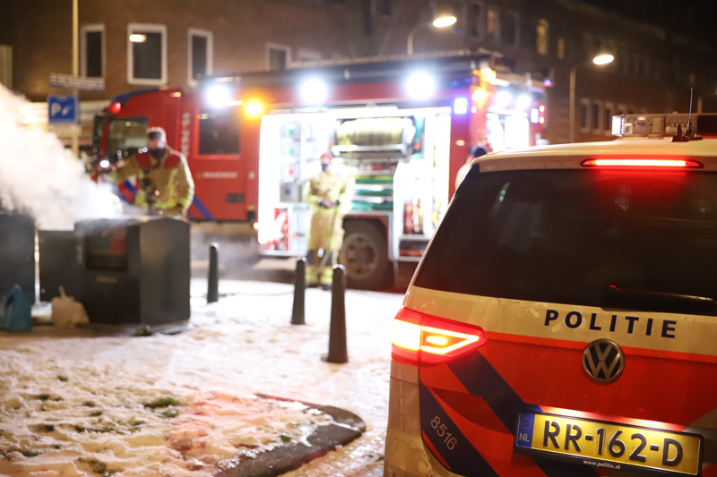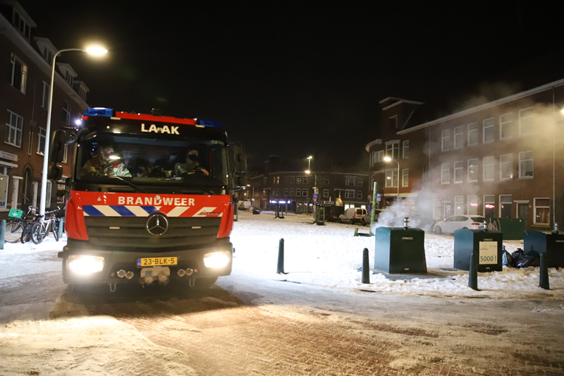 Om twee uur gingen de piepers van de brandweerlieden van kazerne Laak. Ze moesten uitrukken voor een containerbrand op de kruising van de Van Zeggelenlaan met de Capadosestraat in de Haagse wijk Laakkwartier.