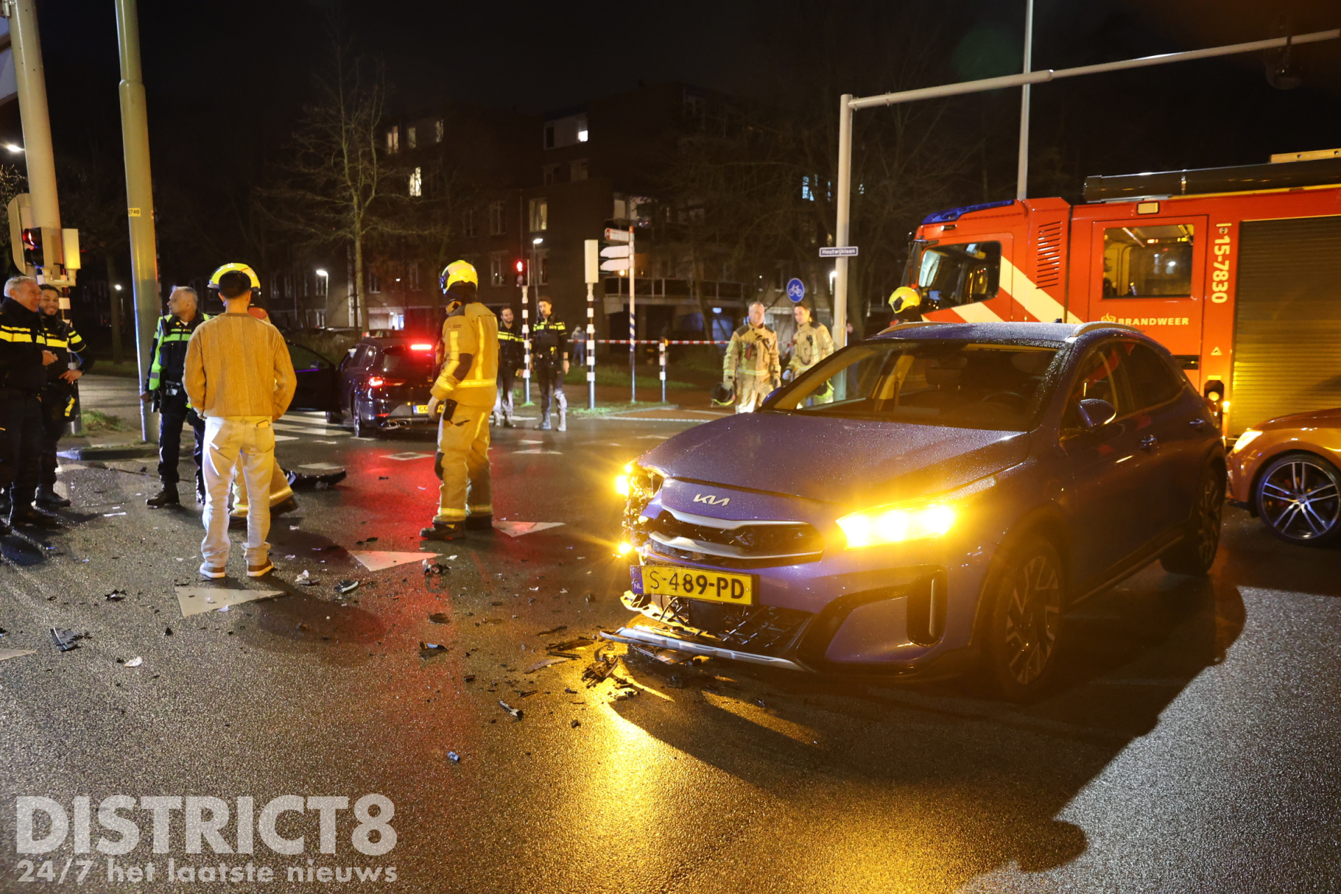 Op de kruising zijn twee autos op elkaar gebotst. Één van de wagens is een onopvallend dienstvoertuig van de politie.
