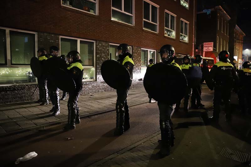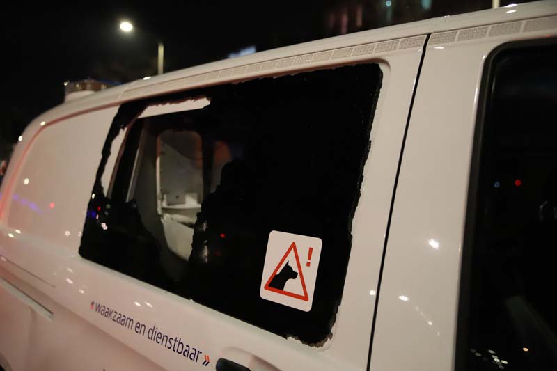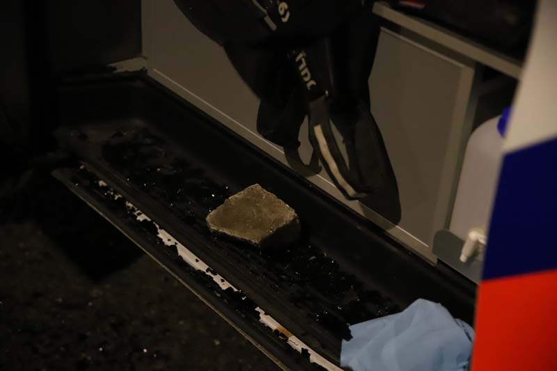 Politieagenten en ME bussen worden door de relschoppers met tegels bekogeld. De zijruit van een bus van de hondenbrigade is ingegooid met een steen.