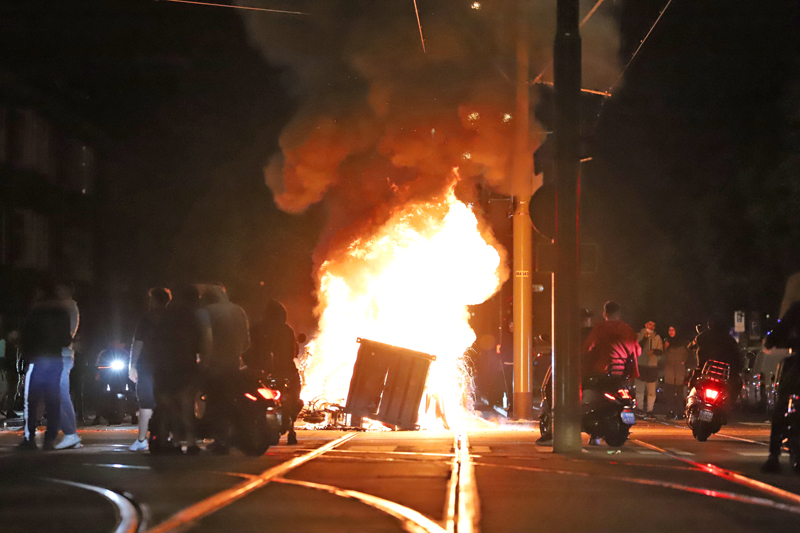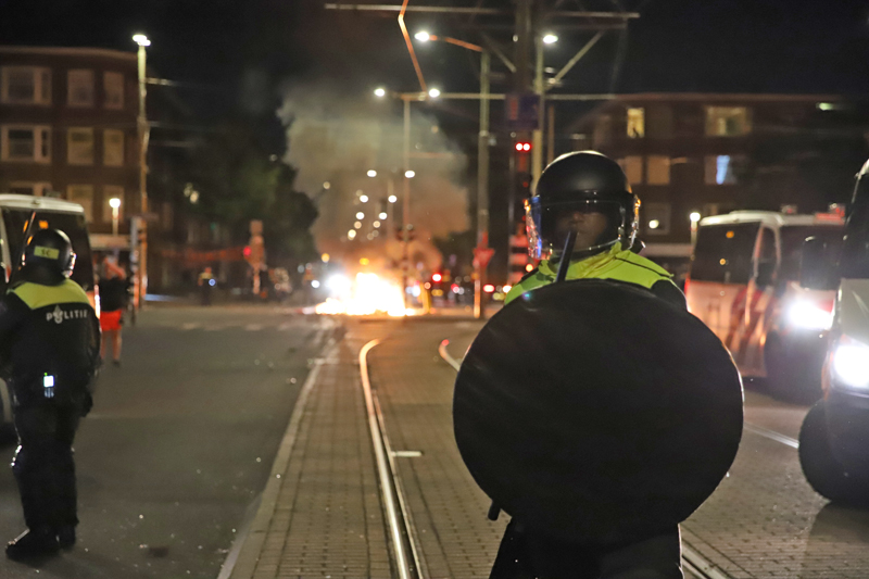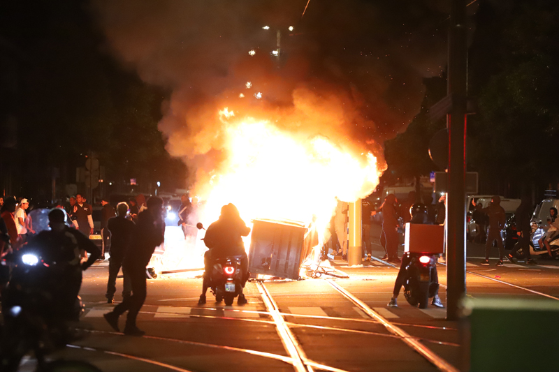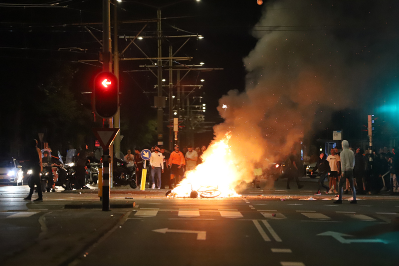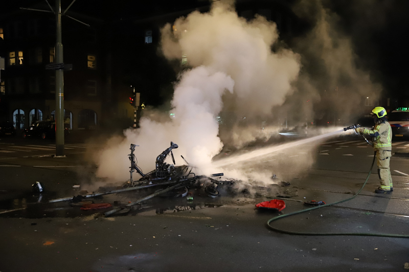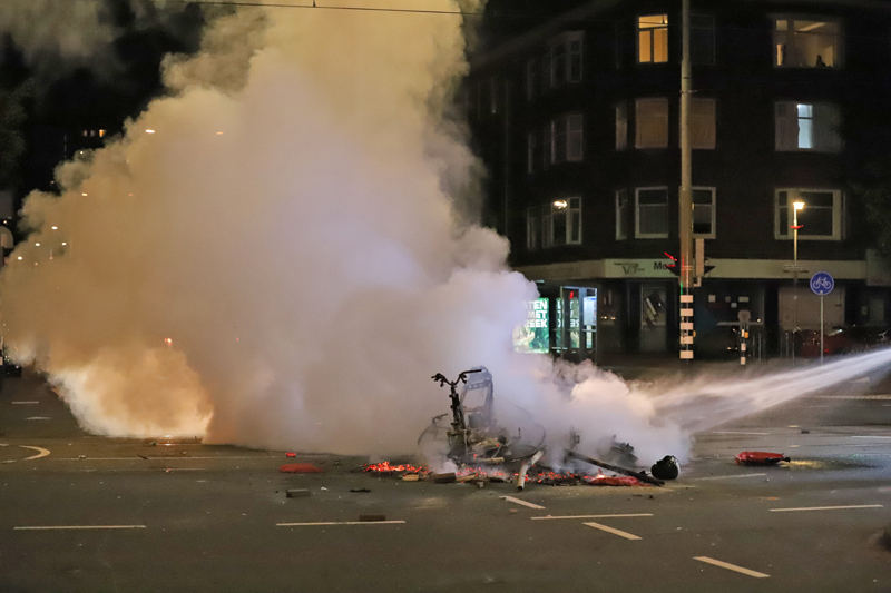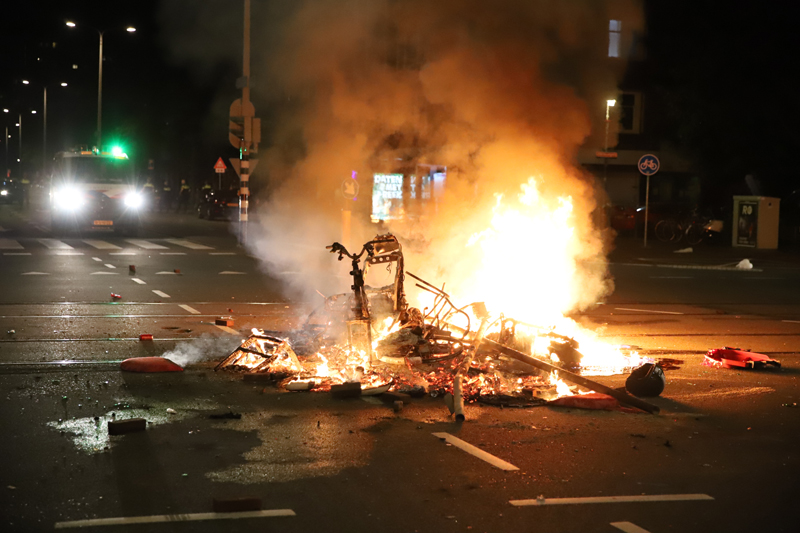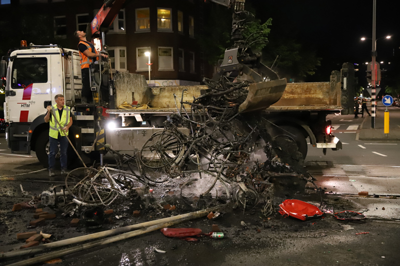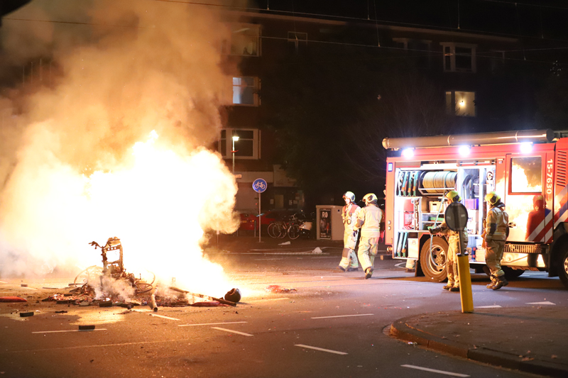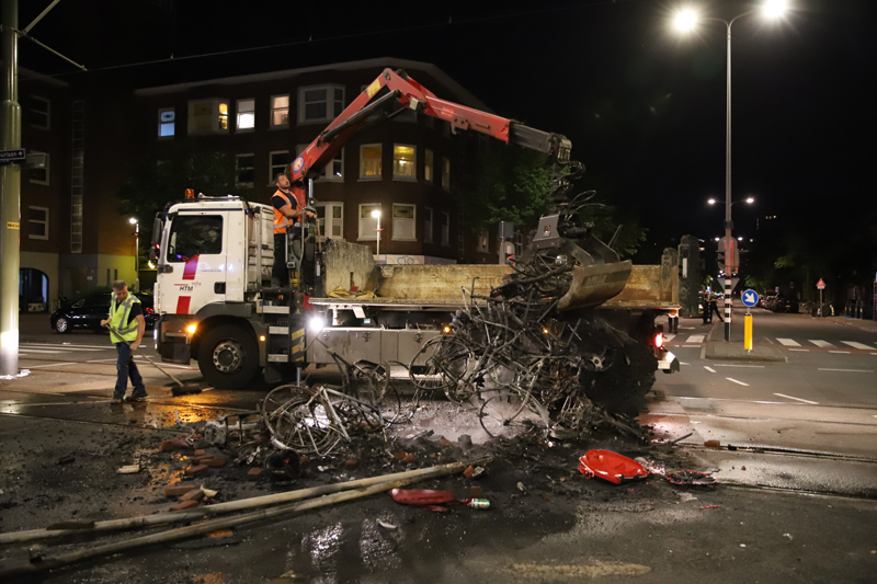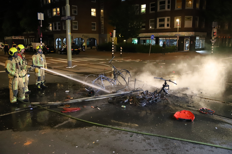 Op de kruising gingen verschillende fietsen en een mobiel toilet in vlammen op. Op het plein stonden tussen de honderd en honderdvijftig personen. Er werd met zwaar vuurwerk gegooid.