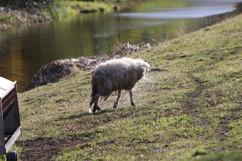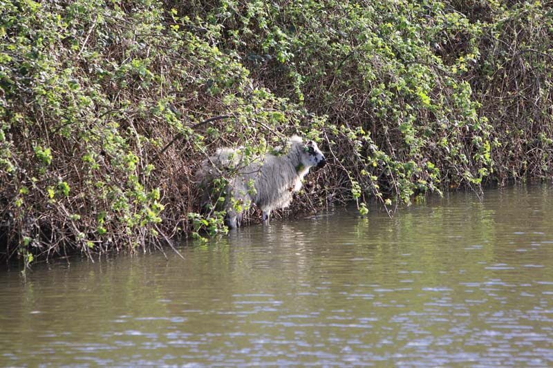 Het schaap sprong het water in en zwom naar de overkant. Toen hij de overkant had bereikt ontstond er opnieuw een probleem, een doornstruik blokkeerde de waterkant. De doorns bleven vastzitten in de vacht van het dier.
