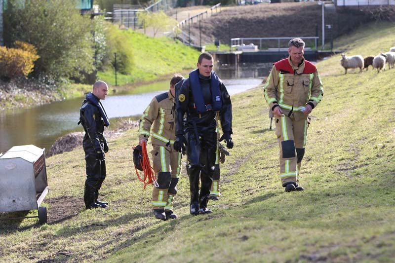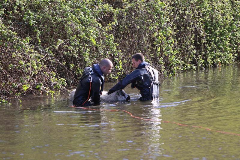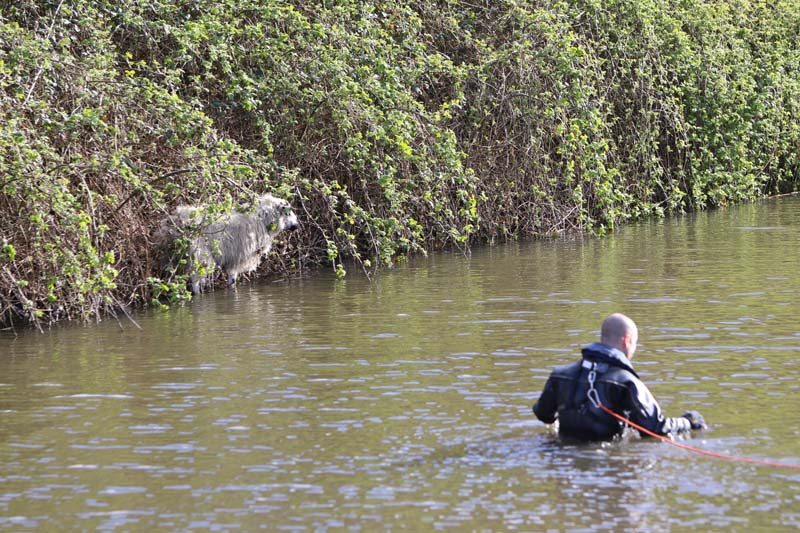 De brandweer kwam ter plaatse en ging met waadpakken het water in om het schaap te bevrijden uit zijn benarde positie.