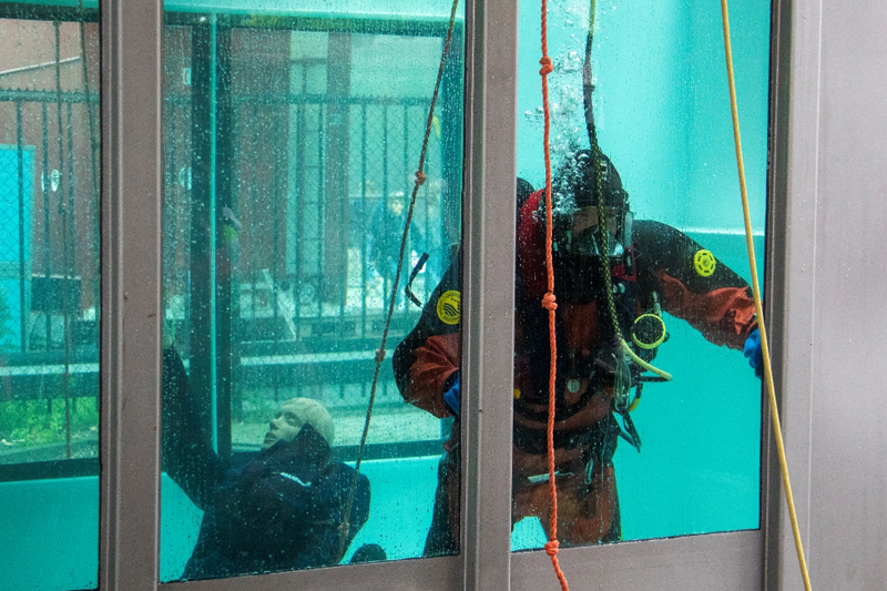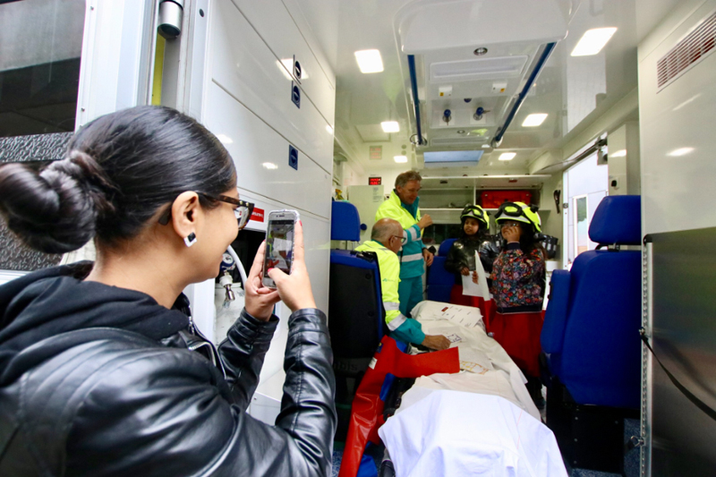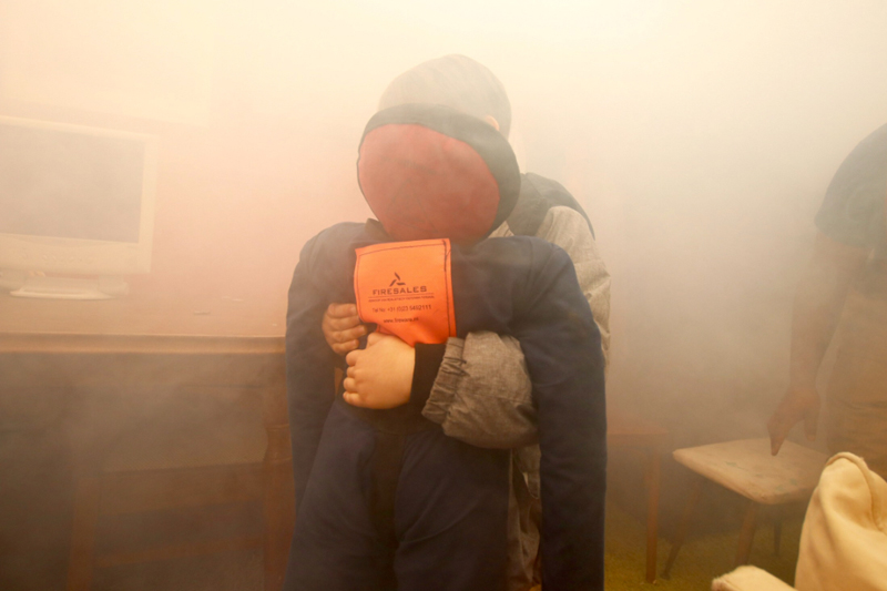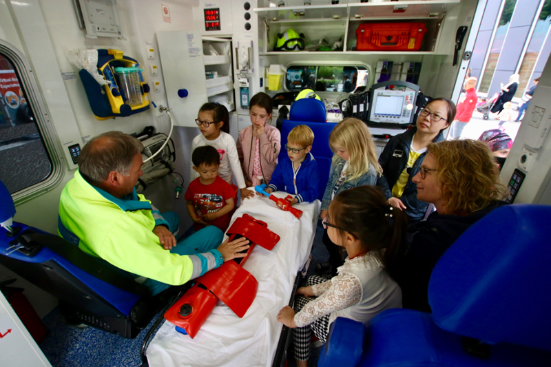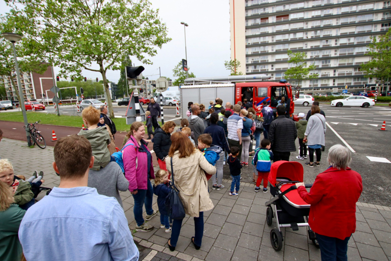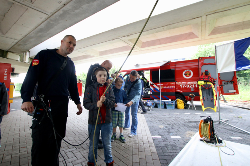 Door middel van een headset konden de kinderen praten met een van de duikers, of konden zij met touwen proberen een slachtoffer via een brancard uit het water te hijsen. Verderop stond de achterkant van de rij alweer voor het ritje met de brandweerwagen.