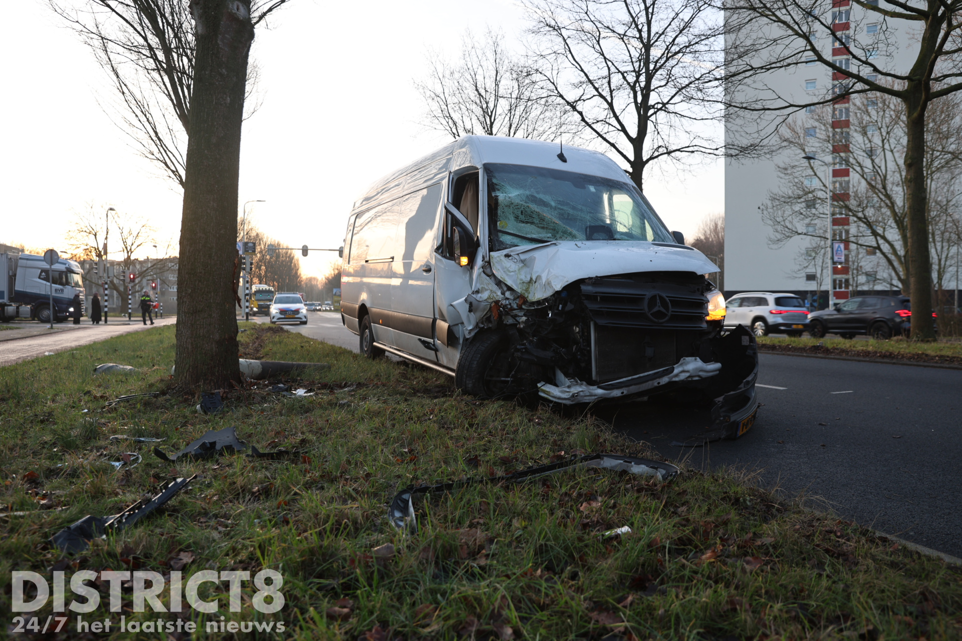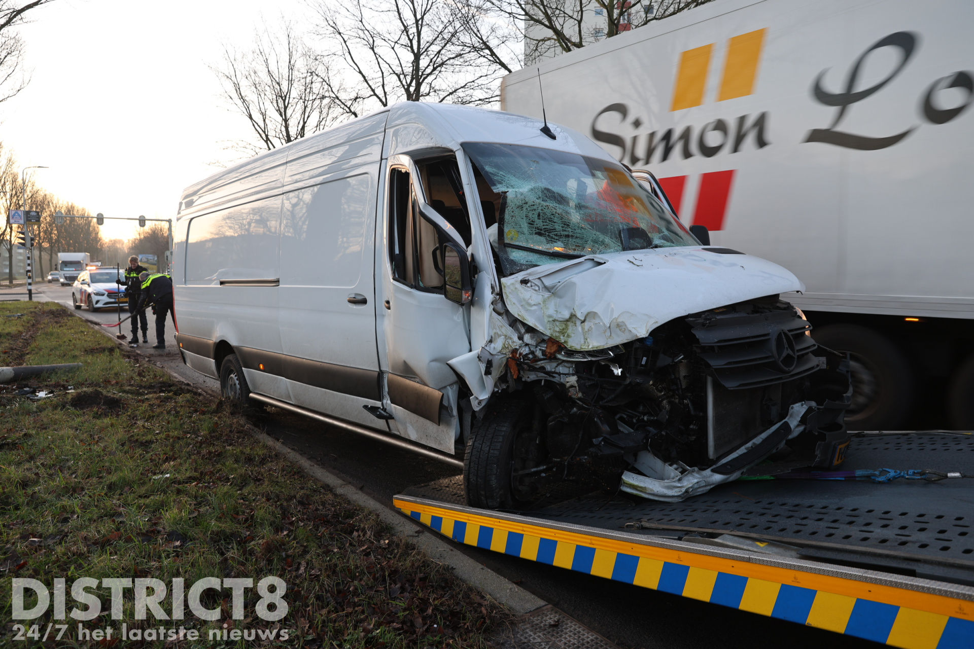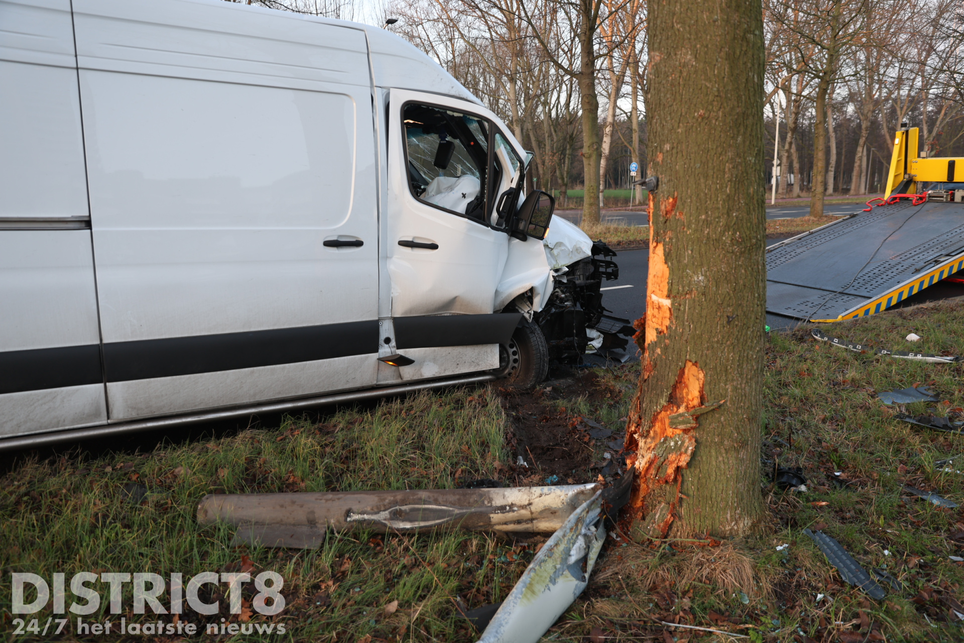Het busje raakte flink beschadigd, maar de bestuurder kwam er zonder ernstige verwondingen vanaf.