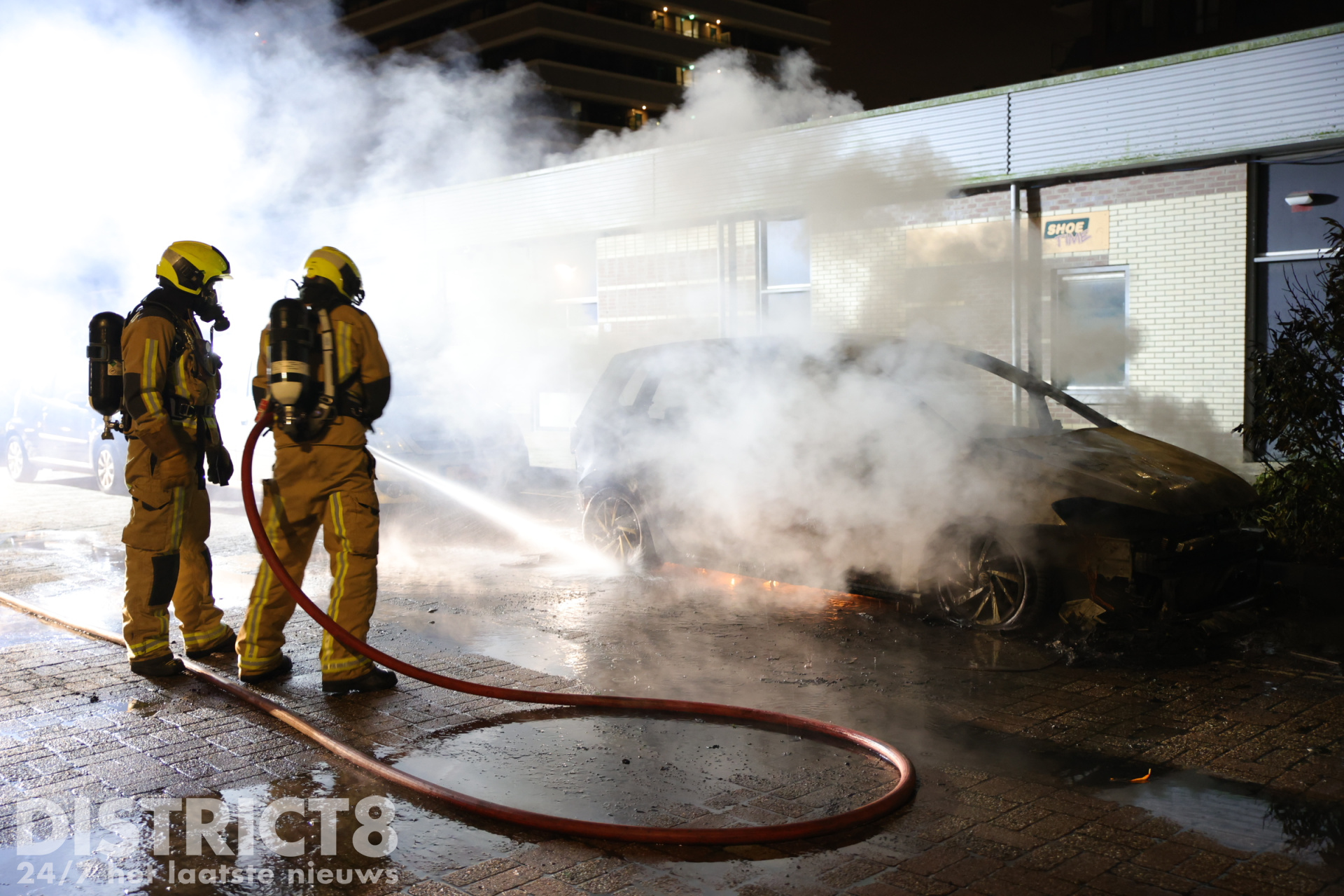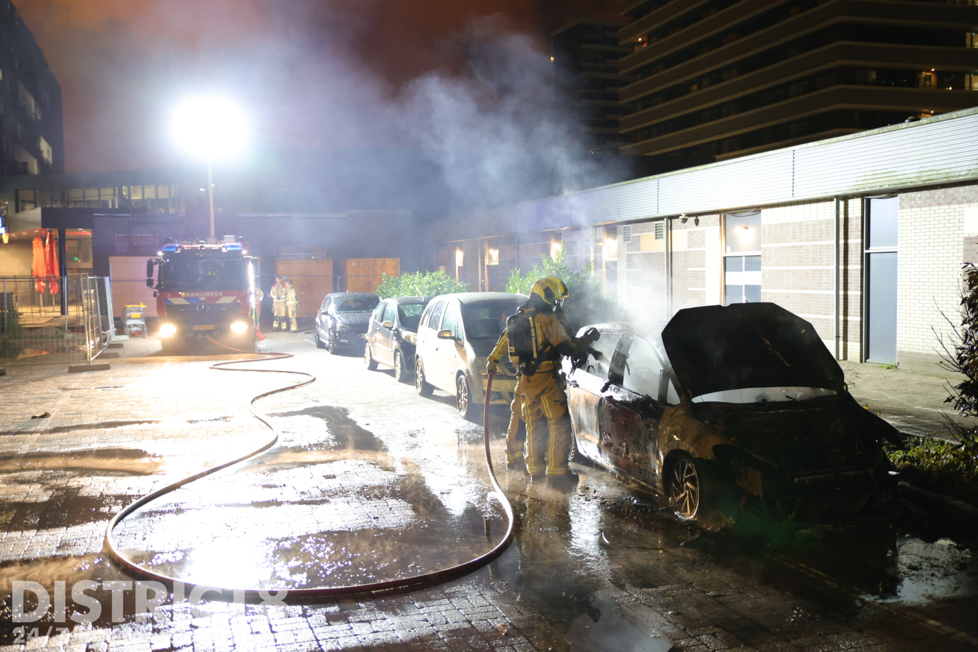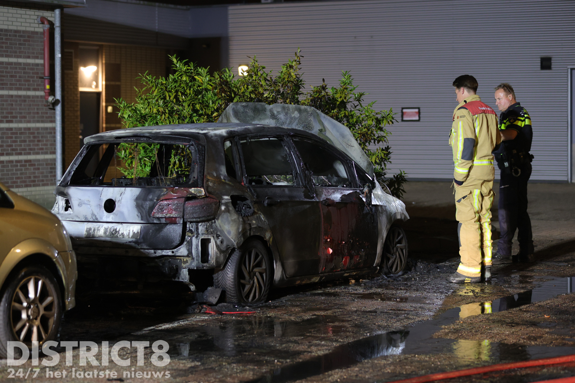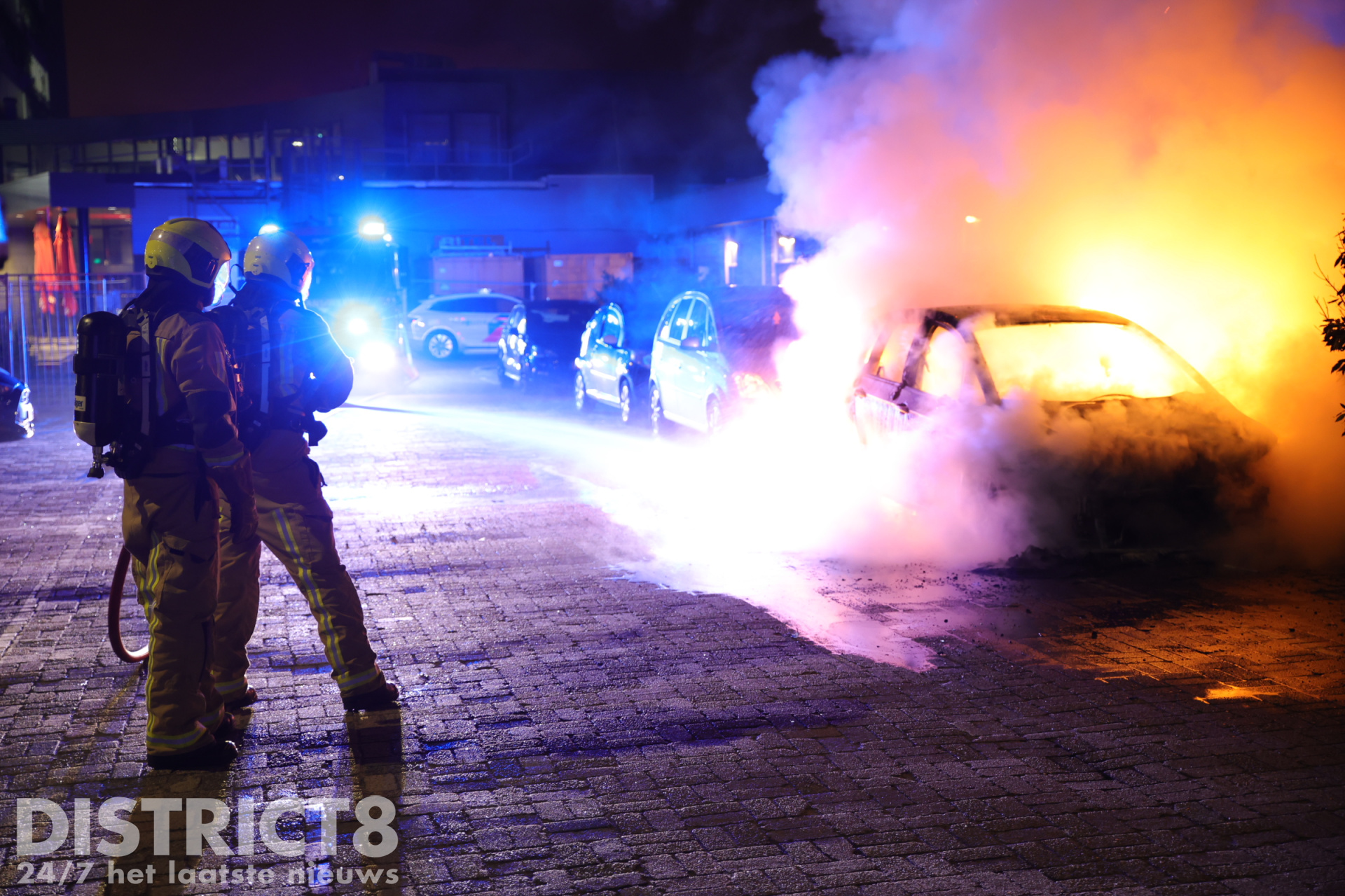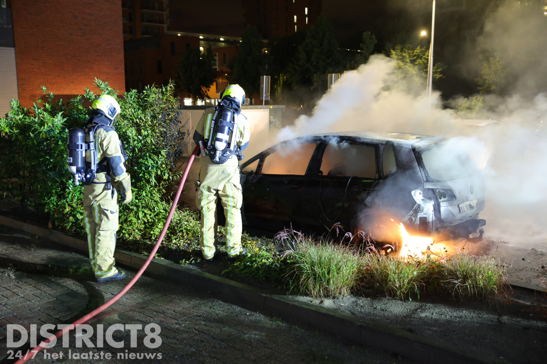Bij aankomst stond de auto al volledig in brand. De brandweer is direct begonnen met het blussen van de vlammen en had veel water nodig om het vuur volledig onder controle te krijgen. Ondanks de snelle inzet kon niet worden voorkomen dat een naastgelegen auto lichte brandschade opliep aan de voorzijde. De brandende auto zelf werd volledig verwoest.