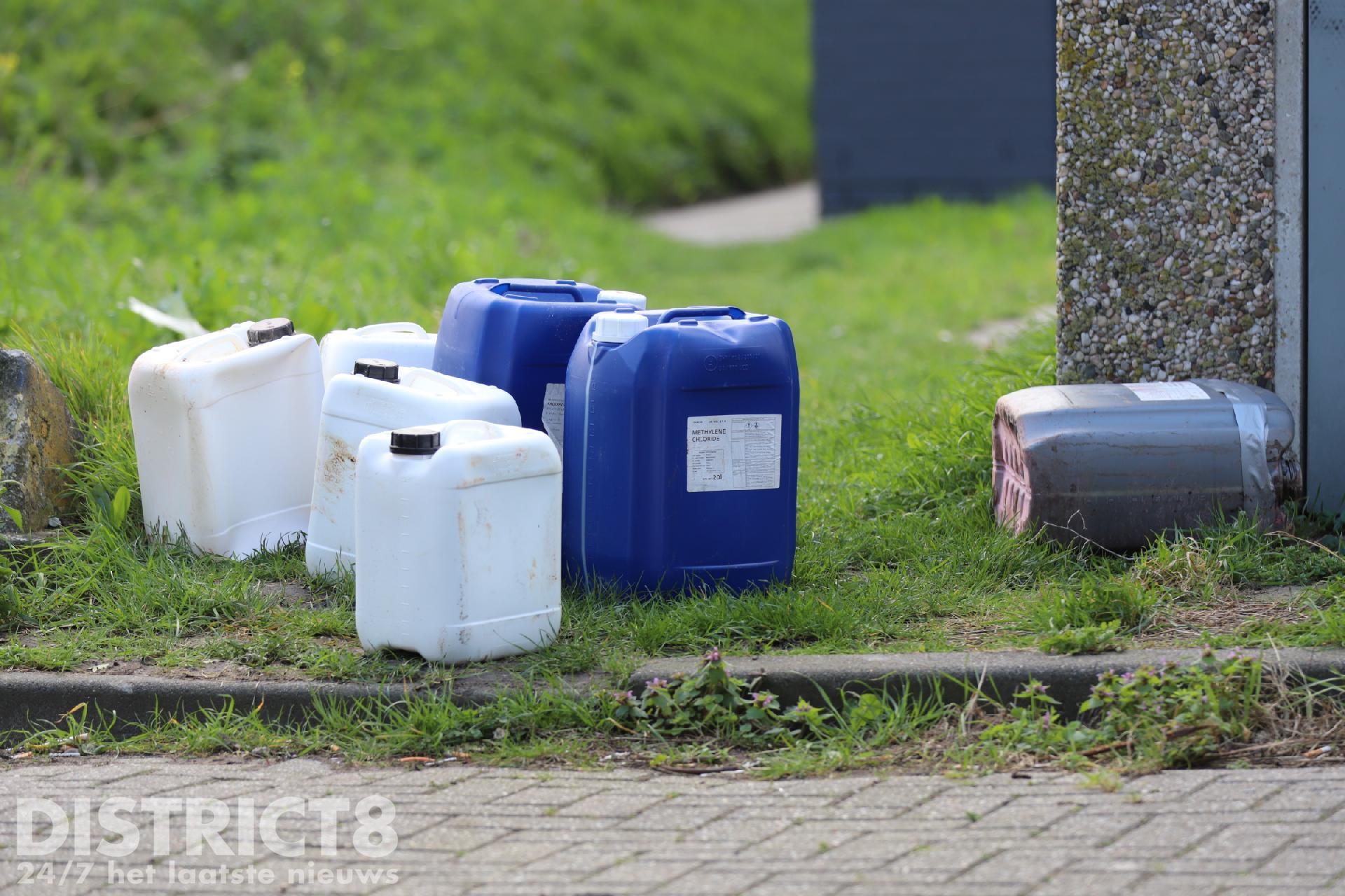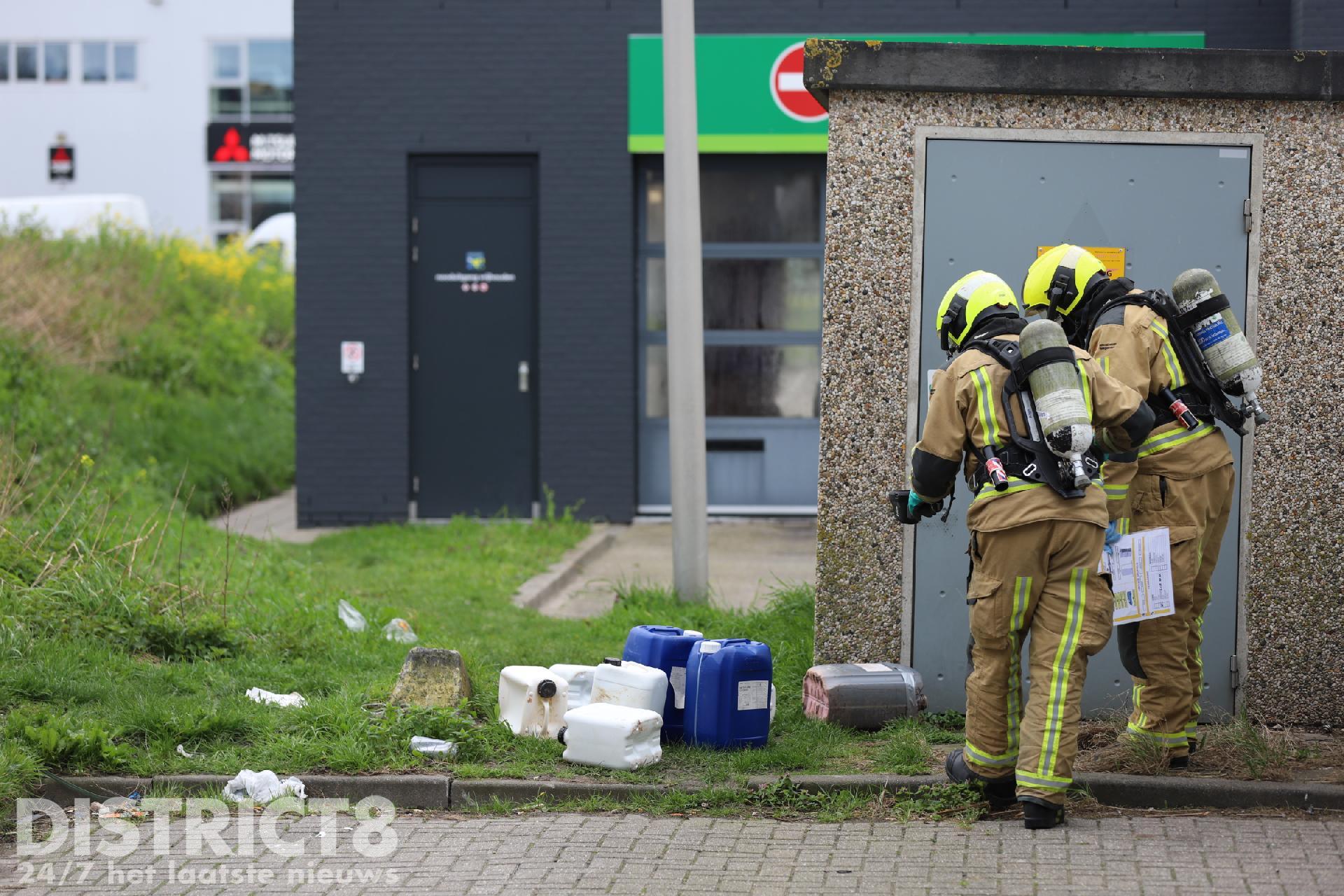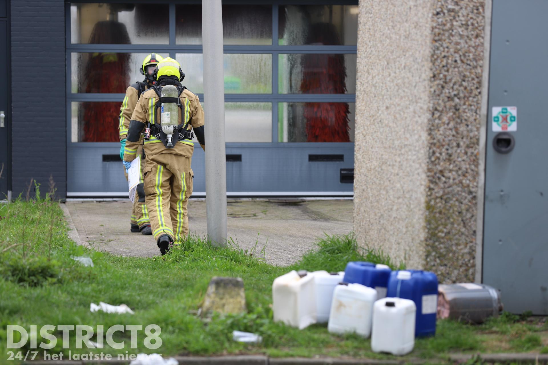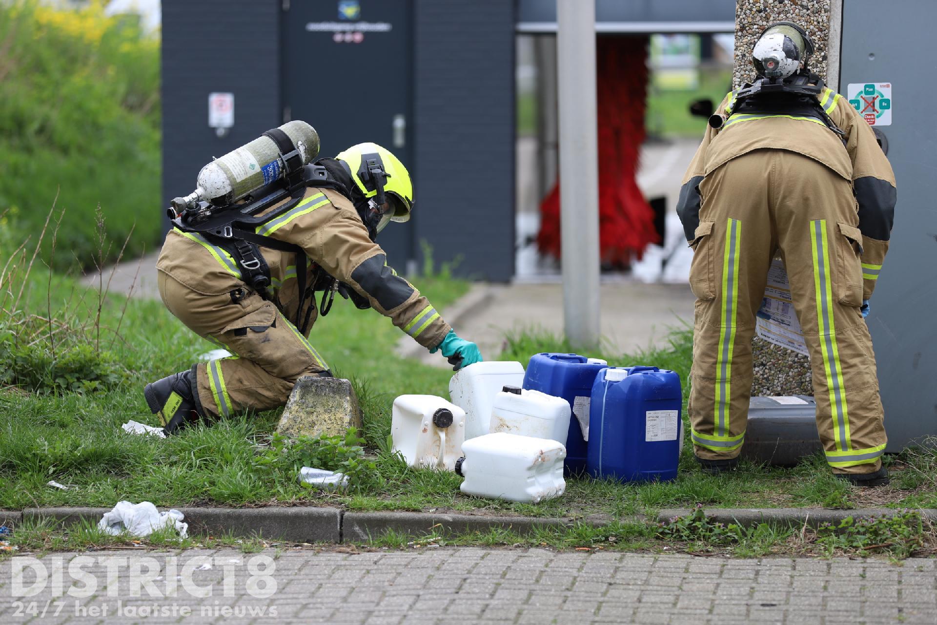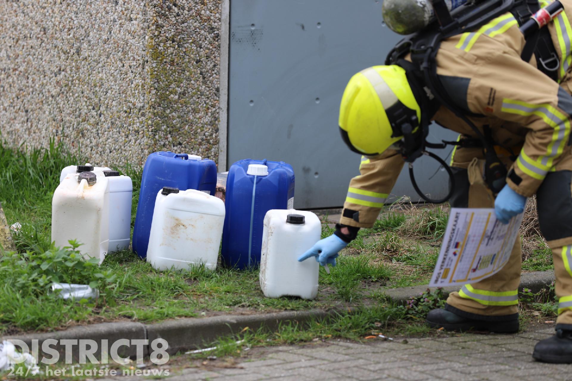 De brandweer doet onderzoek om er achter te komen wat er in de jerrycans zit of heeft gezeten.