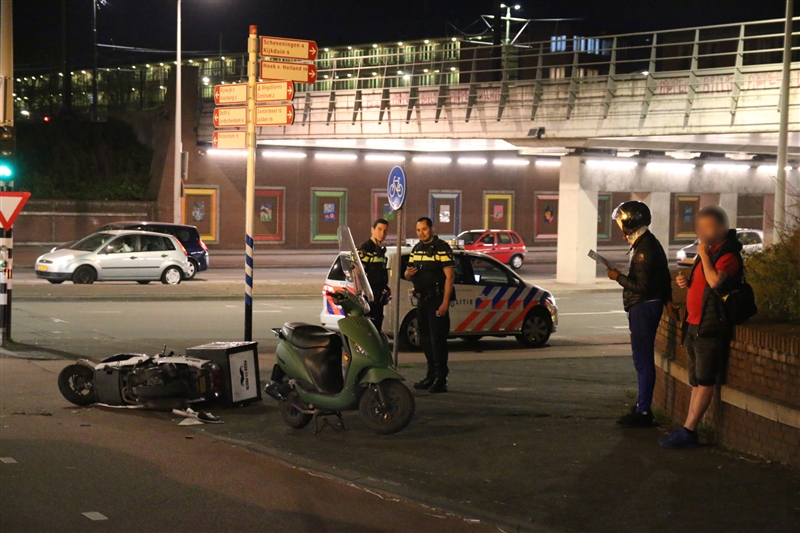Een bezorger op een scooter reed op het fietspad en kwam in botsing met een brommer. Op de brommer zaten twee personen.