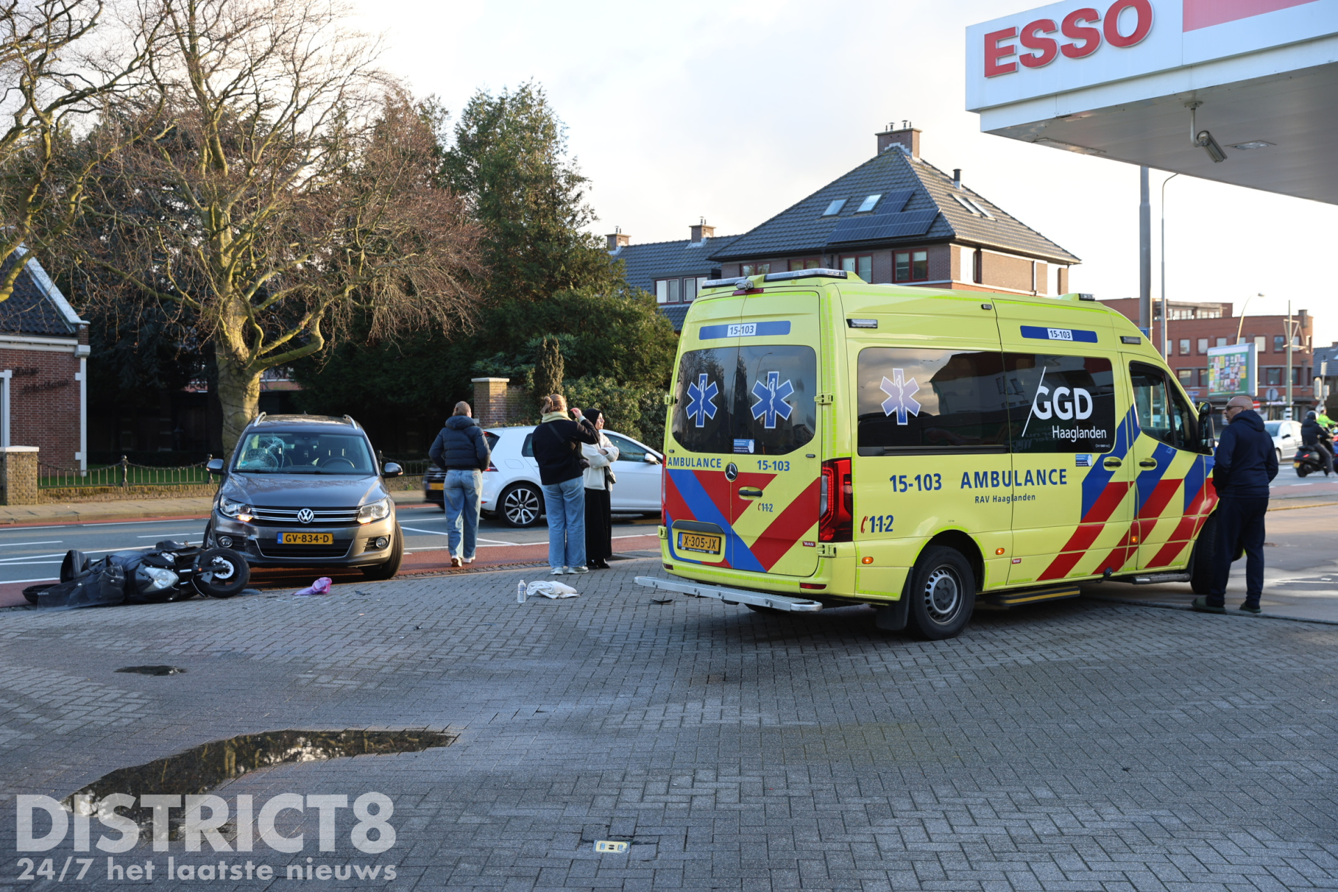 Den Haag – Op zaterdag 14 maart is een scooter met twee personen aangereden door een afslaande auto bij het Esso Tankstation op het Oosteinde in Den Haag. Beide opzittenden raakten bij het ongeval gewond.