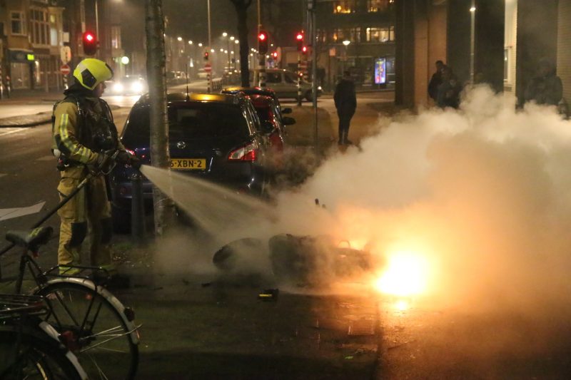 Den Haag – Op de Elandstraat is ter hoogte van de Albert Heijn een scooter omgegooid en in brand gestoken.