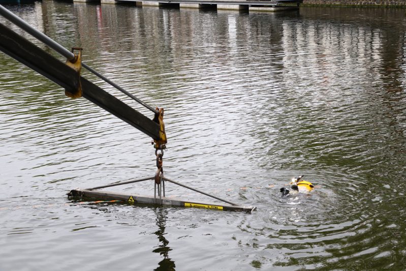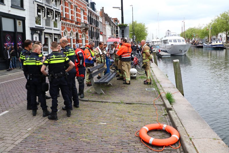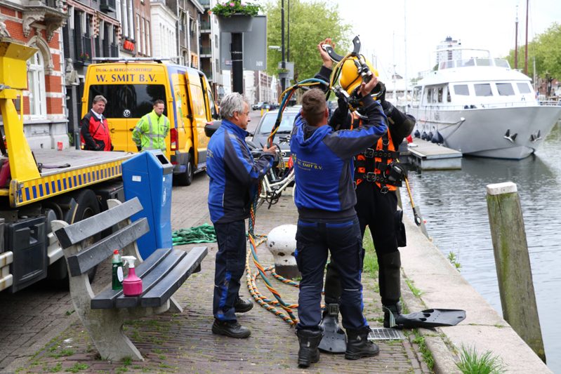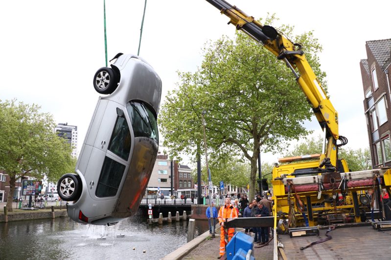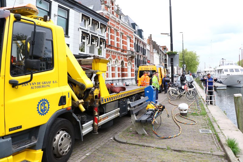 Het duurde nog uren voordat een bergingsbedrijf, die de hulp kreeg van duikers, de auto weer op de kade had.