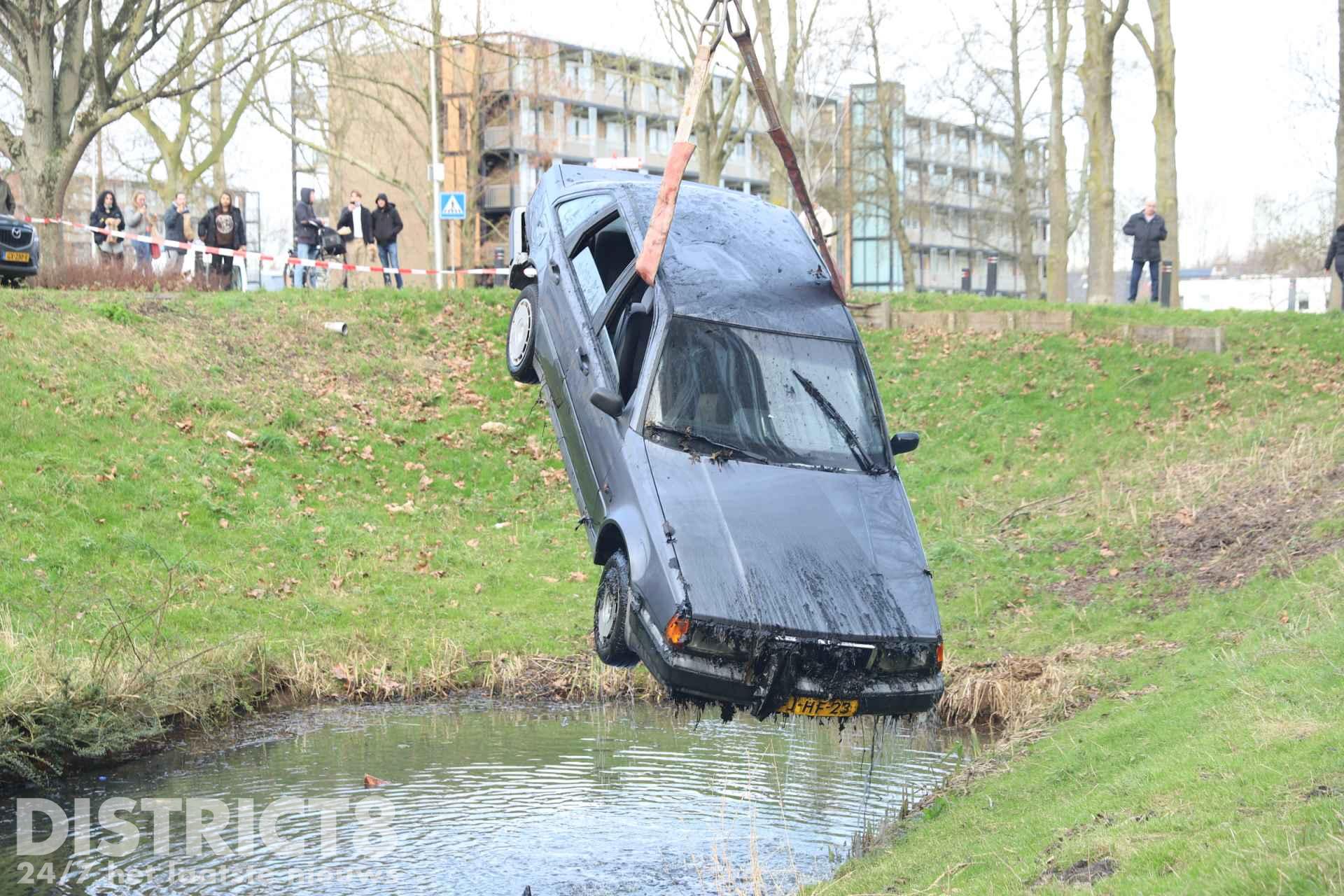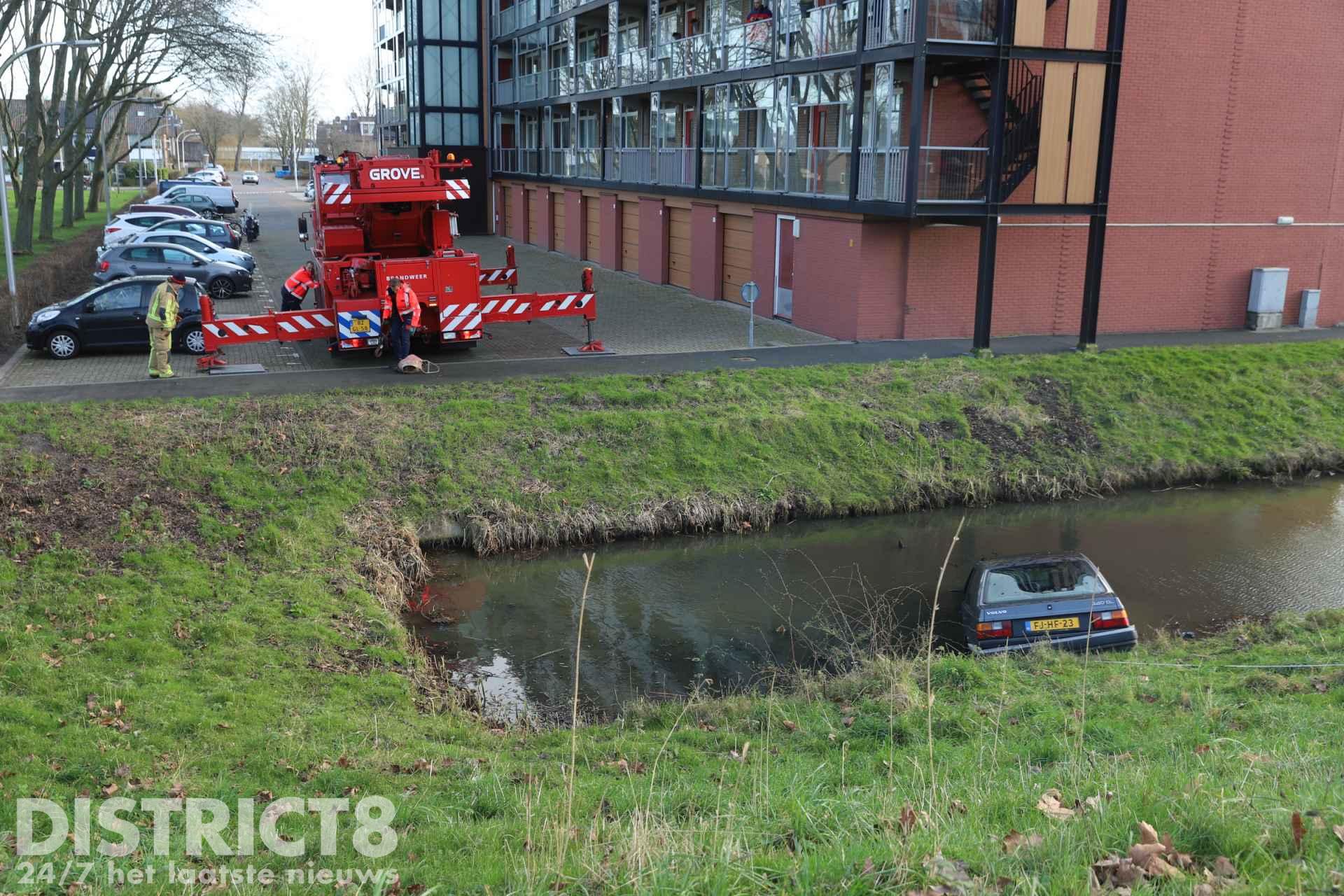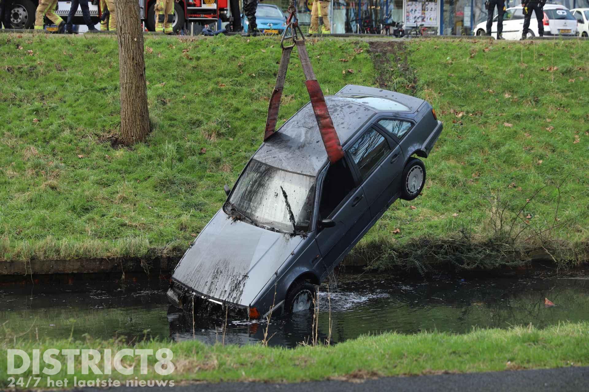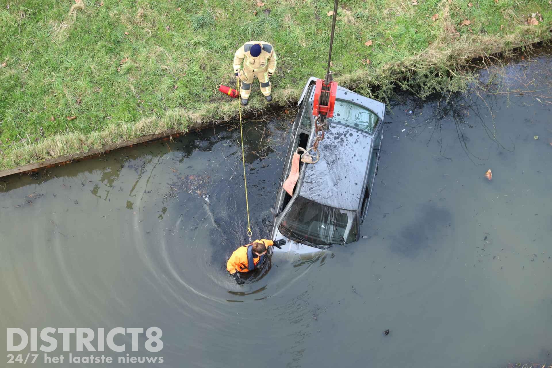 Met behulp van de kraan van de brandweer is de auto uit de sloot gehesen.