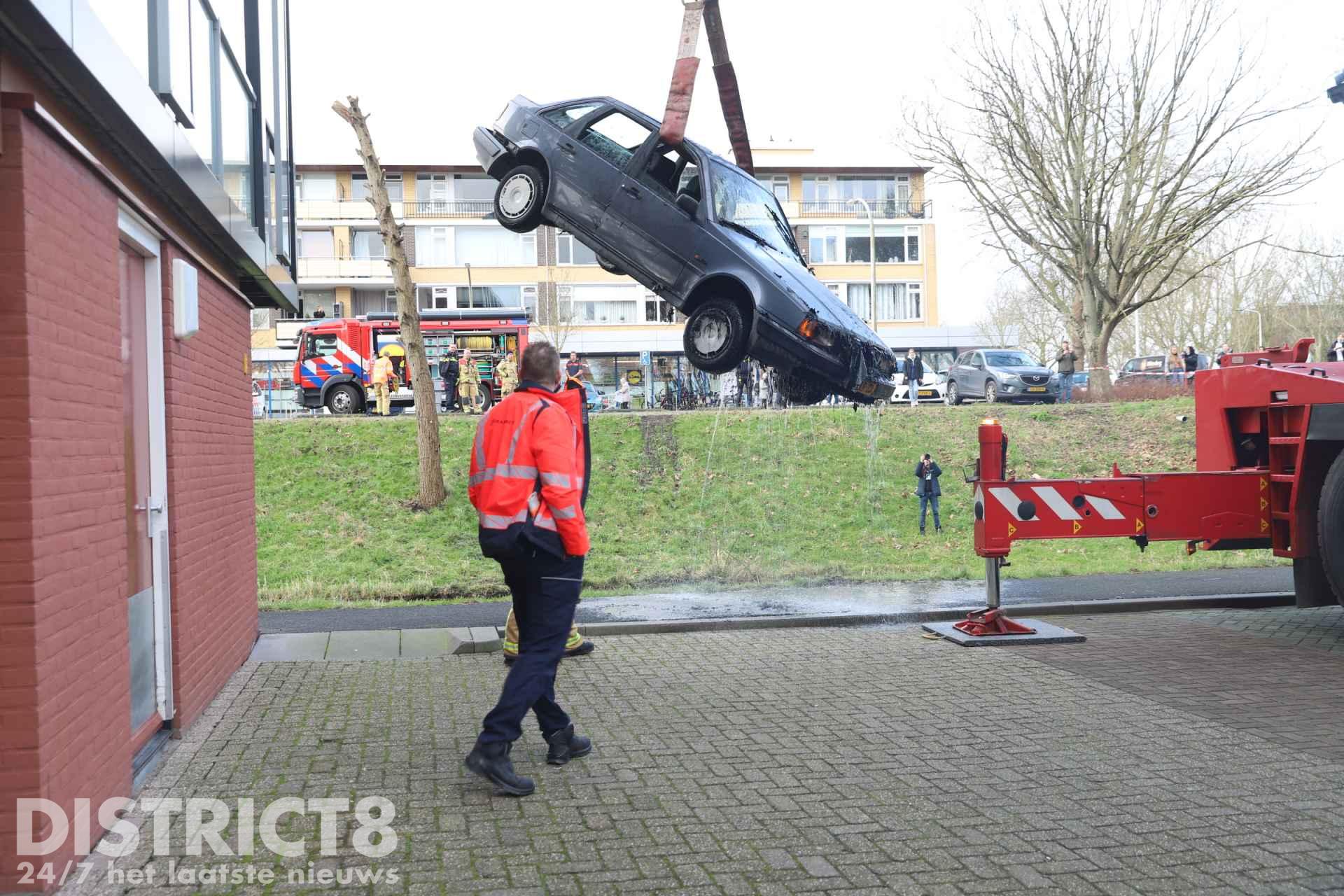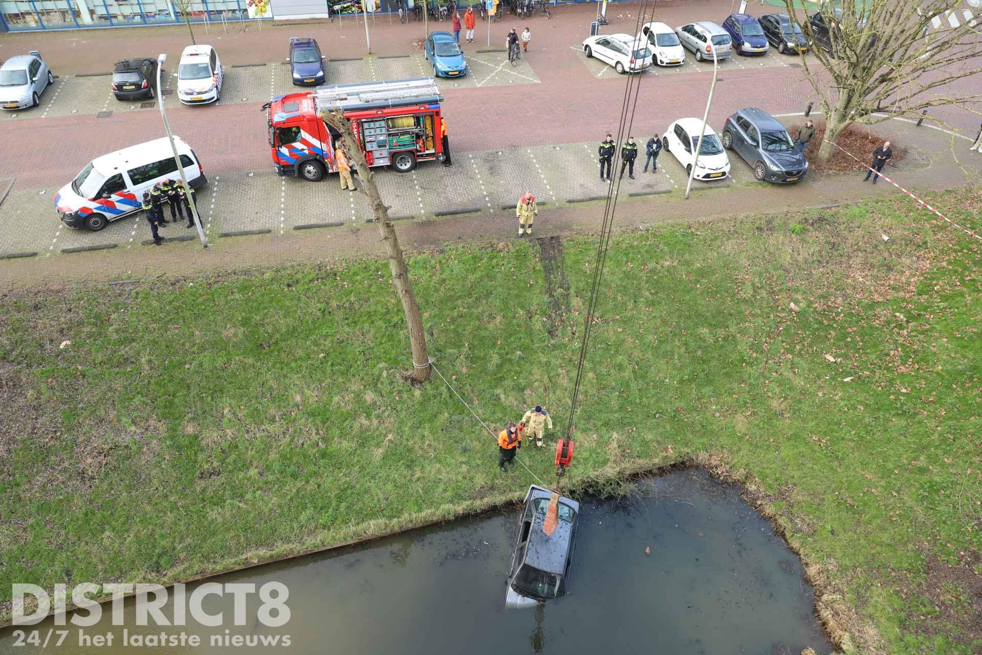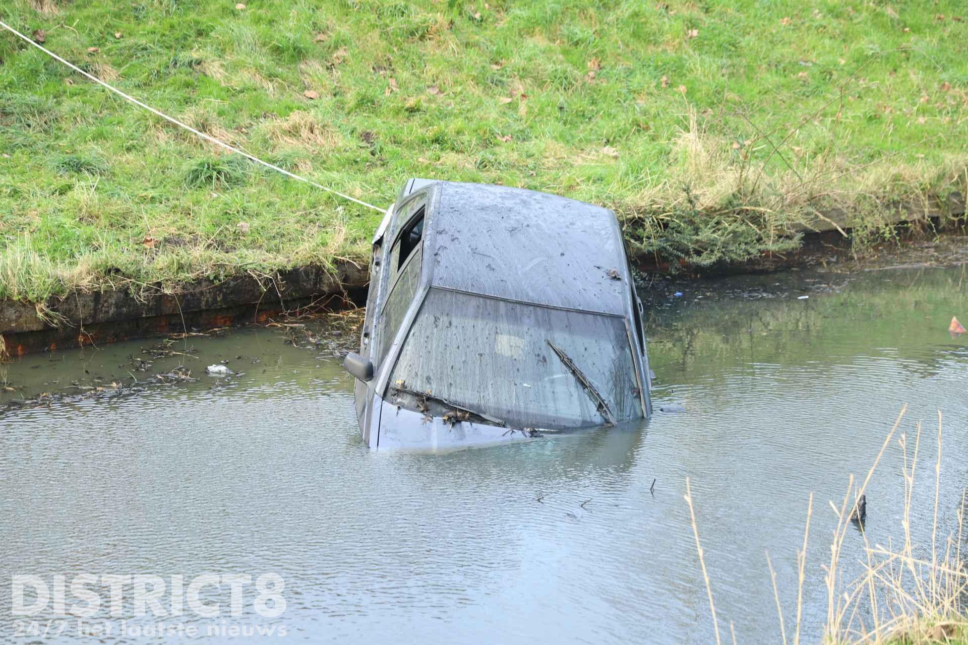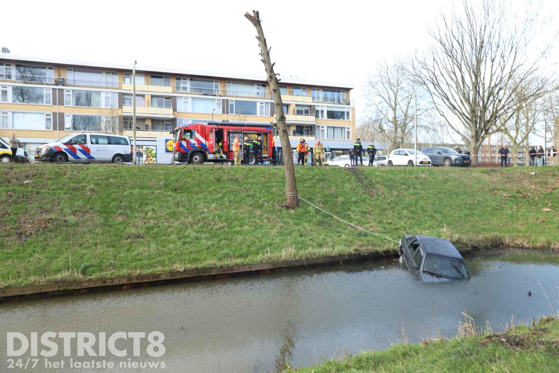 Met behulp van de kraan van de brandweer is de auto uit de sloot gehesen.