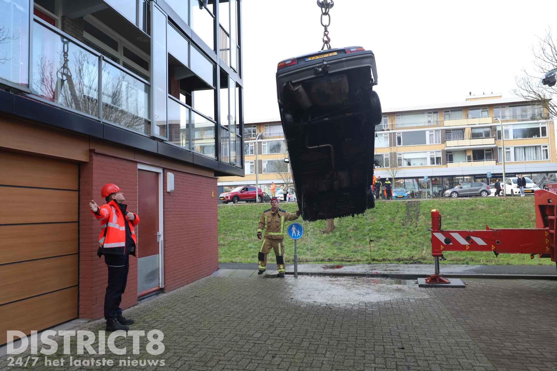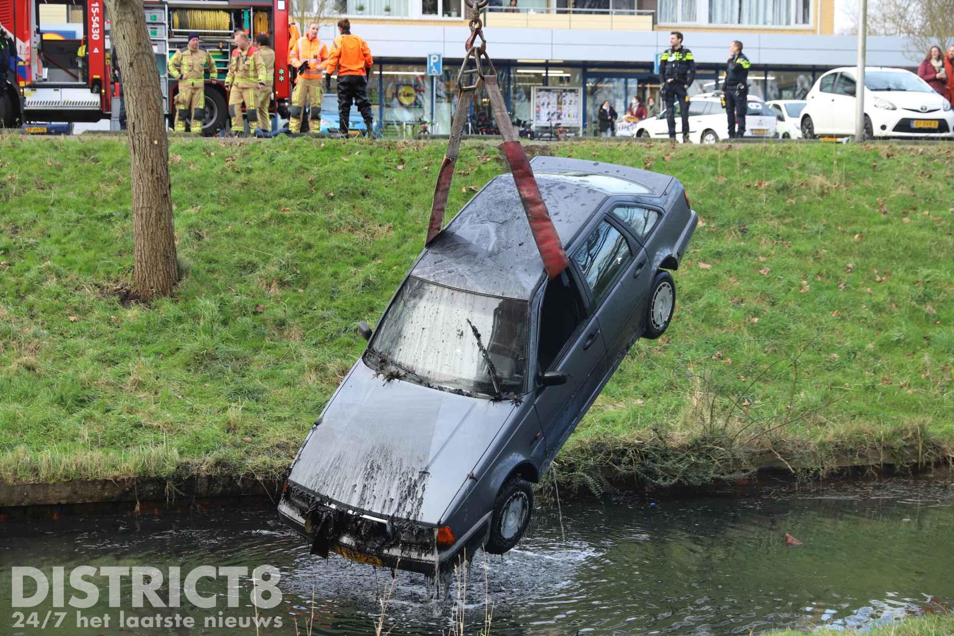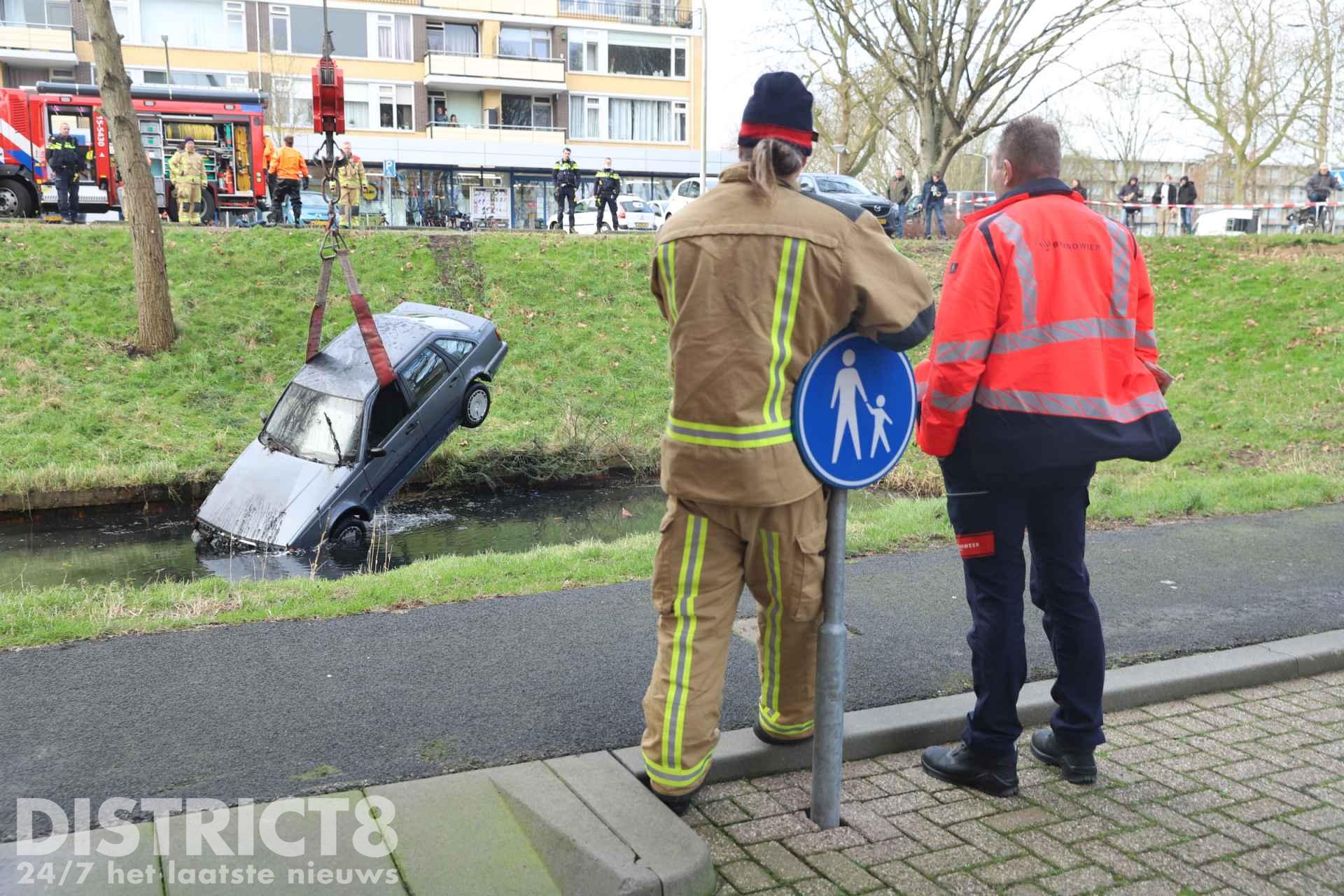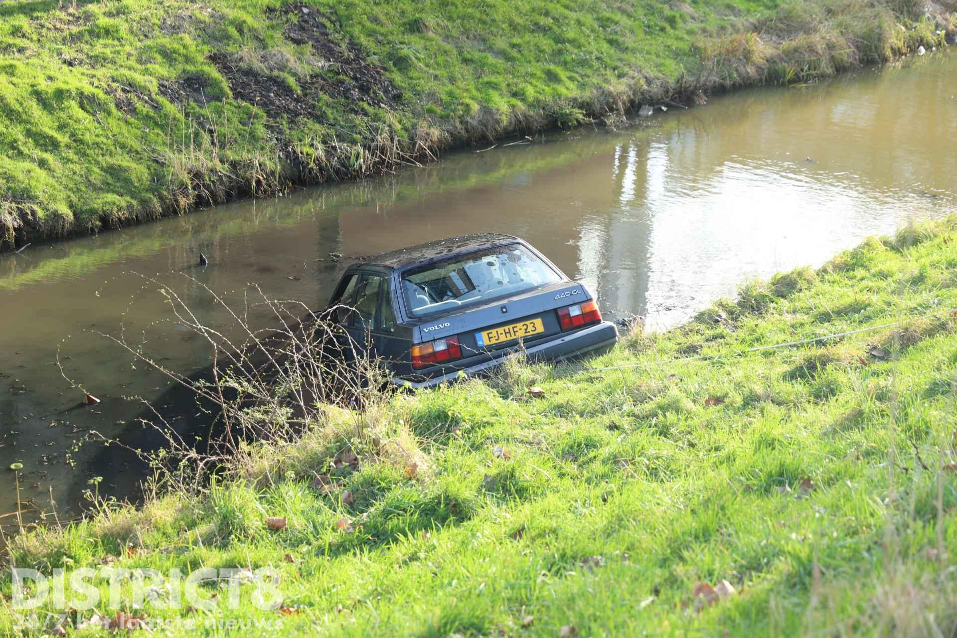 Met behulp van de kraan van de brandweer is de auto uit de sloot gehesen.