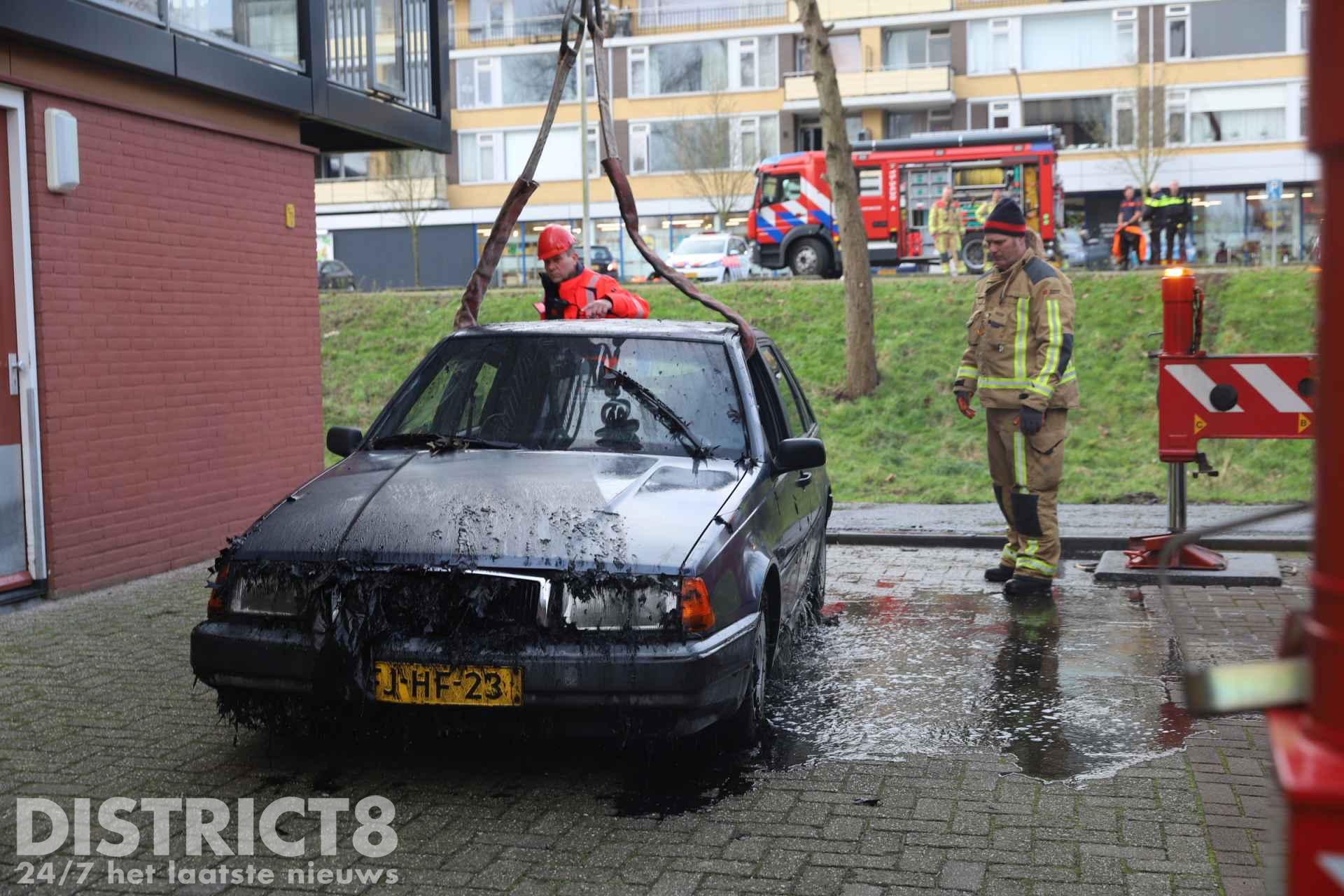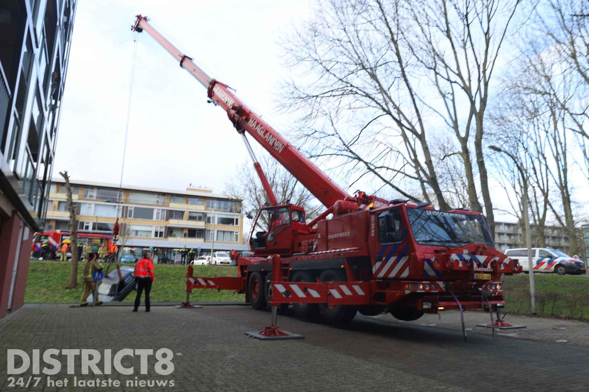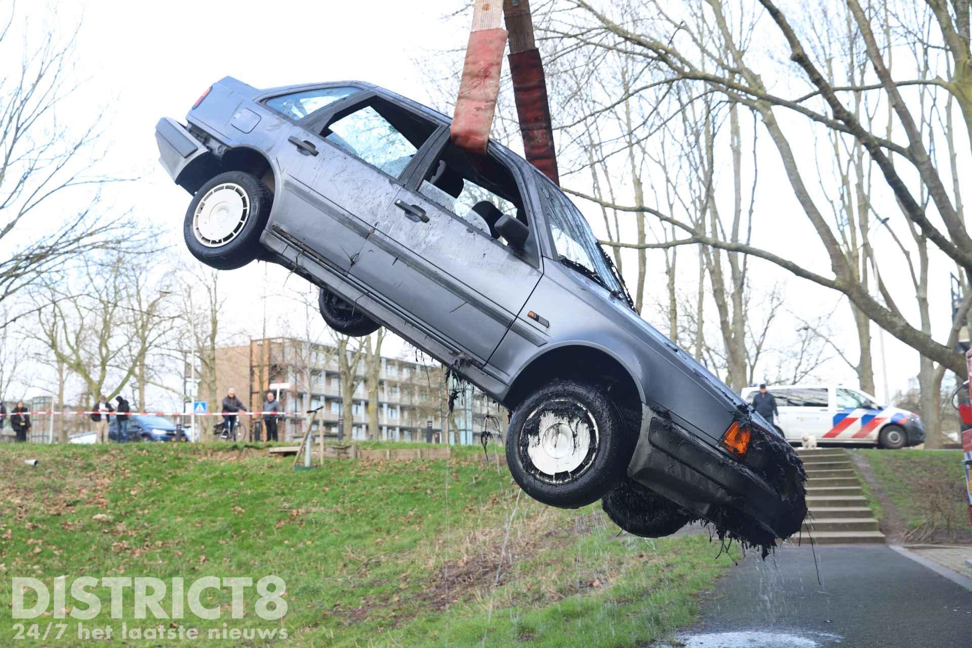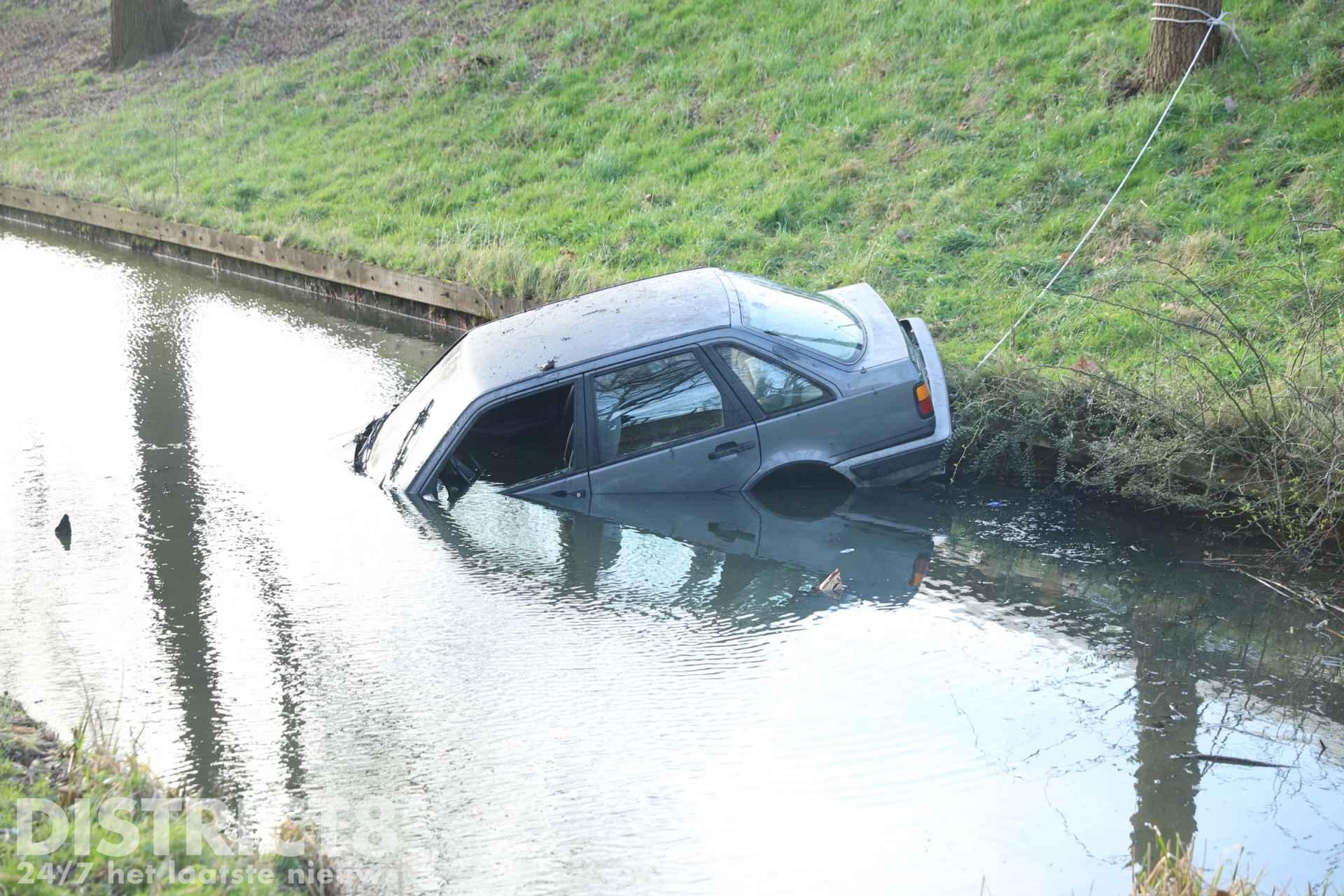 Met behulp van de kraan van de brandweer is de auto uit de sloot gehesen.