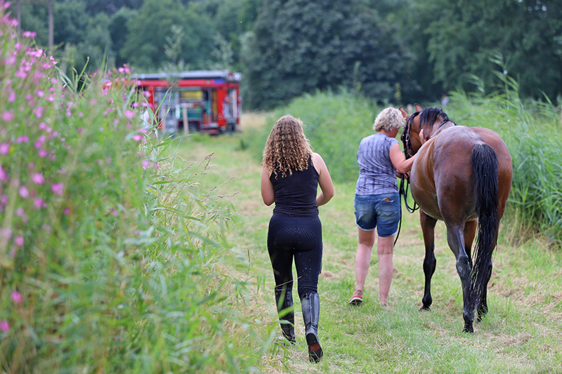 Nadat het paard, waarschijnlijk voor het eerst, heeft ervaren hoe het is om te vliegen, is deze op vier benen op het droge gezet. Hierna konden paard en eigenaar terug naar de manege.