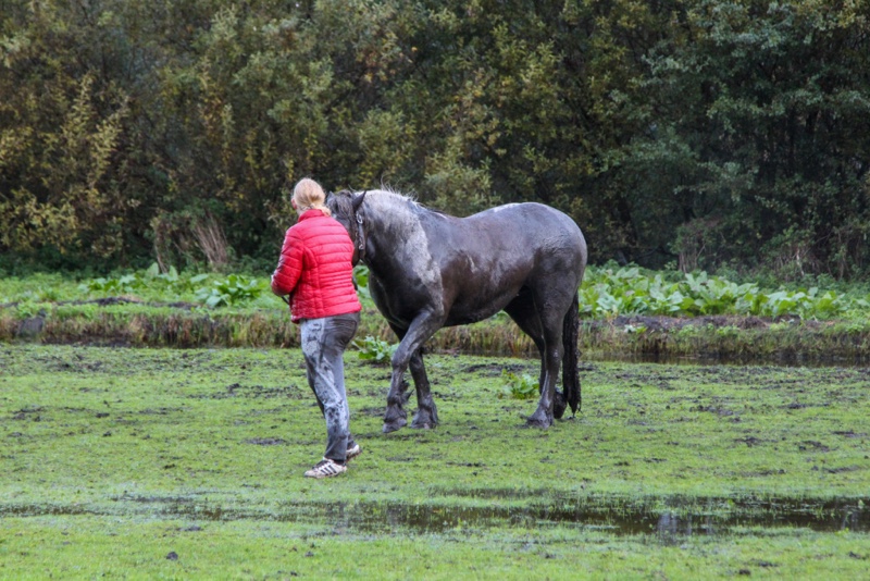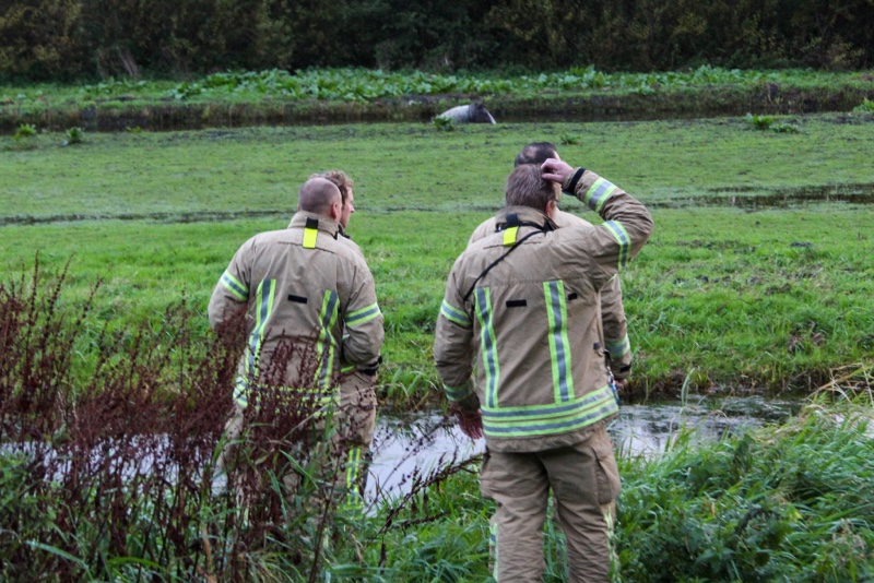 Het dier kon niet meer zelfstandig op de kant komen. De brandweer is ingeschakeld om assistentie te verlenen. Het weiland was echter dermate lastig bereikbaar dat er niets anders op zat dan om te rijden richting Groenelaan en vandaar uit een stuk te lopen.