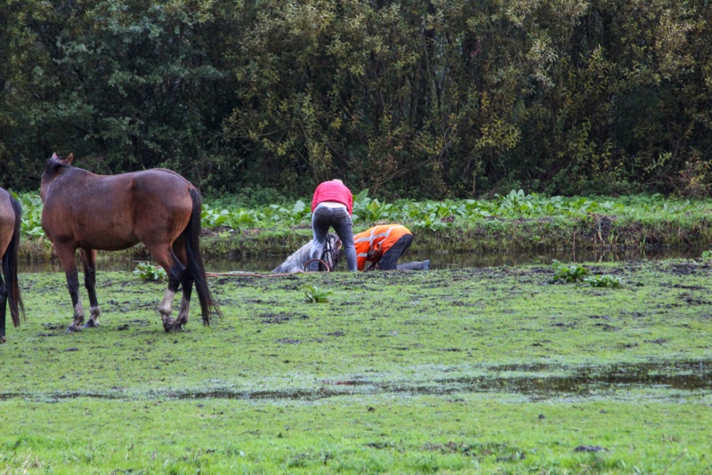 Schiedam – Maandagmorgen zag een voorbijganger tijdens een wandeling op het Dilleveld in een weiland een paard in de sloot liggen.