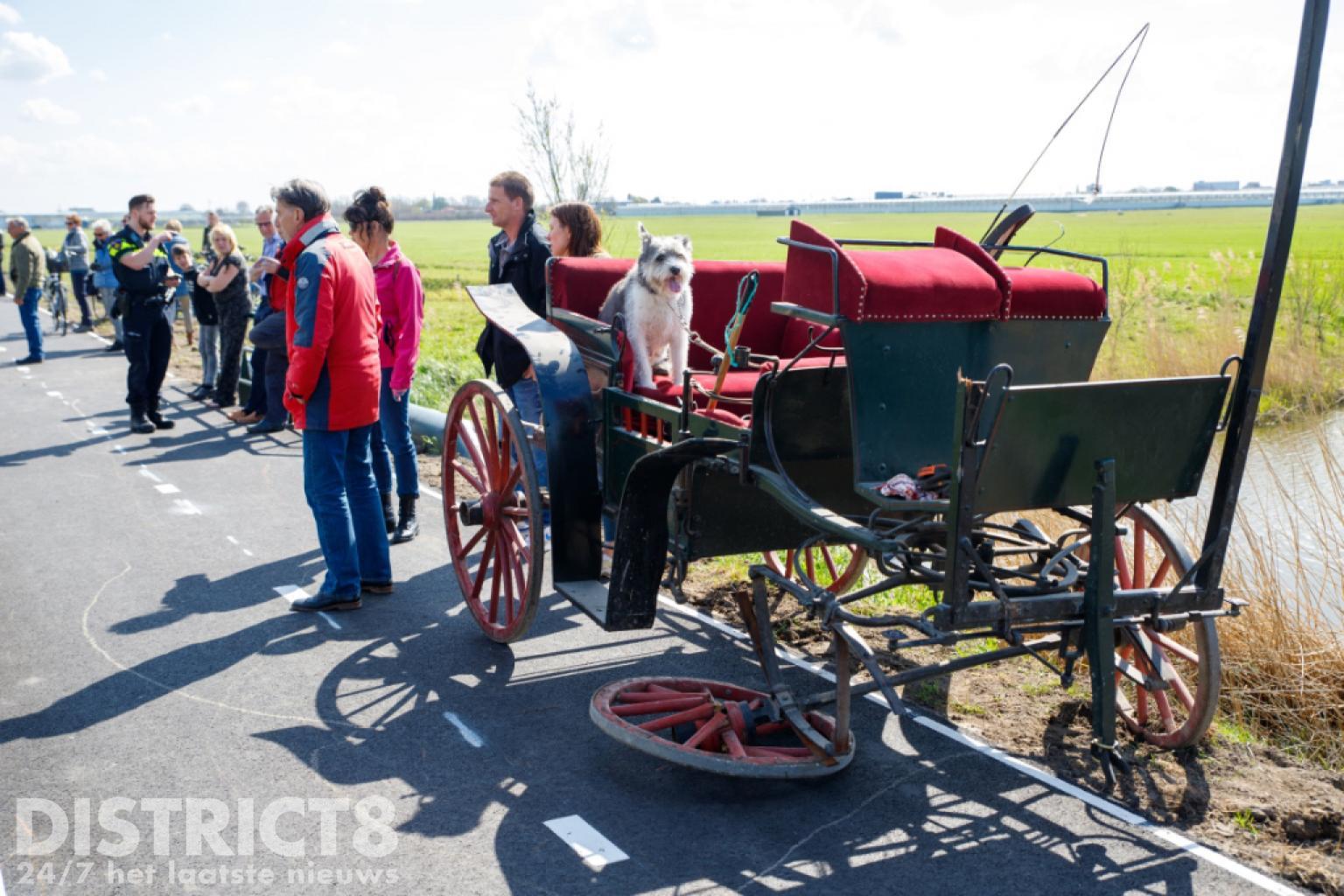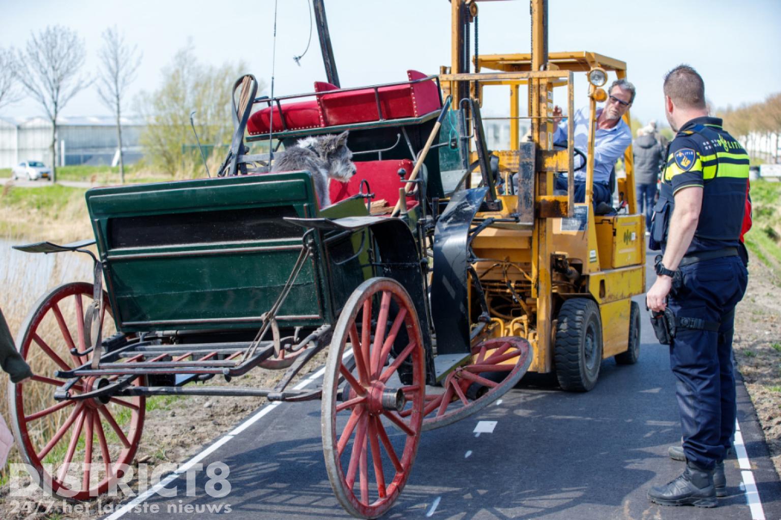 De Lier – Zondagmiddag om 14:36 werden de hulpdiensten gestuurd naar de Scheeweg. Een paard was te water geraakt doordat een wiel van het rijtuig was afgebroken. Het ongeval gebeurde op het fietspad tussen Maasland en De Lier. Een ambulance is gekomen om de koetsier na te kijken, deze man had een flinke hoofdwond opgelopen nadat het wiel was afgebroken van het rijtuig. De man is voor verdere controle overgebracht naar het ziekenhuis.