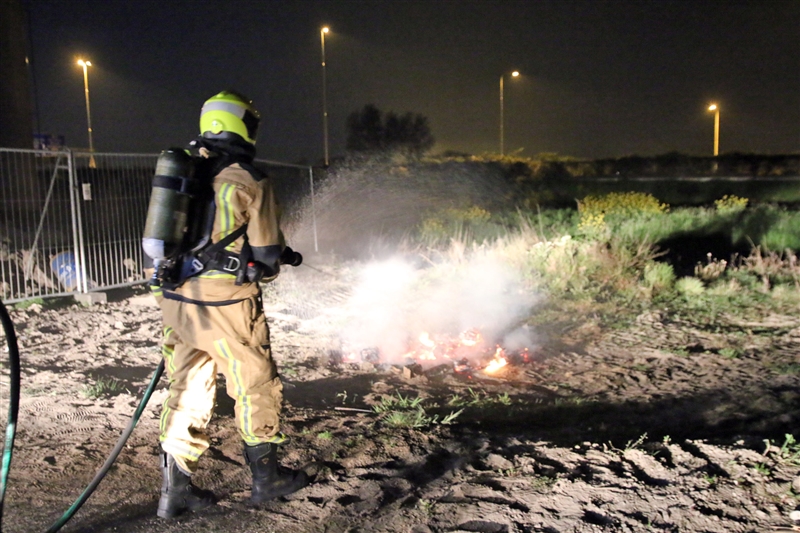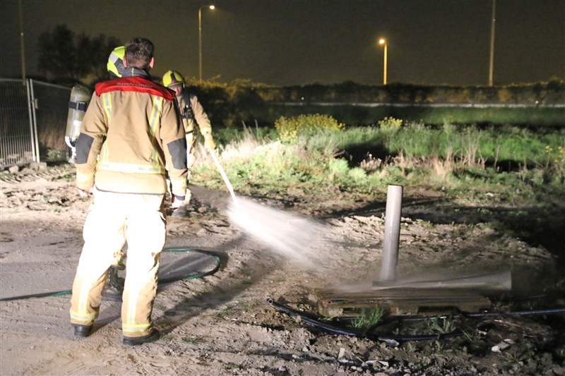 Een andere pallet is natgespoten om te voorkomen dat de brandweer opnieuw moet uitrukken. Net voor aankomst van de brandweer reed een auto met twee inzittende weg bij de brandende pallets. Of zij hier iets mee te maken hebben is niet bekend.
