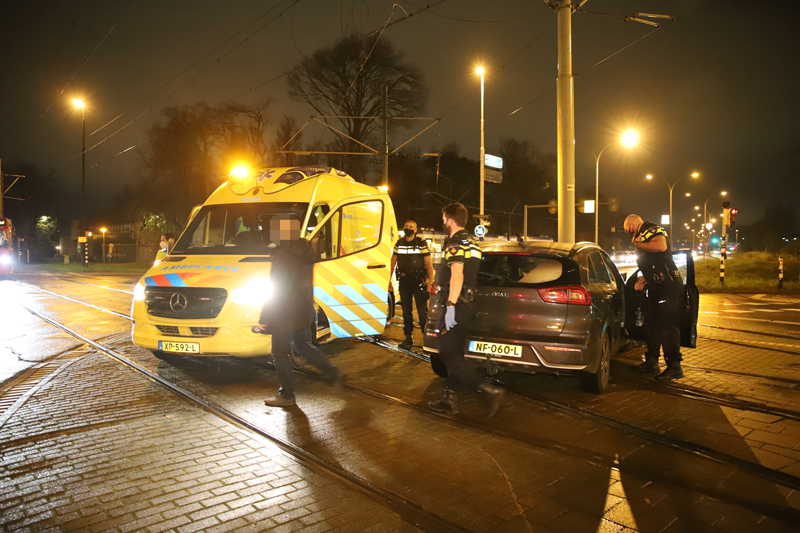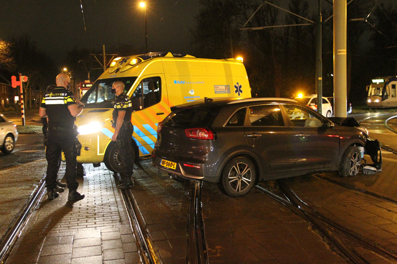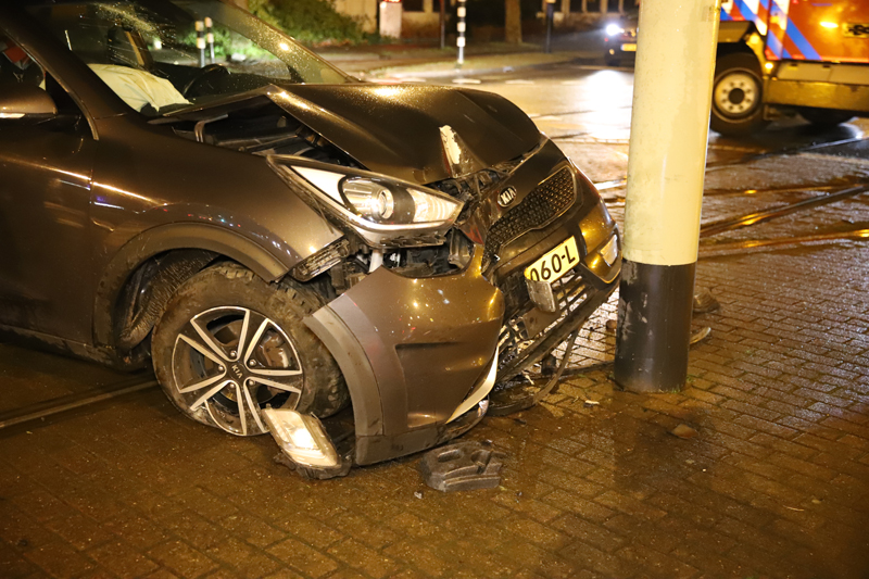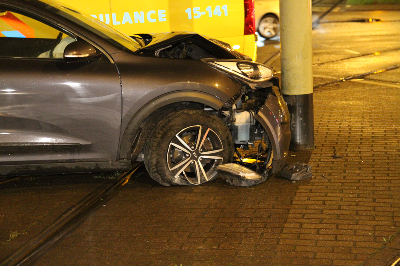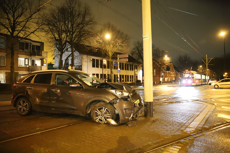 De automobilist blijkt op de Broekmolenweg een stuk over het trottoir gereden te hebben, waar hij een klapband heeft gekregen en tegen de mast van de bovenleiding van de HTM tot stilstand is gekomen.