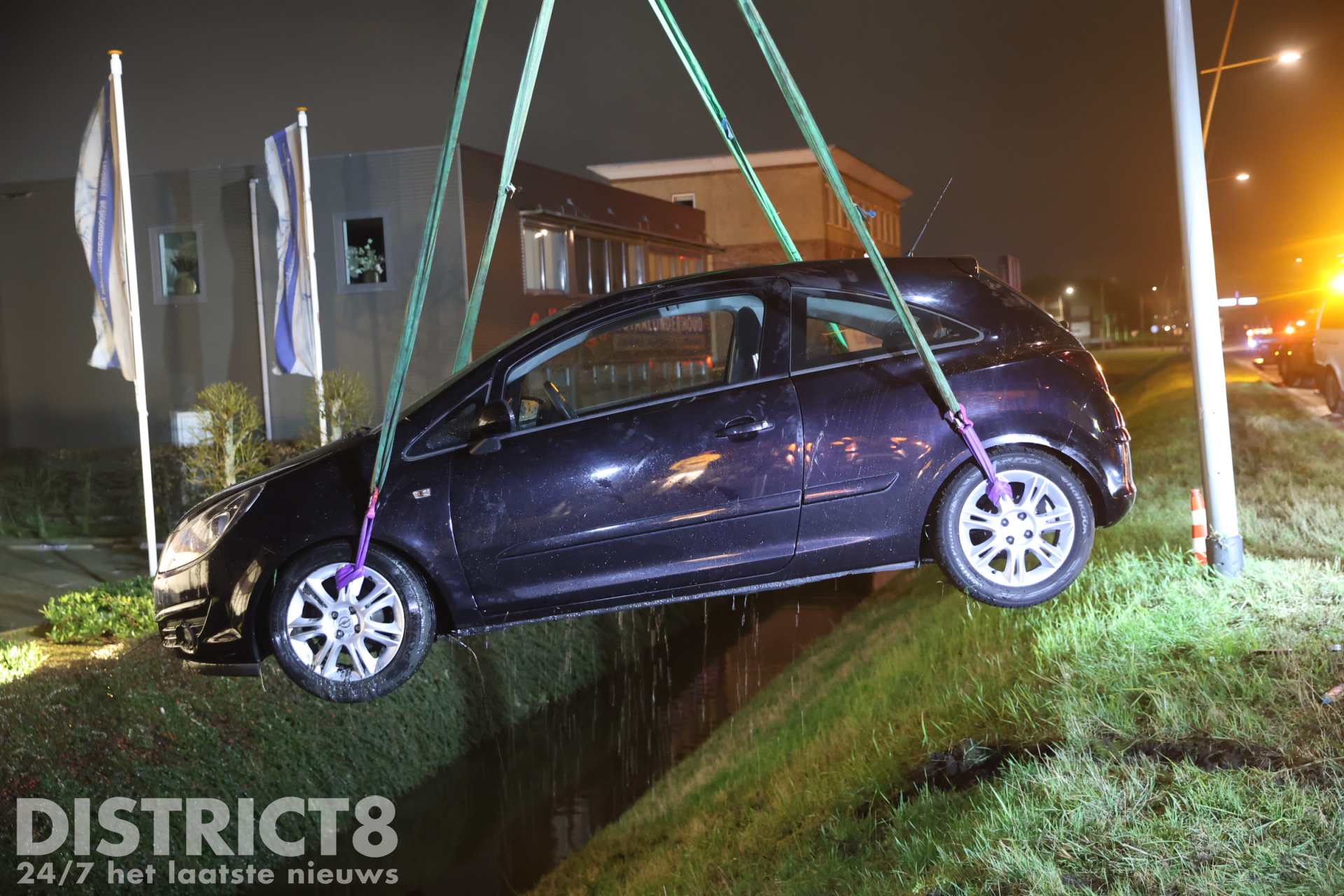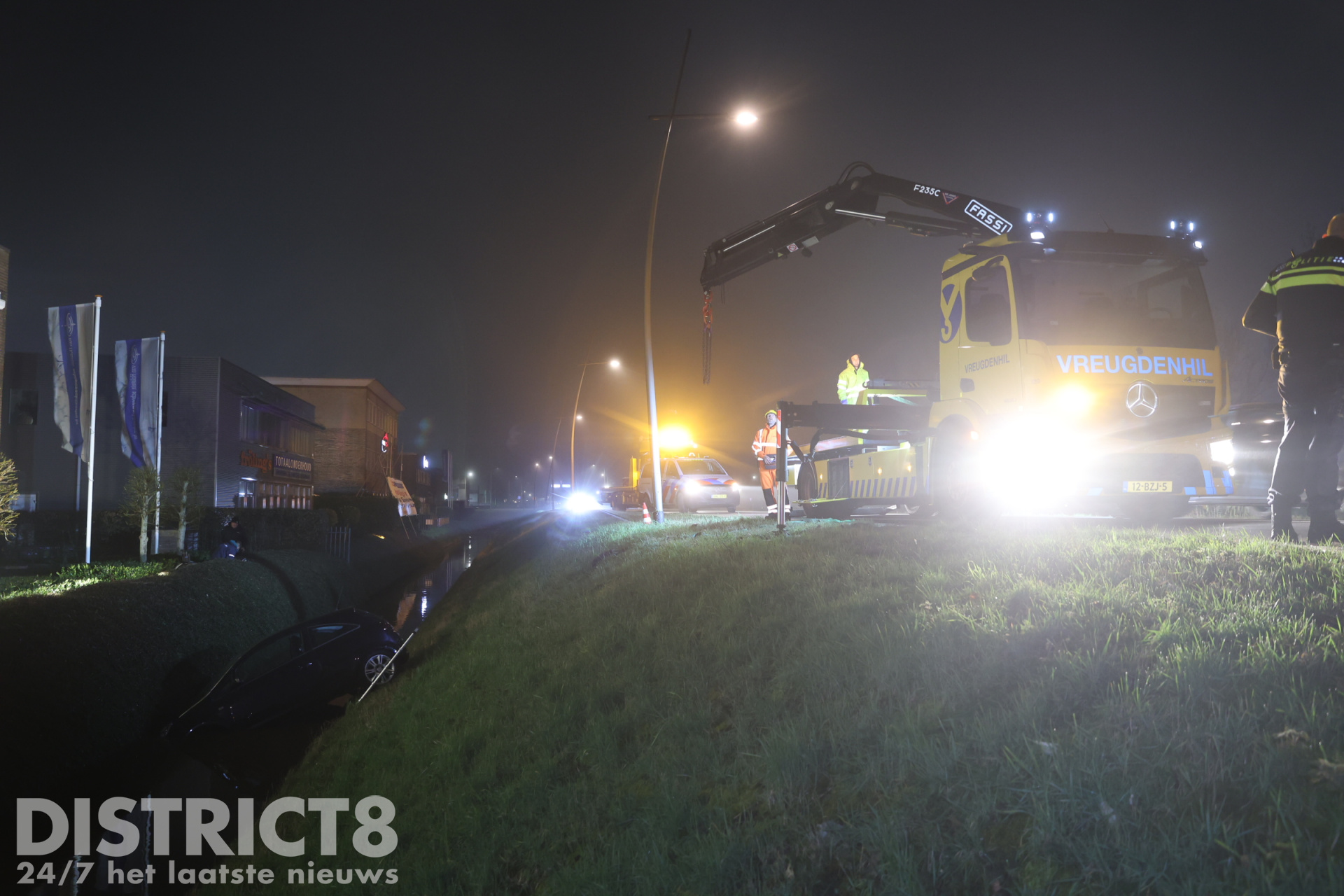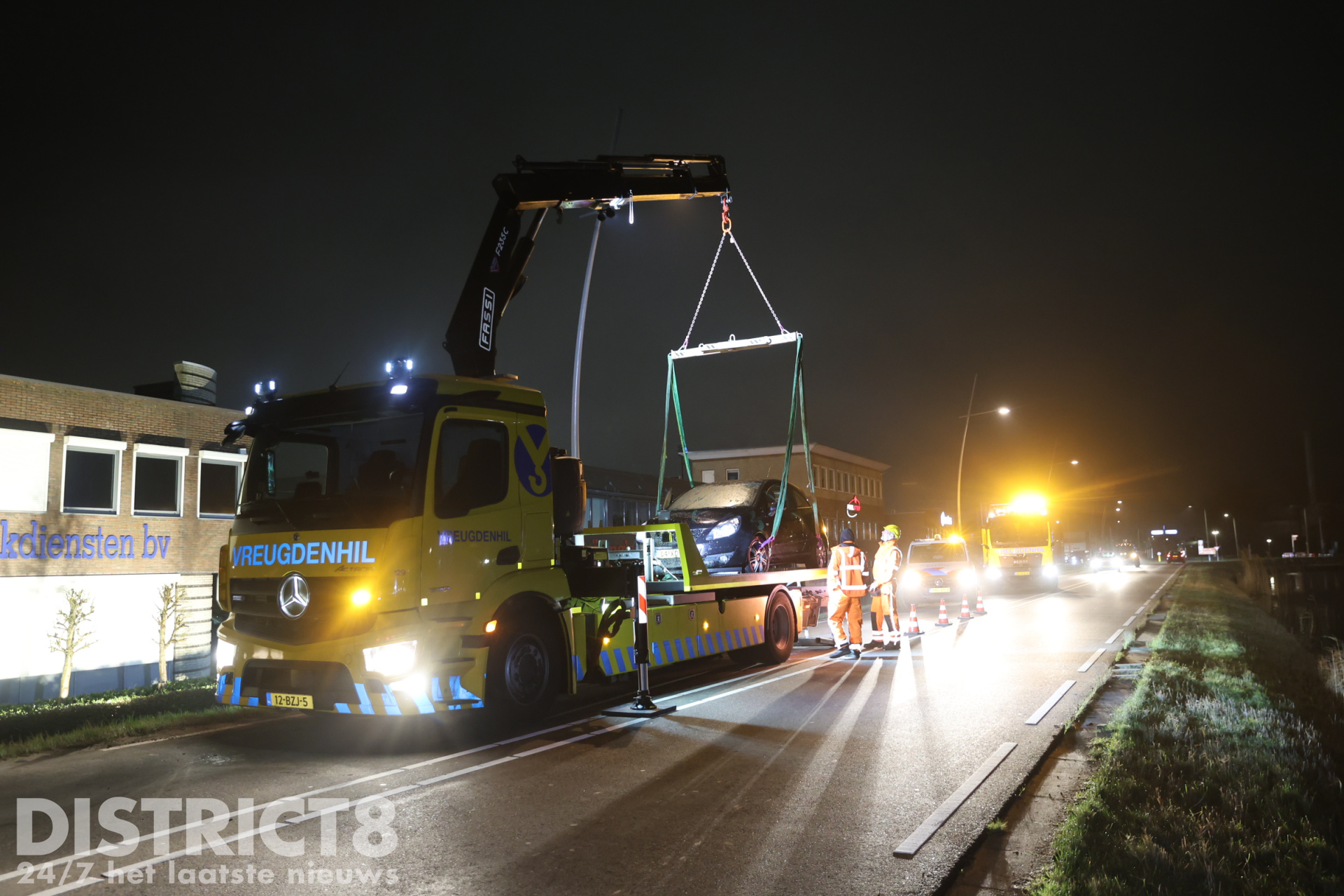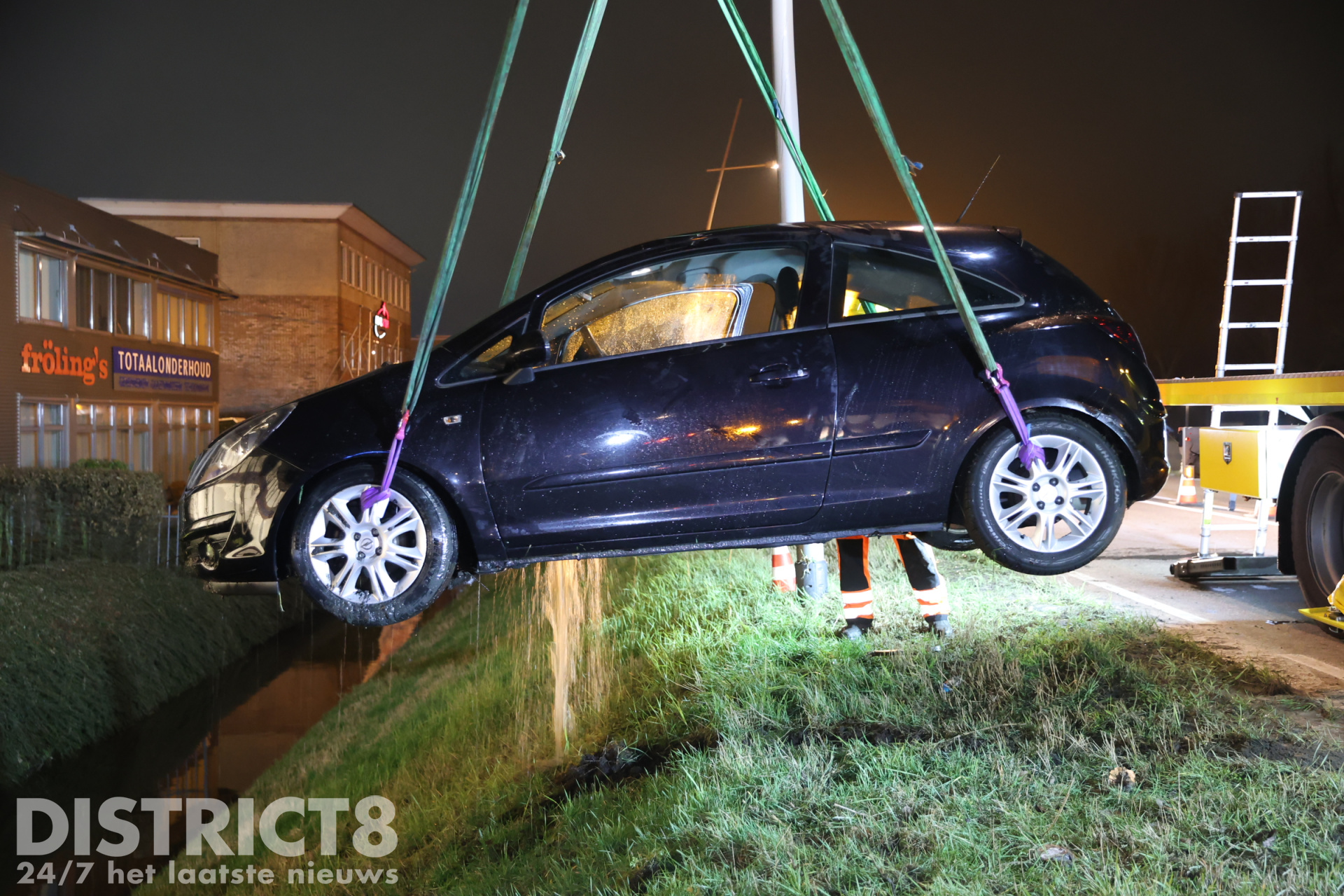Hoe de automobilist te water kon raken is niet bekend, een berger van bergingsbedrijf Vreugdenhil heeft de auto uiteindelijk met een kraan uit het water getakeld.