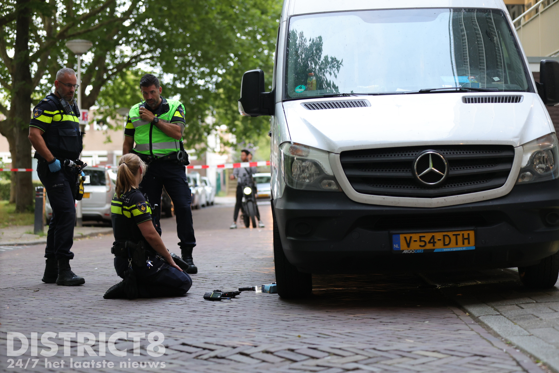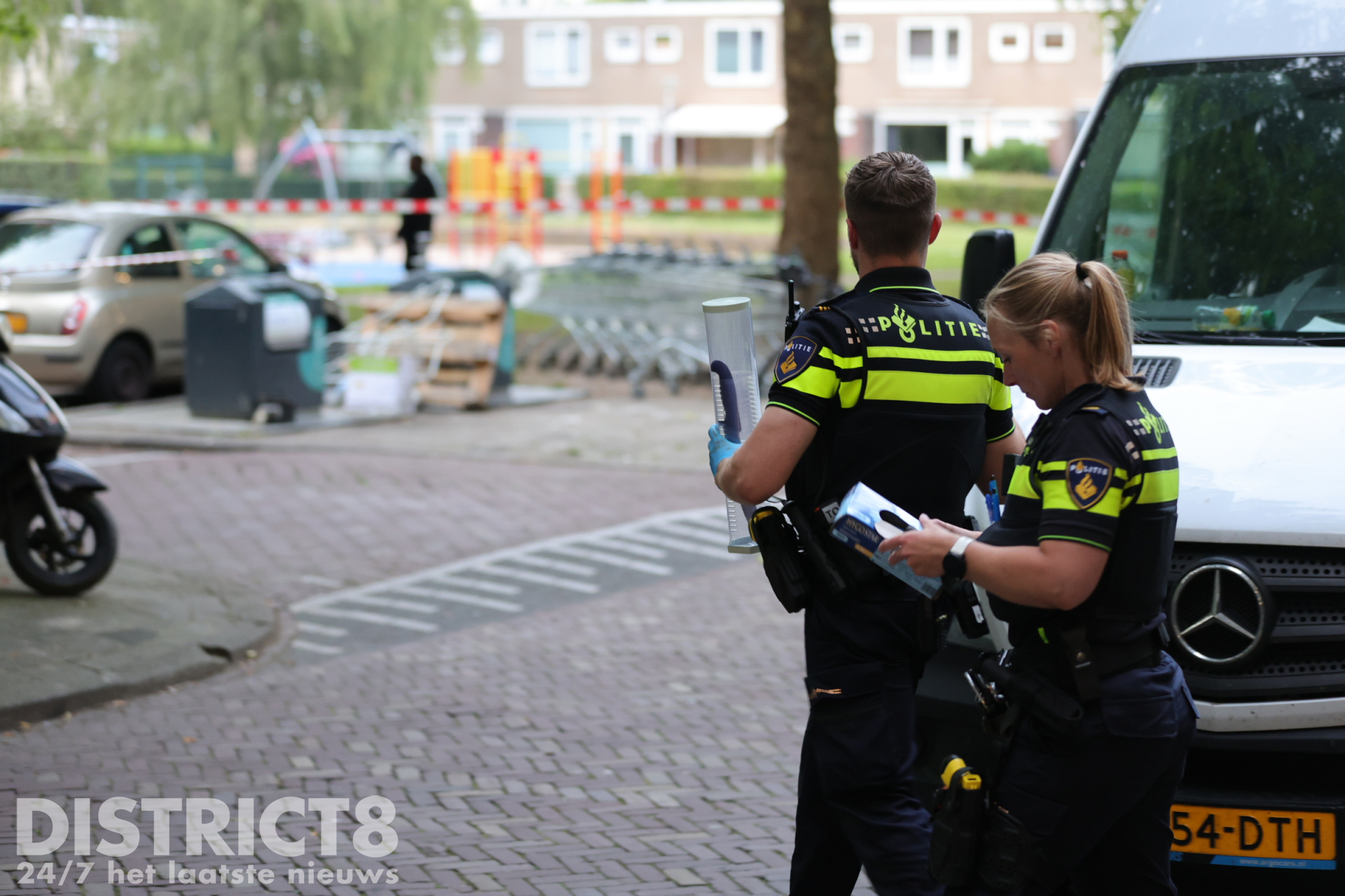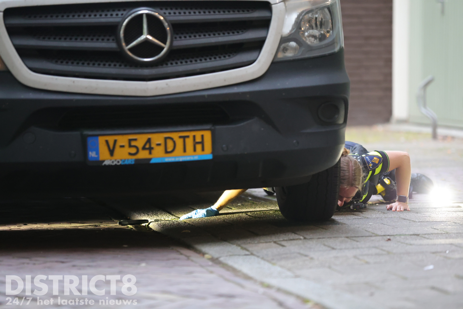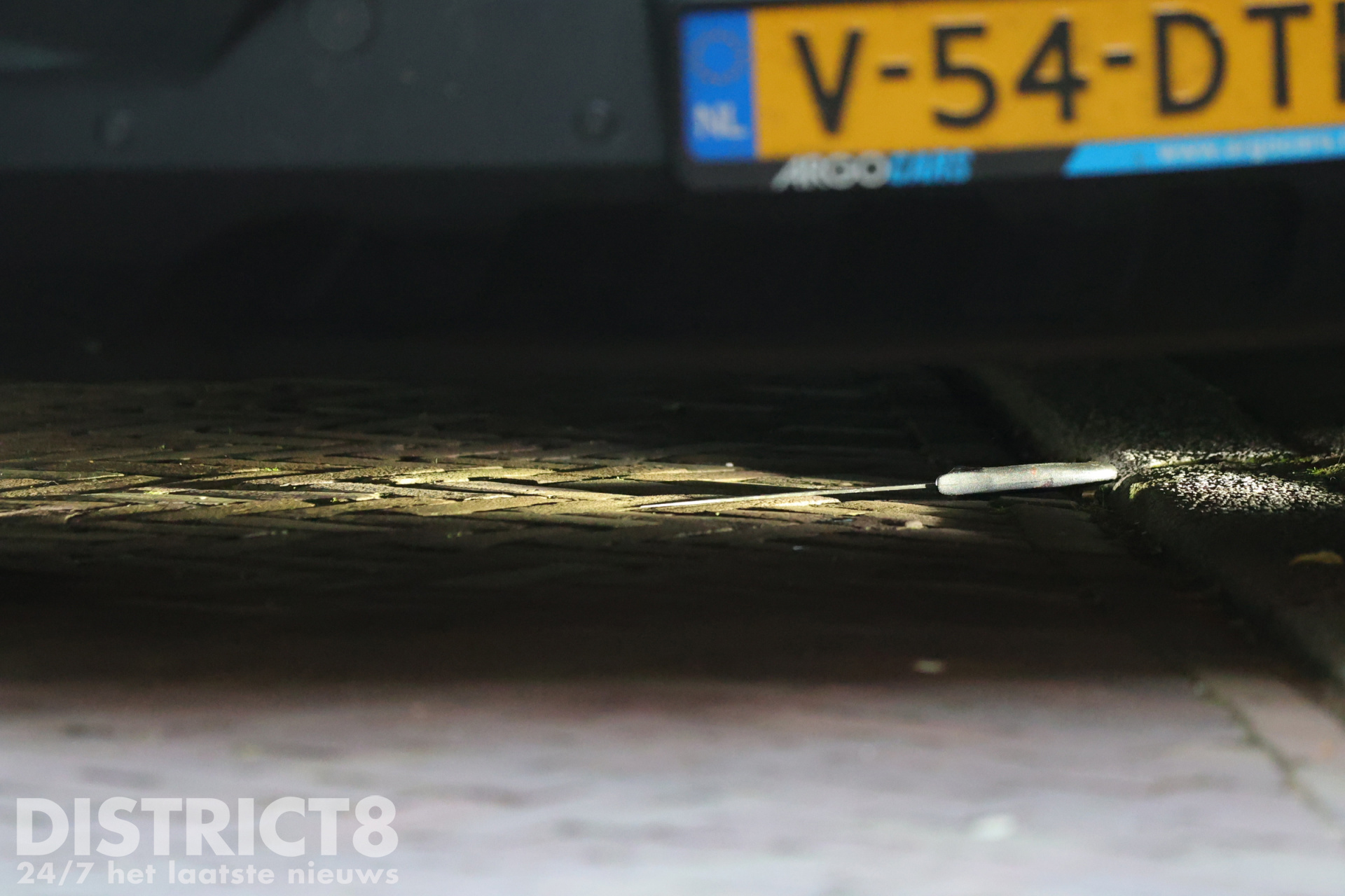 Uiteindelijk hebben agenten onder een witte bestelbus een groot jachtmes gevonden. Deze is in een speciale koker meegenomen om sporen op het mes veilig te houden.