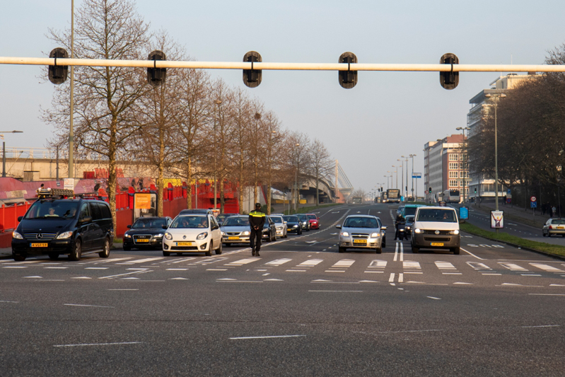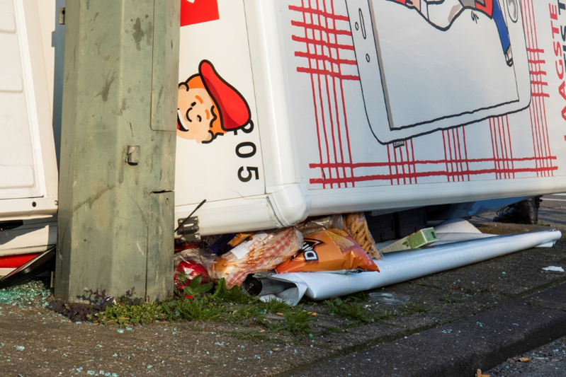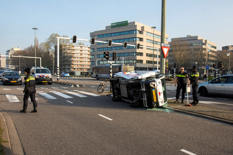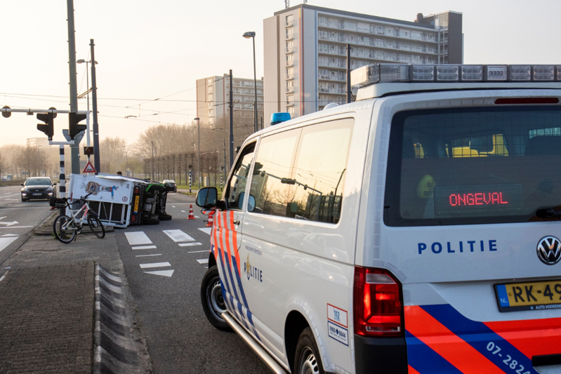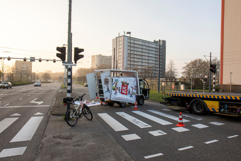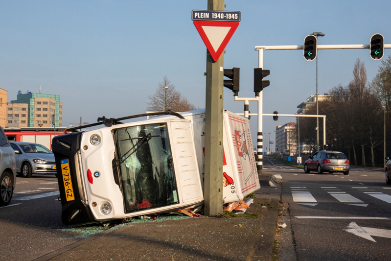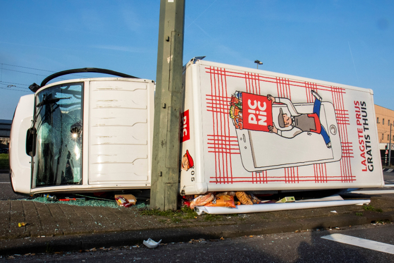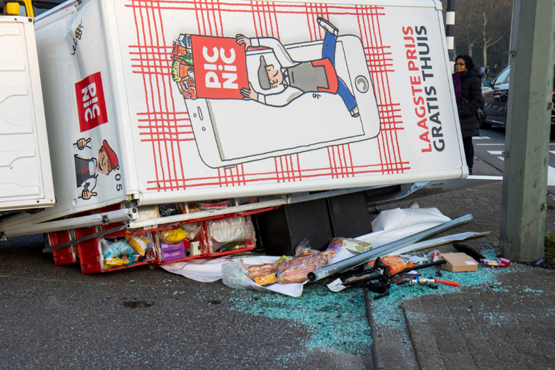 Schiedam – Op Plein 1940-1945 is vrijdagmiddag een bezorgwagen van Picnic gekanteld en tegen een lantaarnpaal aangekomen. Op het kruispunt met de ‘s-Gravelandseweg kantelde het smalle bezorgkarretje en kwam op zijn zijkant terecht. De bestuurder is ongedeerd uit het voertuig gekomen. Om de bezorgkar rechtop te kunnen krijgen is de weg richting de Parkweg tijdelijk afgesloten geweest. Dit gaf kortstondig een verkeerschaos. Juist op dat moment kreeg de brandweer een melding in Rotterdam en moest het drukke kruispunt passeren. Aanwezige agenten hebben net op tijd het kruispunt vrij kunnen maken. De boodschappen komen ‘iets later’.