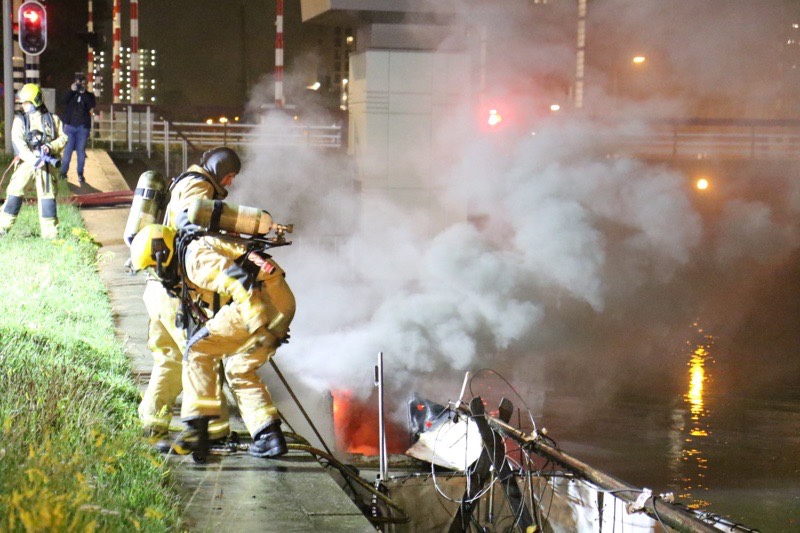 Plezierjacht vliegt in brand Neherkade Den Haag