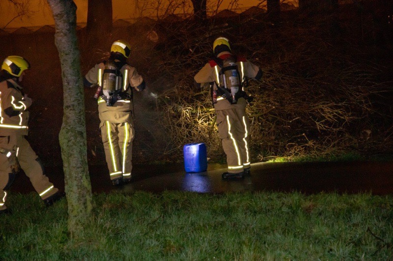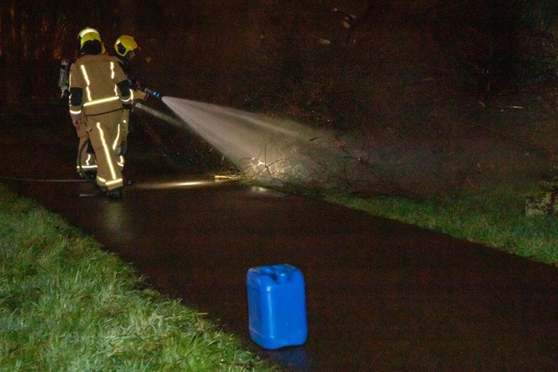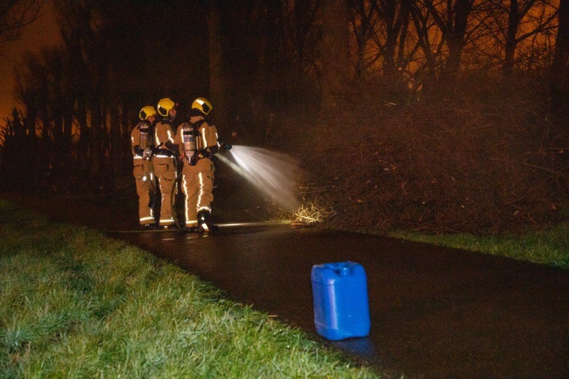 De jerrycan gevuld met benzine was niet tot ontbranding gekomen tussen het snoeihout. De brandweer heeft de jerrycan met benzine verwijderd en de takkenbossen met water nat gespoten om eventuele latere brandstichting verder uit te sluiten.