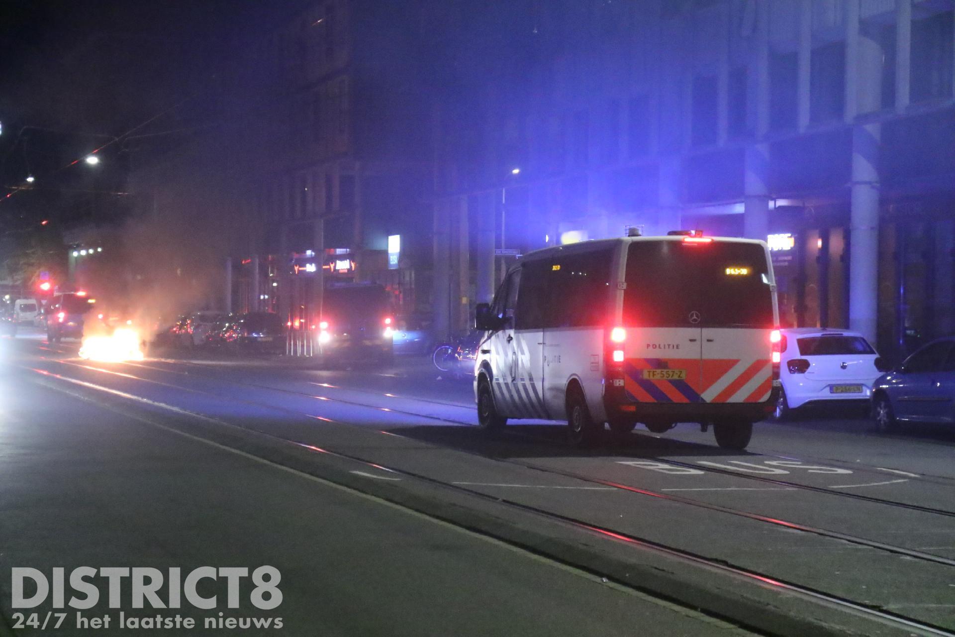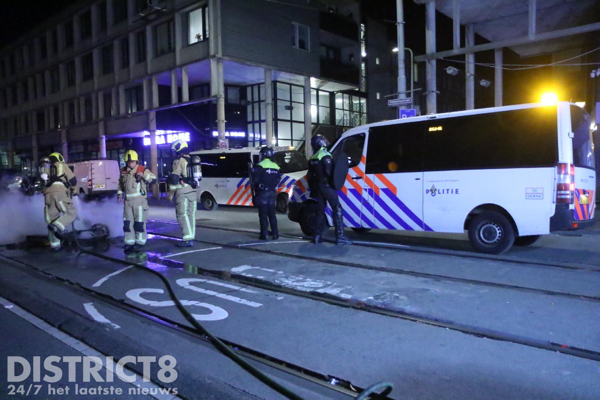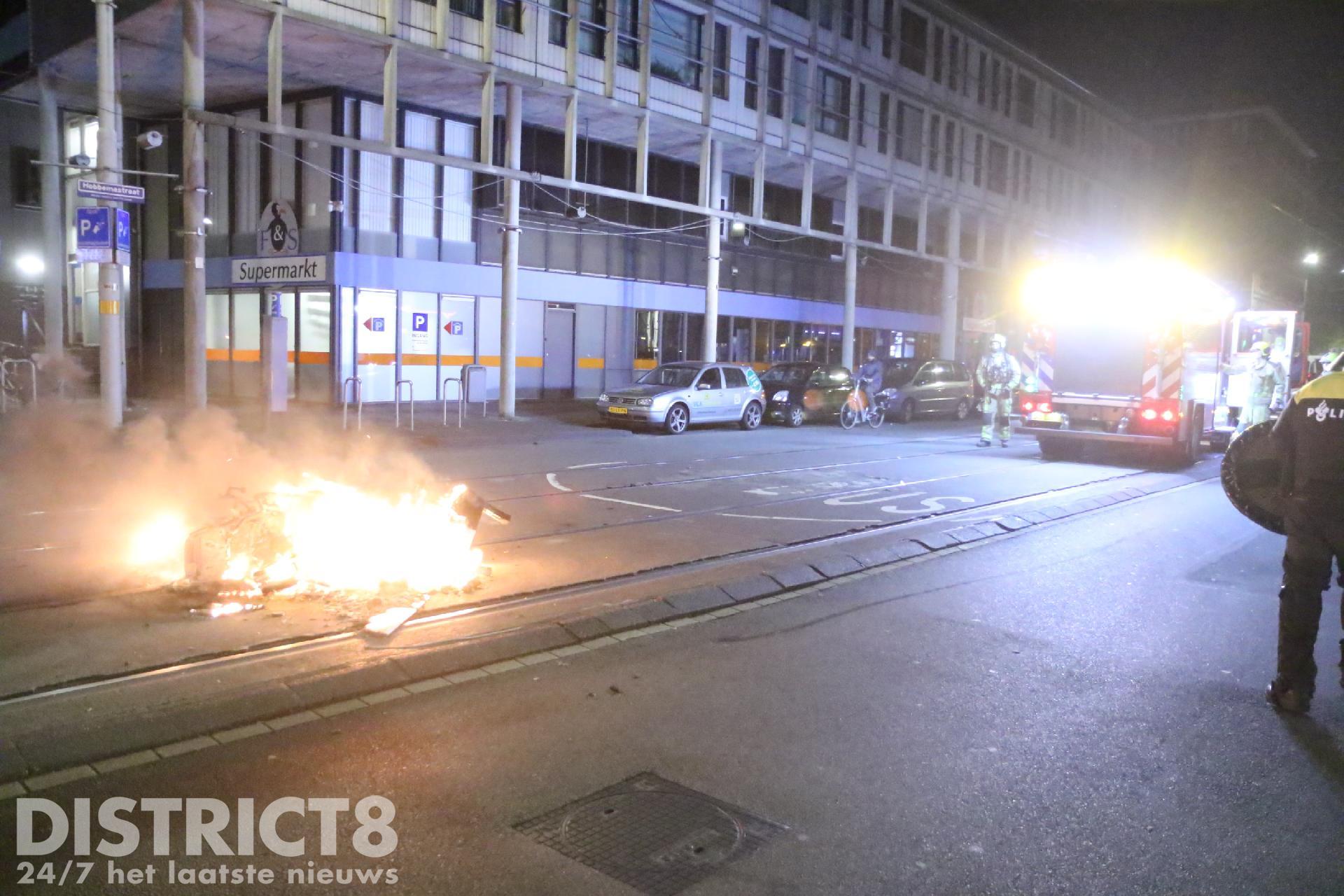 Op de Hobbemastraat was ook een scooter in het midden van de weg in brand gestoken. De brandweerlieden kwamen ter plaatse om de brandende scooter te blussen. De mobiele eenheid stond om de brandweer heen om een veilig werkgebied te creëren.