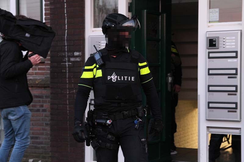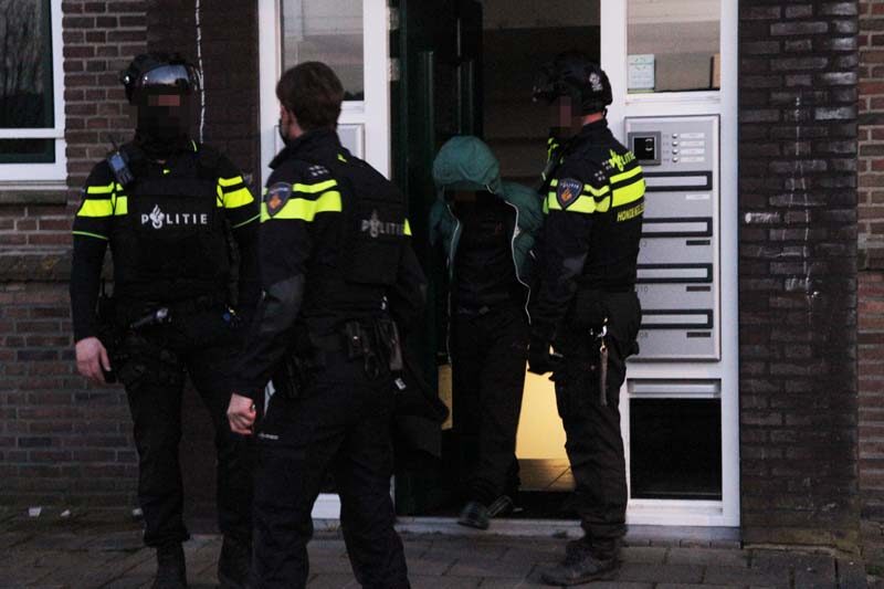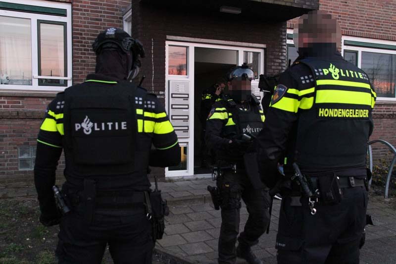 Meerdere agenten en hondengeleiders met zware vesten deden een inval in een woning. Bij de inval is één persoon aangehouden en overgebracht naar het politiebureau.
