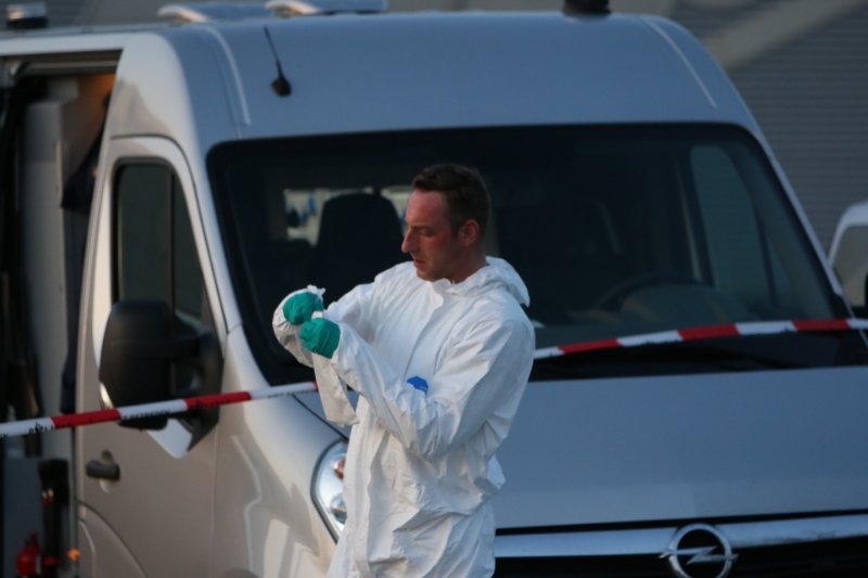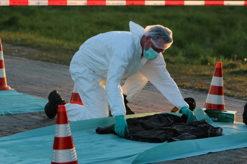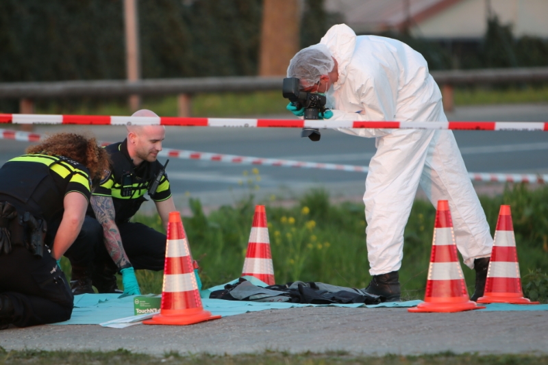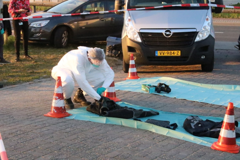 De medewerkers van de Forensische Opsporing dragen witte pakken, een klein gedeelte van de weg is afgezet voor het onderzoek.