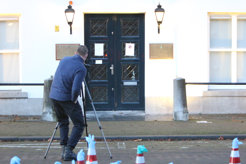 Agenten hebben op straat een Plaats Delict (PD) gemaakt. Op straat zijn meerdere hulzen te zien, in het pand van de ambassade zijn ook meerdere inslagen te zien in onder andere de ramen.