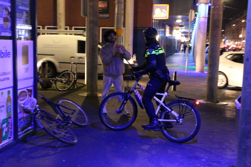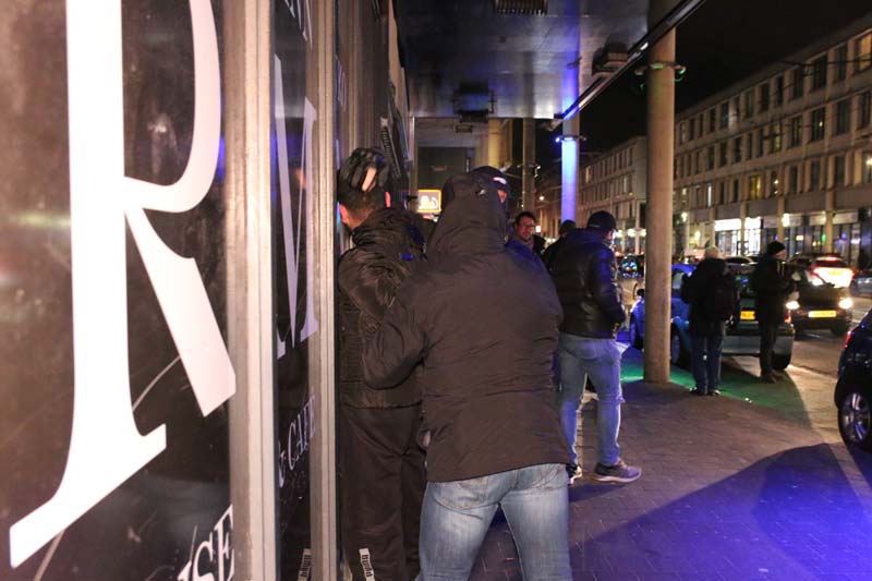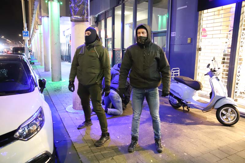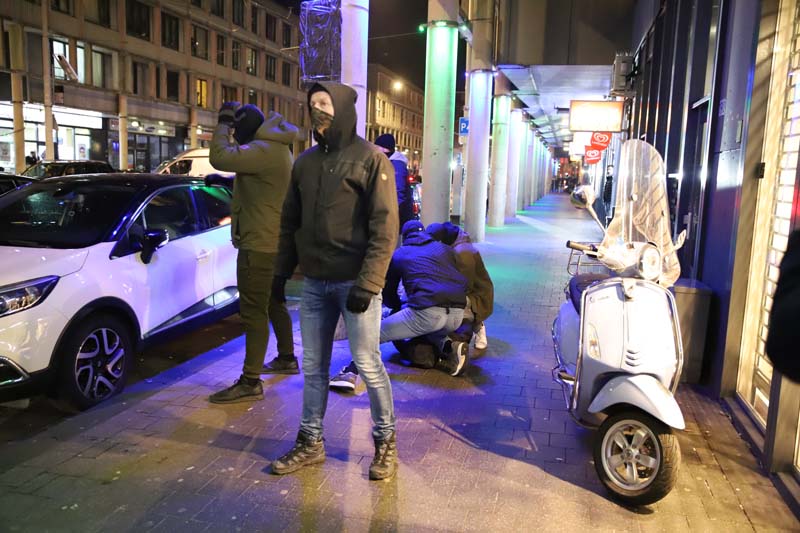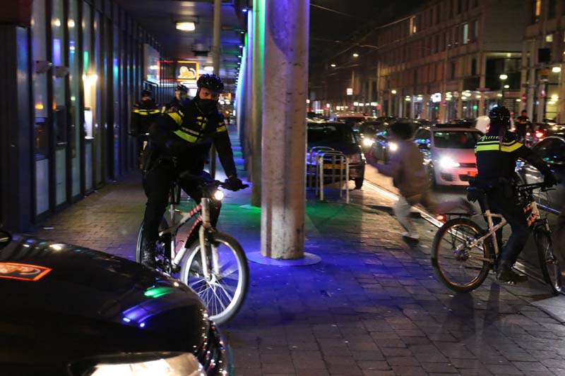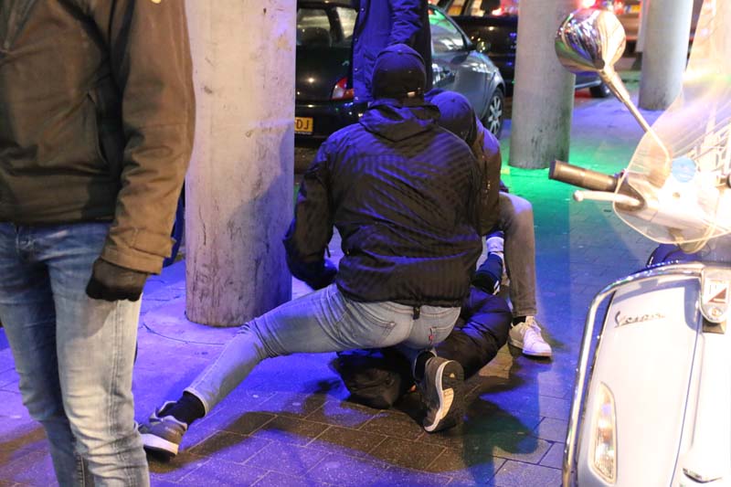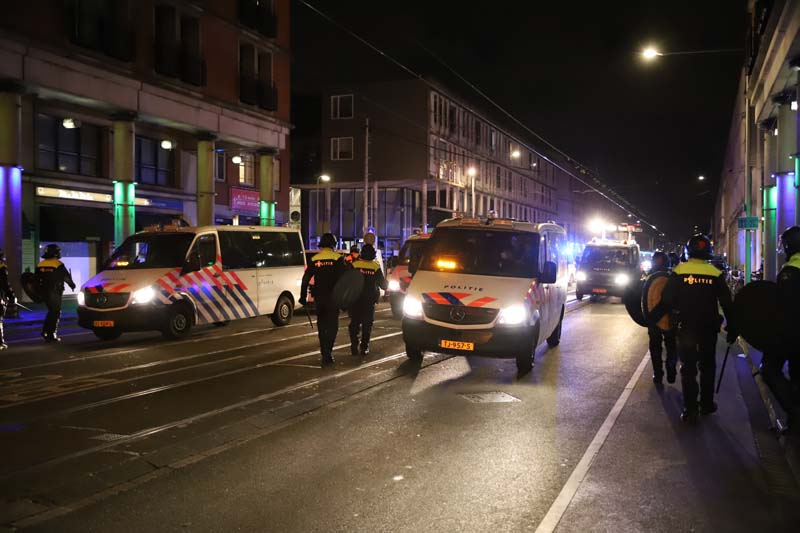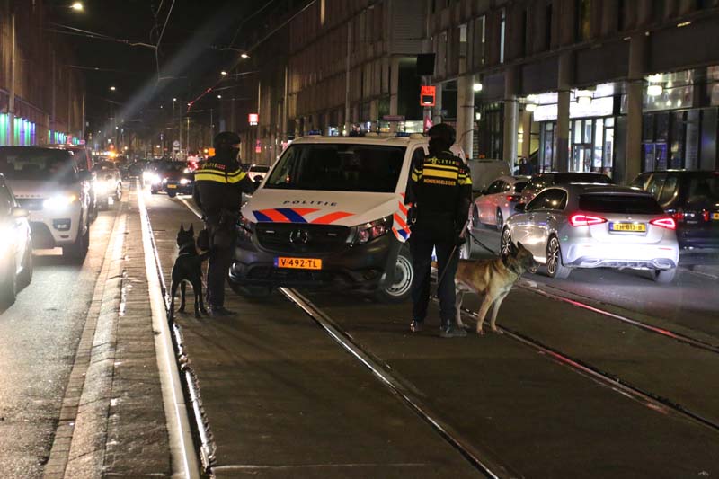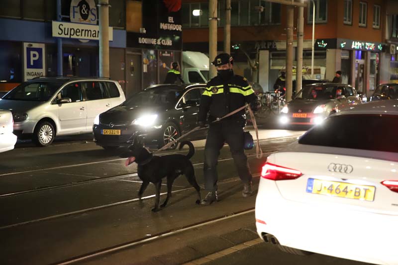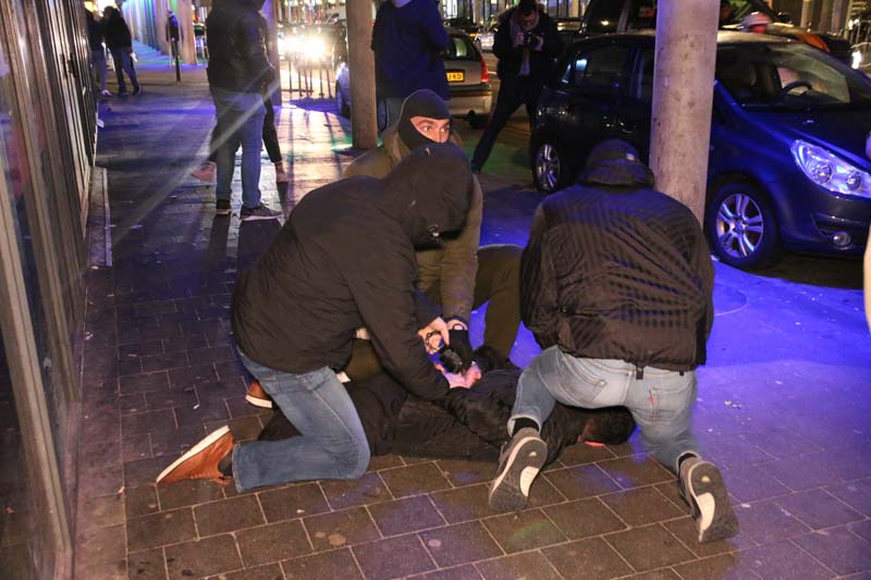 Op de Hobbemastraat heeft de politie twee personen aangehouden. Omstanders werden door de politie met wapenstokken weggehaald, ook de hondengeleiders waren met hun hond aanwezig in de omgeving.