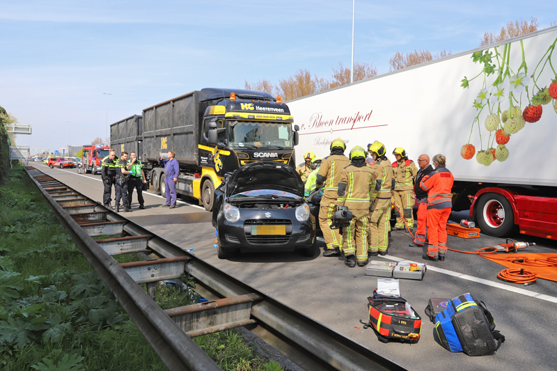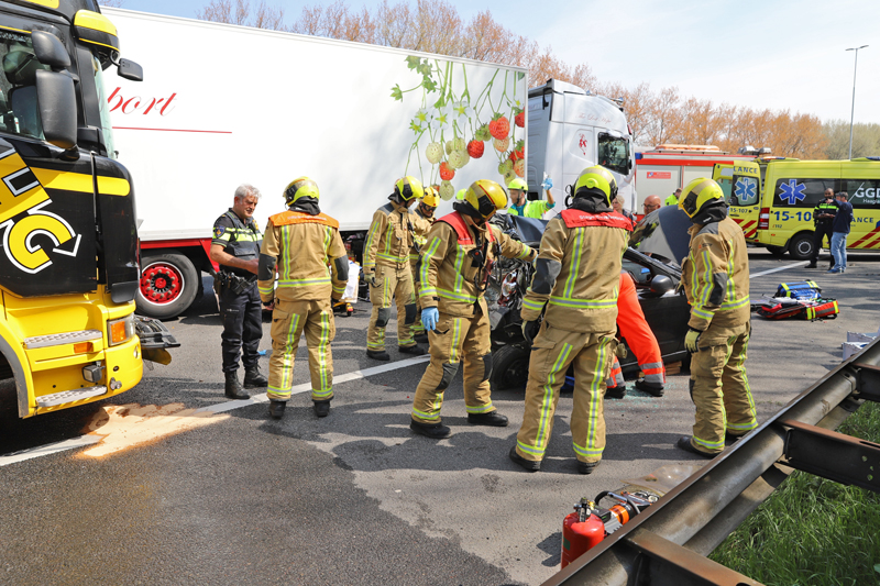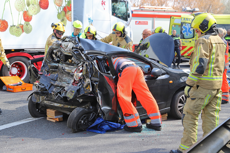 Het zeil (zie onderstaande foto) belandde rond 14.25 uur onder een auto op de rechter rijstrook. Hierdoor ontstond een ernstige aanrijding met een vrachtwagen.