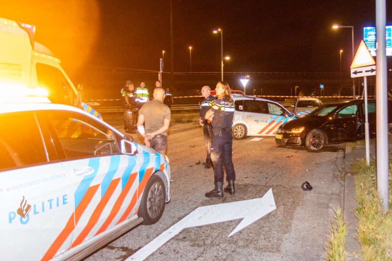 Op het Kleinpolderplein in Rotterdam wilde de vluchtende bestuurder de afrit van de A20 op rijden, tegen het verkeer in. Hier kwam de vluchtauto in botsing met een hondenwagen van de politie.