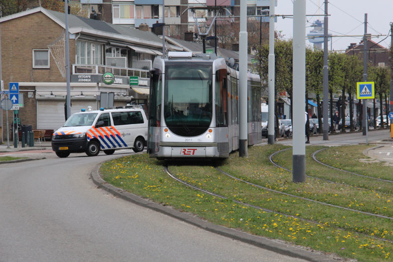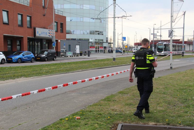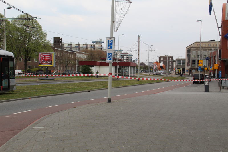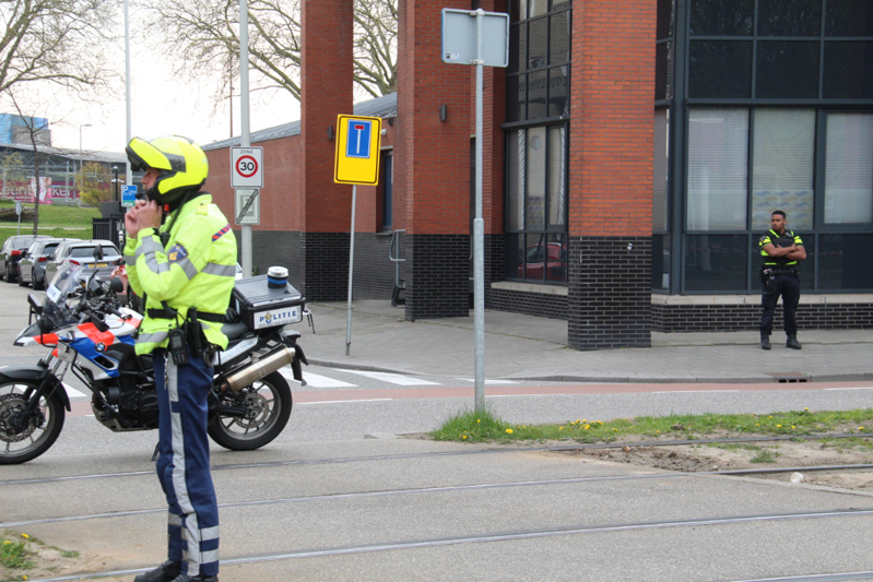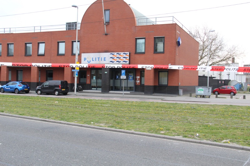 Ook de omgeving is groots afgezet. Auto’s, scooters, fietsers, voetgangers en trams mogen niet meer over de Schiedamseweg voor het politiebureau langs.