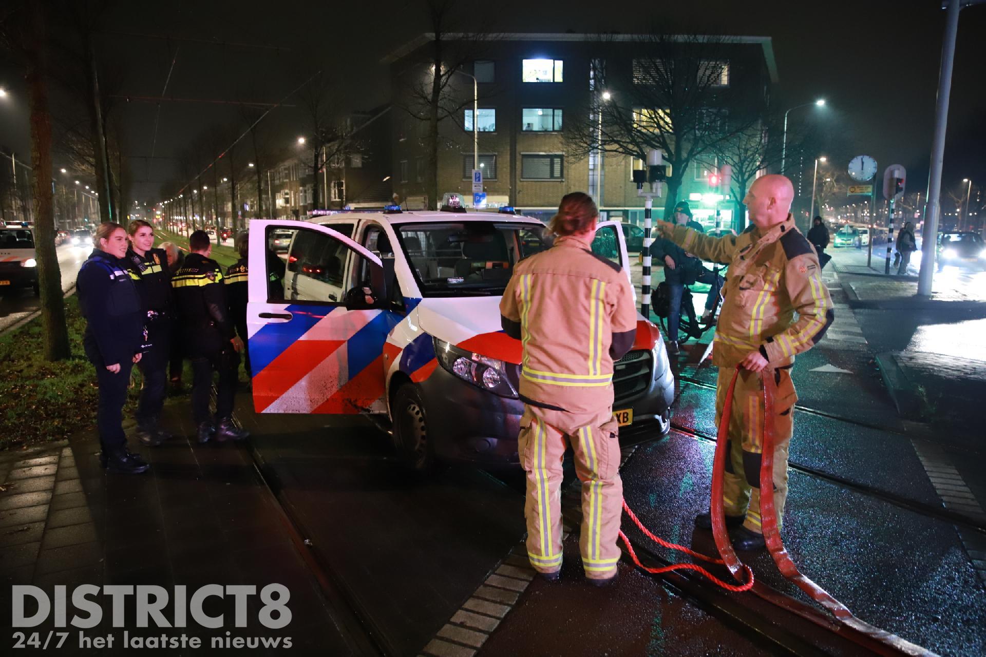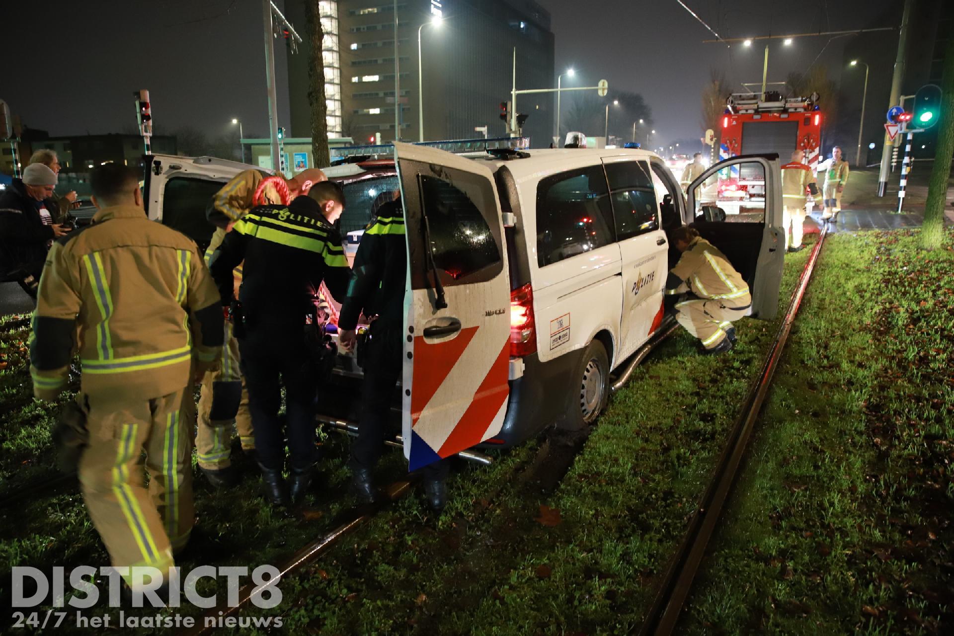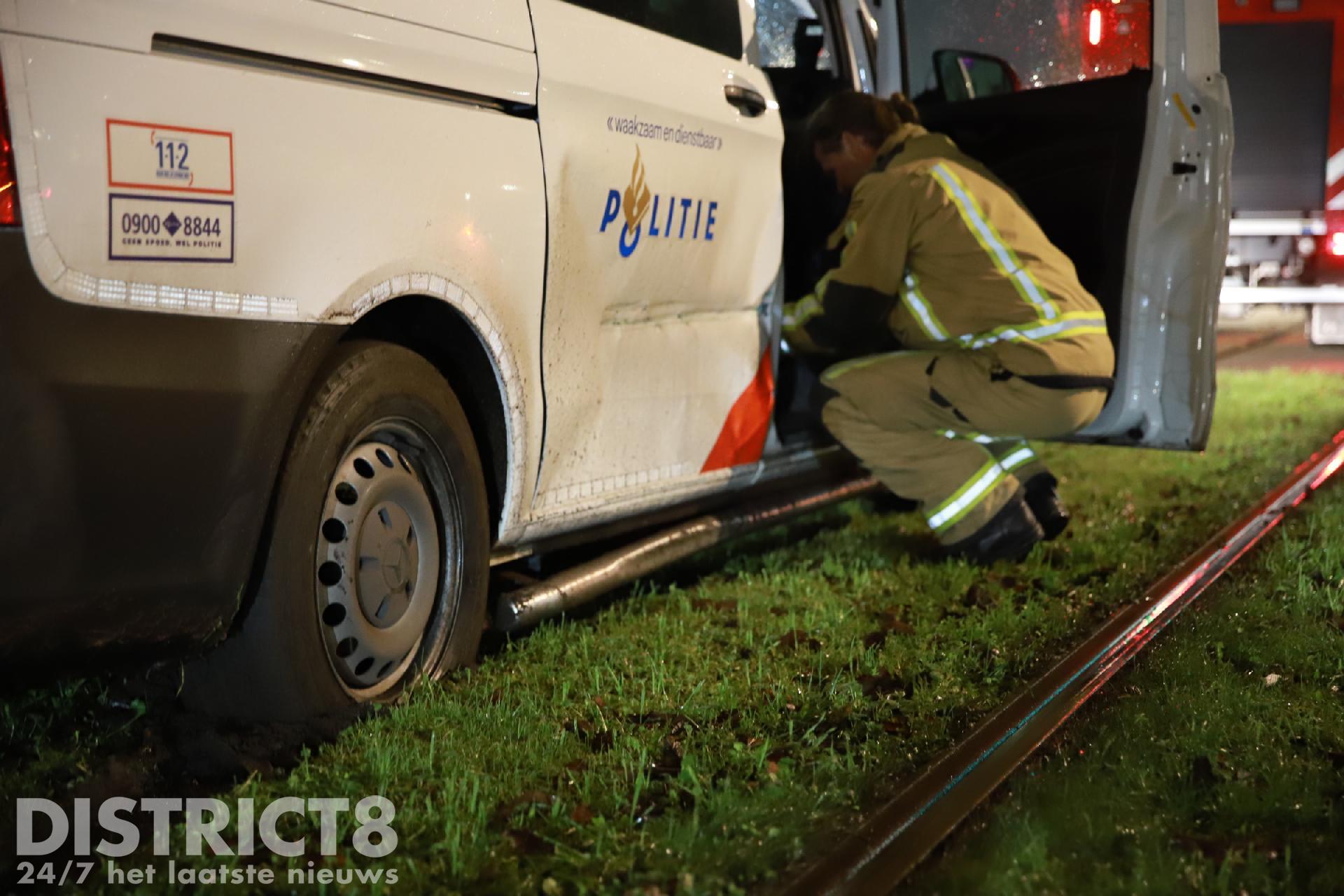 Een politiebusje die met spoed onderweg was naar de melding, had zich vastgereden op de trambaan aan de Melis Stokelaan. De brandweer heeft met een creatieve oplossing het busje van de trambaan gekregen. Met onder andere een slang, vastgemaakt aan de tankautospuit is het busje uit het gras getrokken.